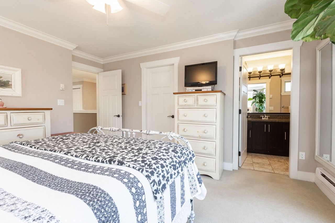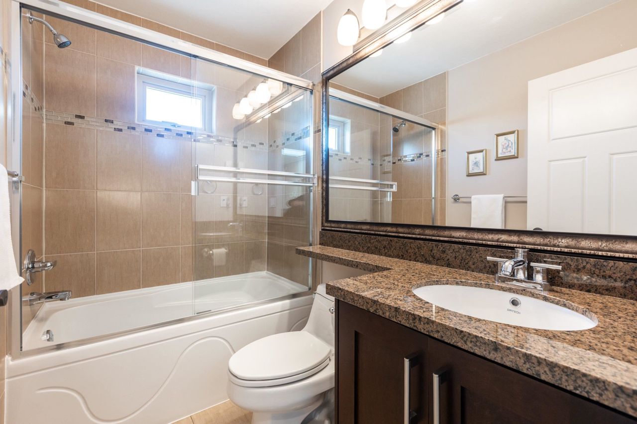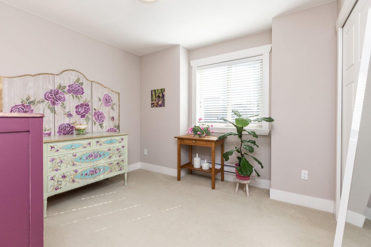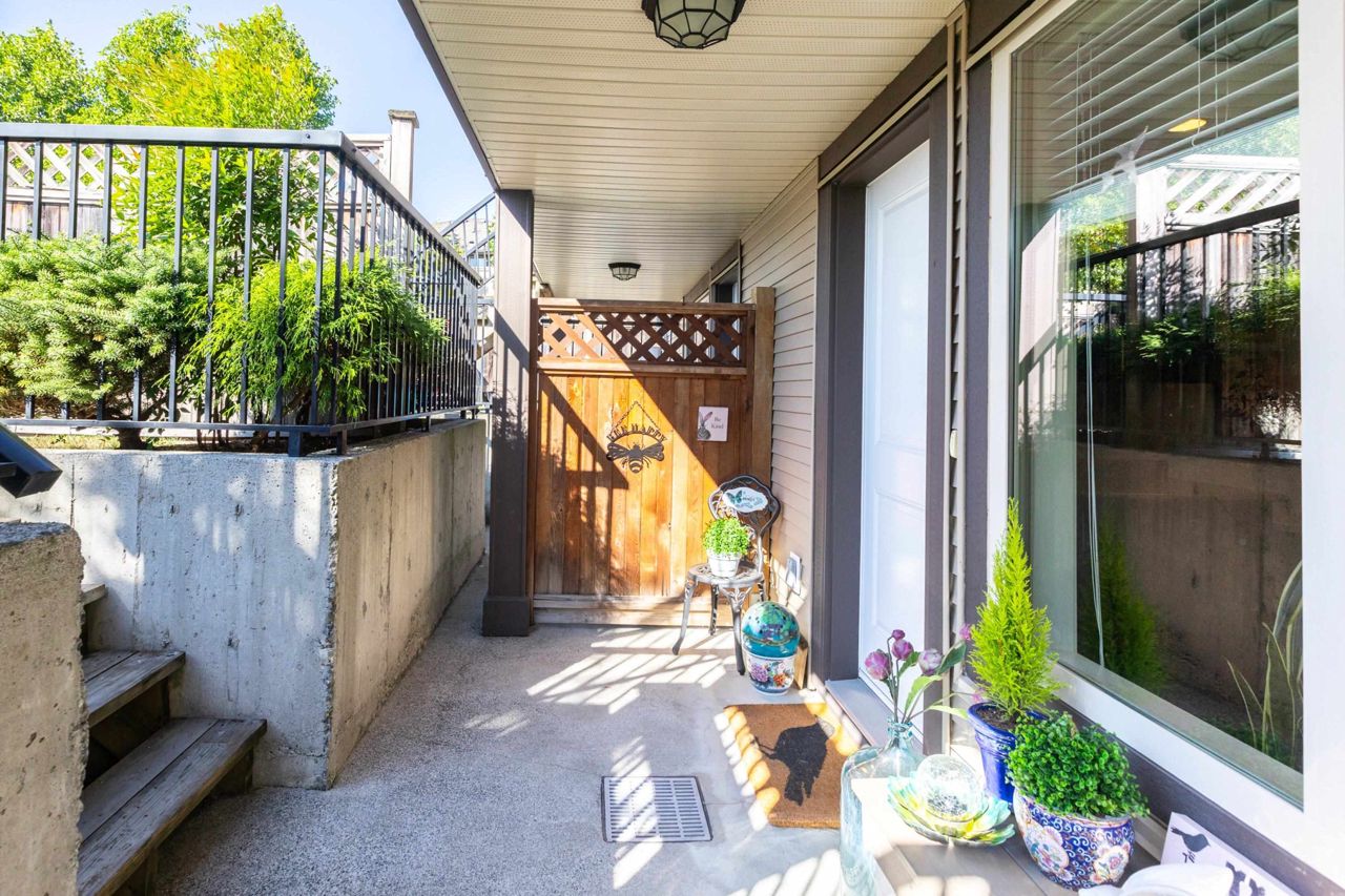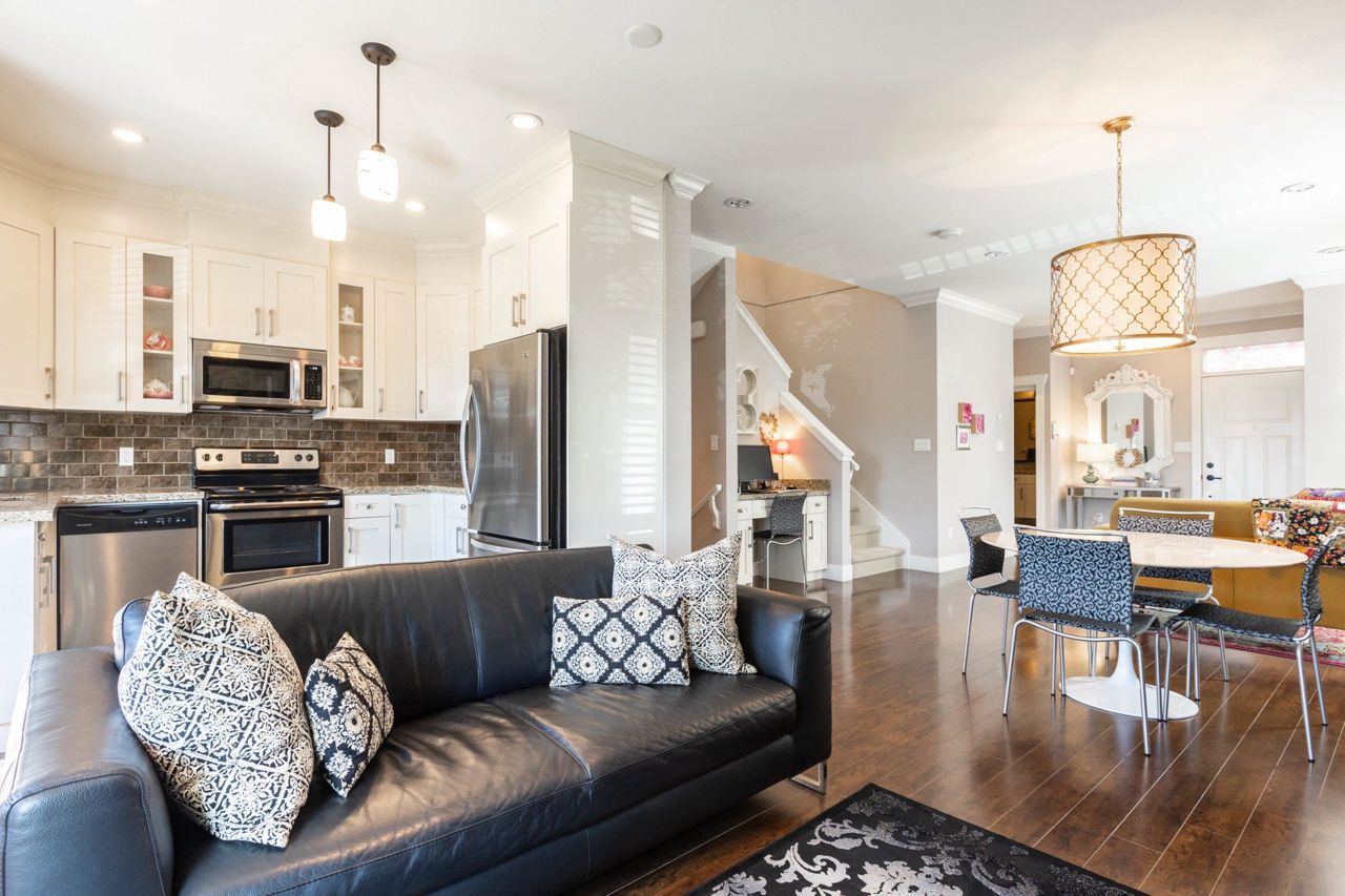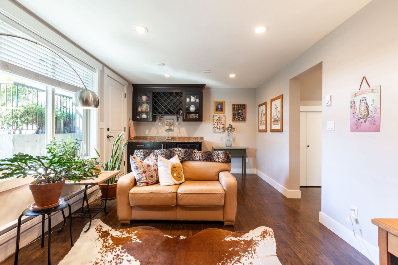 FANTASTIC VALUE! PORTER’S COVE! STUNNING DUPLEX style end unit With HUGE wraparound yard & partly covered multi-tied patio. Bright & spacious open plan. 4 bedrms, 4 bathrms (3 with deep soaker tubs) & 9’ ceilings. Built-in speakers on main & wired for surround sound & home theatre in basement. Living rm w/fireplace open dining rm, family rm & GOURMET kitchen w/SS appliances, granite counters & access to yard. 3 large bedrms up – master w/walkin closet, full ensuite & balcony for morning coffee or evening wine. Fully finished basement w/large windows, sep entry, own covered patio, bathrm, bedrm & large games rm w/wet bar. Fantastic complex minutes to everything. 1 pet. Rentals allowed. Regent Christian School & Pacific Life Bible Collage just steps away.