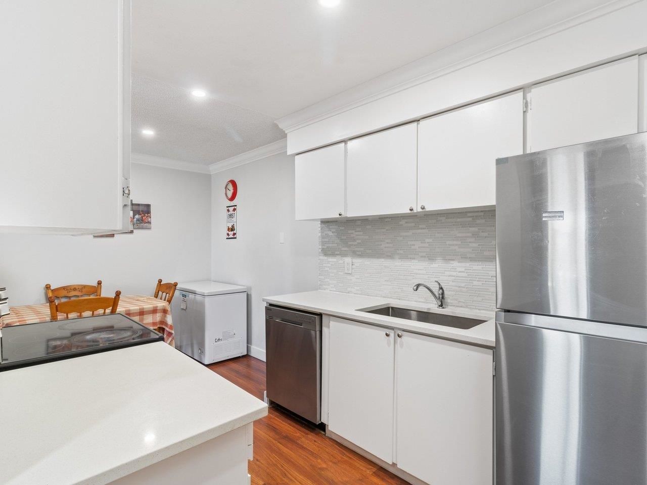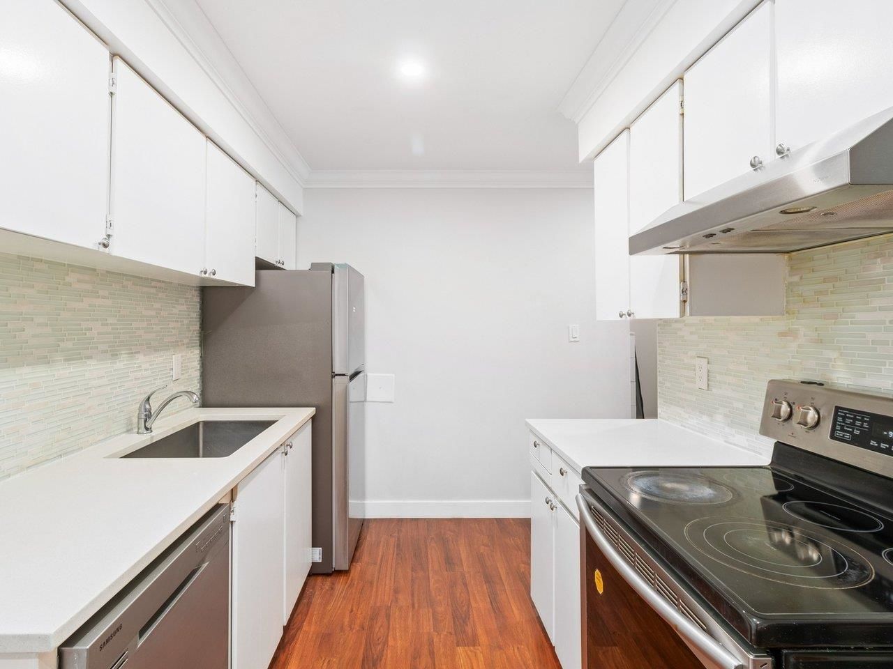 Location!Location! Spacious 2 bedroom, 1 bathroom and 1 parking condo. The Primary bedroom is huge, renovated kitchen with quarts countertop, stainless steel appliances, crown moulding throughout, good size storage space and renovated bathroom. Centrally located in the center of Guildford area where everything is a short drive or within walking distance--bus stop, shopping, restaurants and schools! Come and see it for yourself! Rentals allowed.
