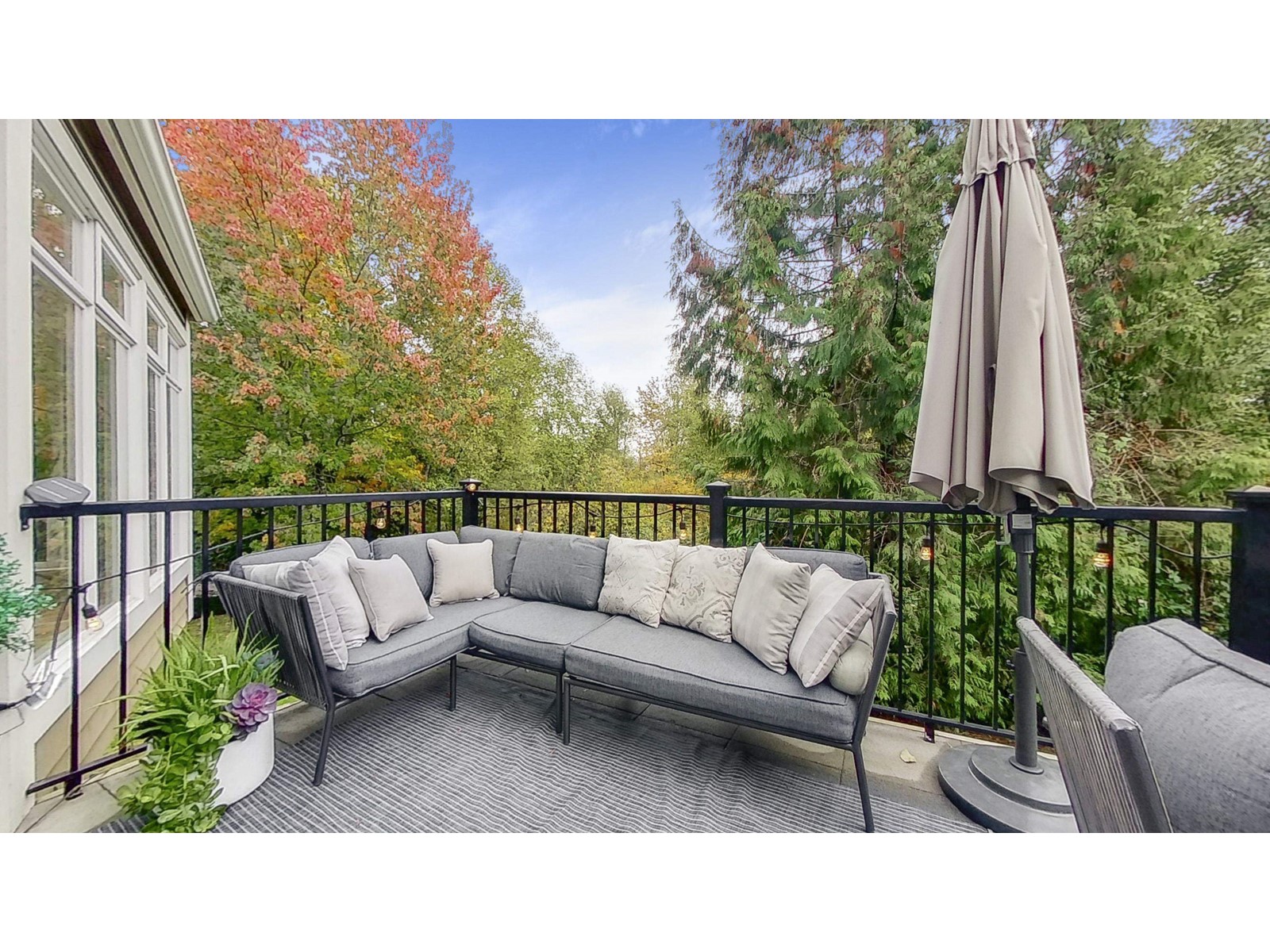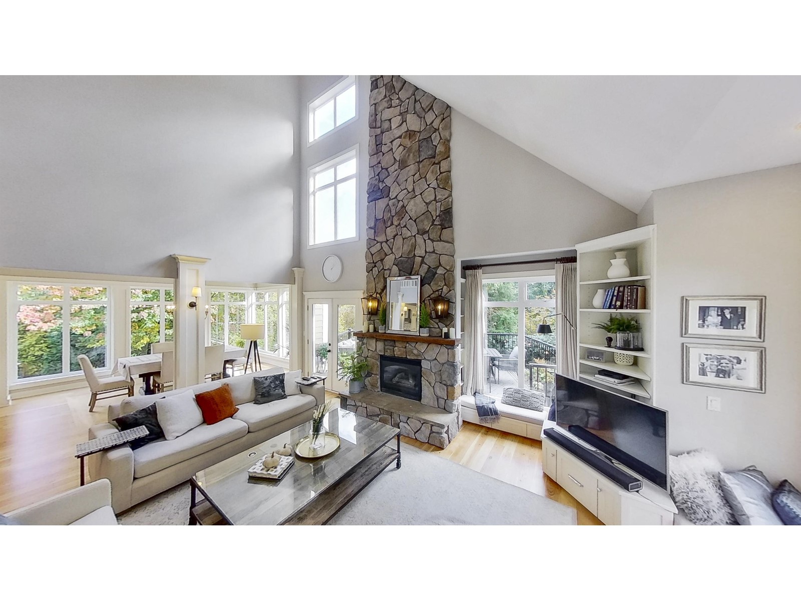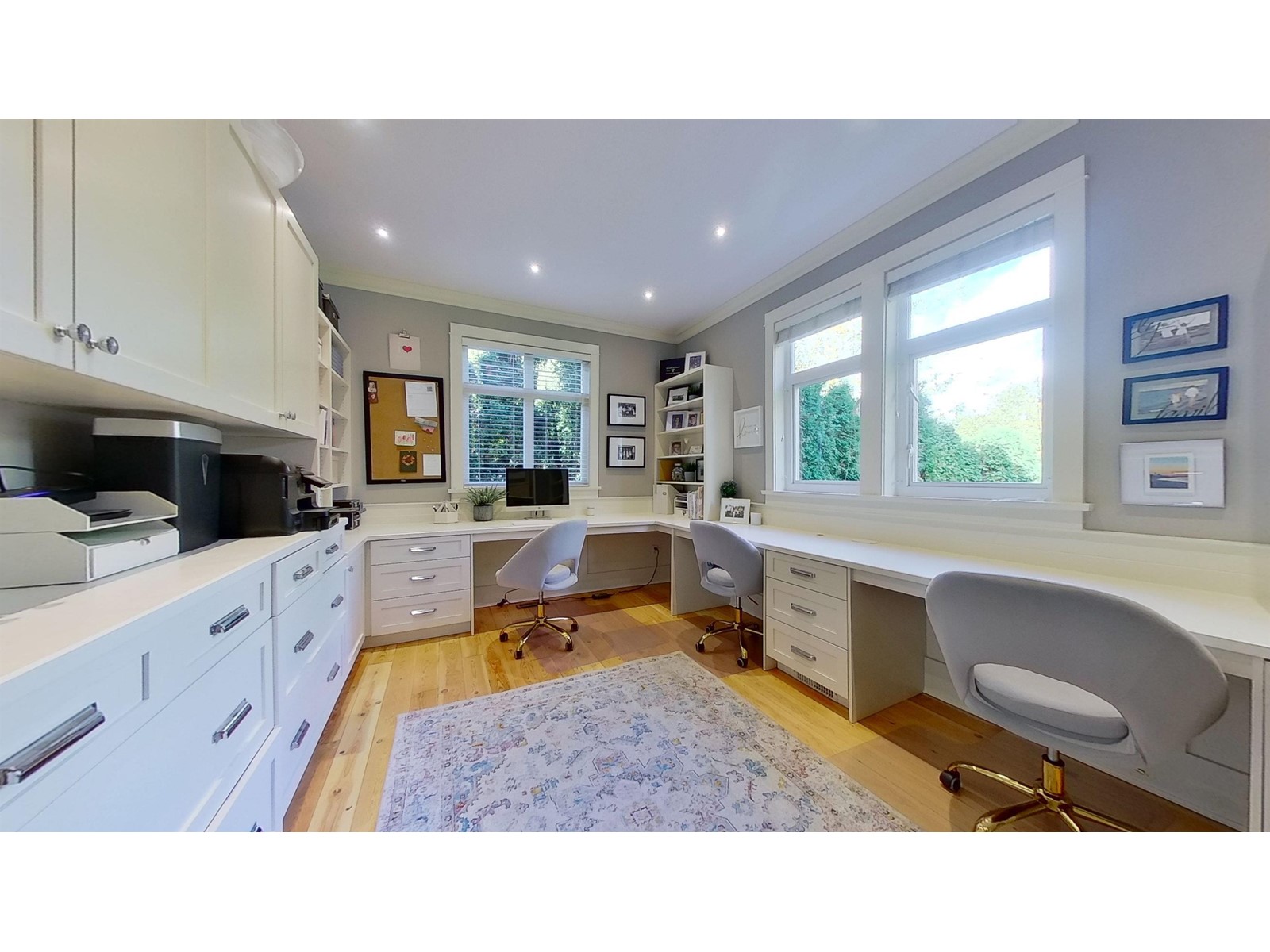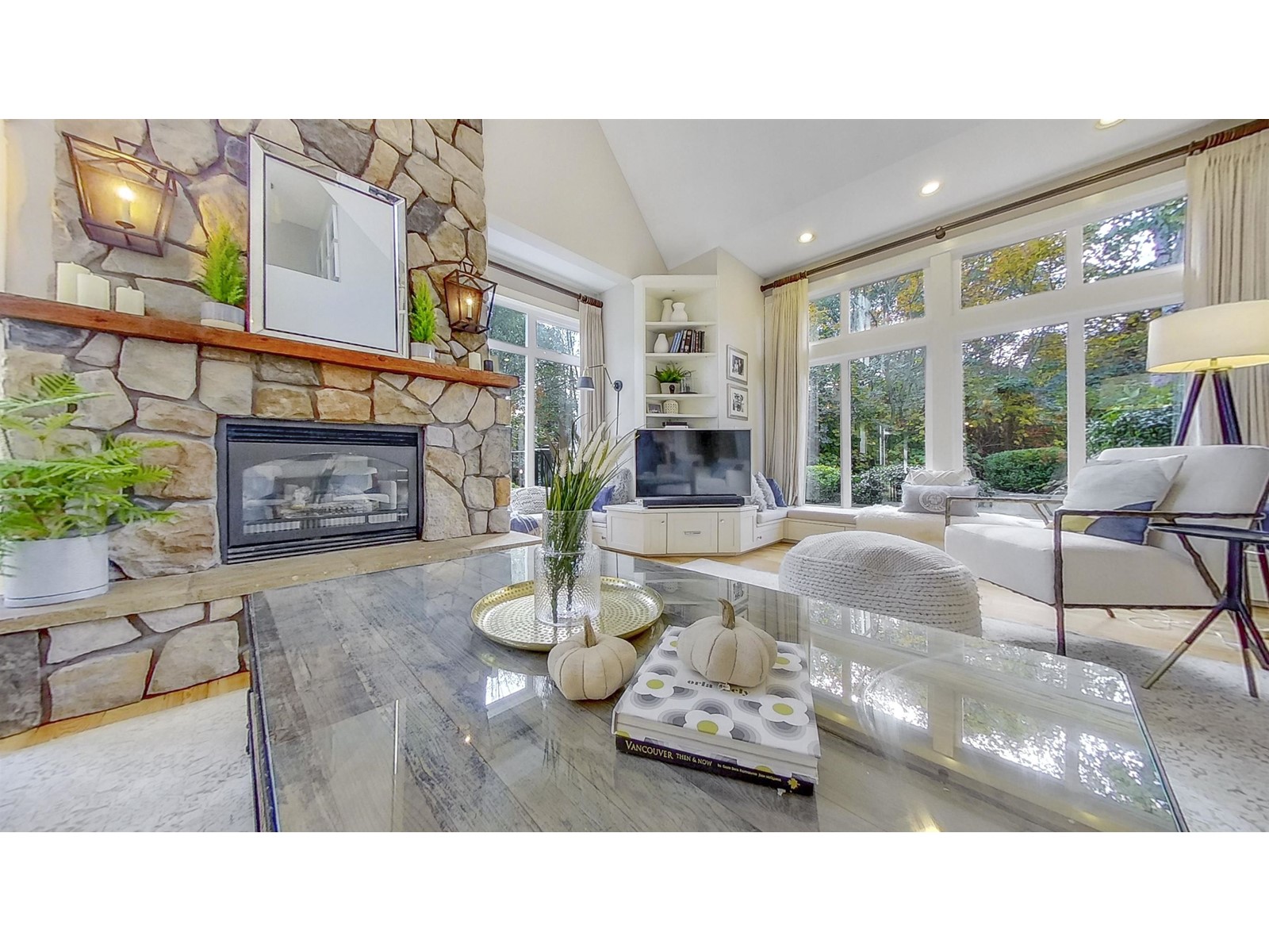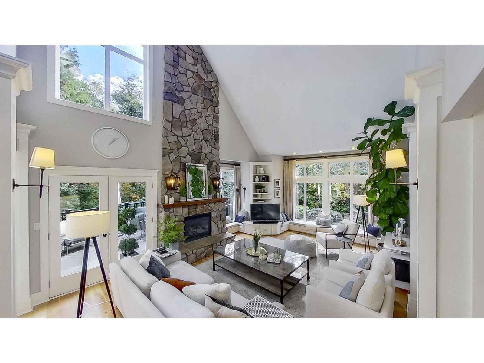 Extraordinary, custom-built luxury home, tucked away on cul de sac within private 1/4+ acre lot. Expansive living room featuring vaulted ceilings, stone gas fireplace & cozy window seats. Adjoining are the dining room & gourmet kitchen w modern appliances, all surrounded by full-length windows w serene green belt views. Main floor w 3 workstation office w built-ins & spacious deck. Upper level welcomes you w seating area overlooking living room. Primary suite offers concealed motorized TV lift, built-in vanity & gas fireplace. Ensuite boasts built-ins, skylights, under-vanity lighting & heated floors. Floor complete w 3 more bedrooms, an additional bathroom & convenient laundry chute. The walkout basement, easily converted into a suite, features 2 bedrooms, a bathroom & sizeable rec room. Enjoy attached double garage w EV charger, storage shed & extra RV parking. Home is within walking distance to Pacific Academy & has newly refinished original fir floors, as well as new A/C & furnace system. (id:22211)