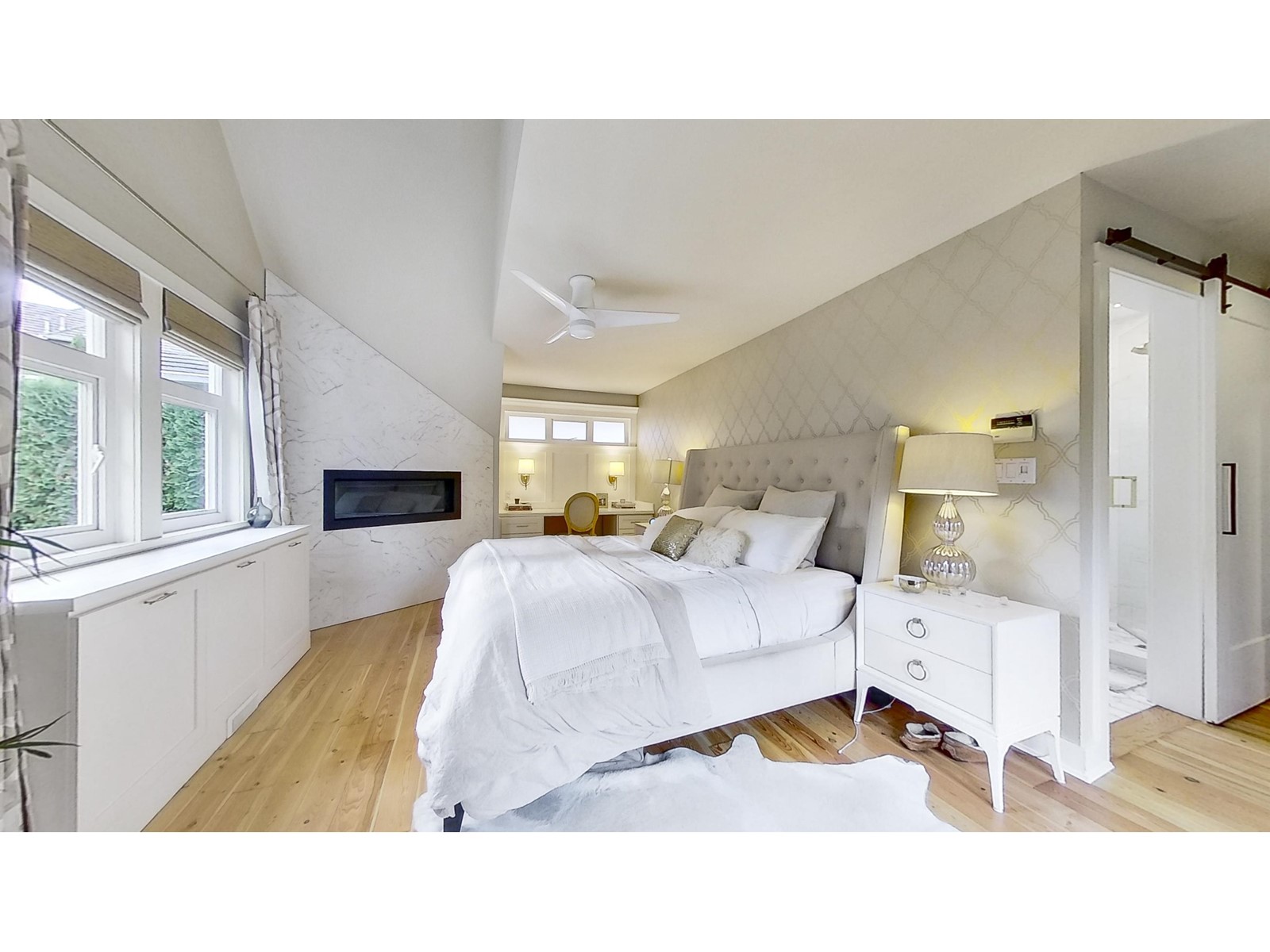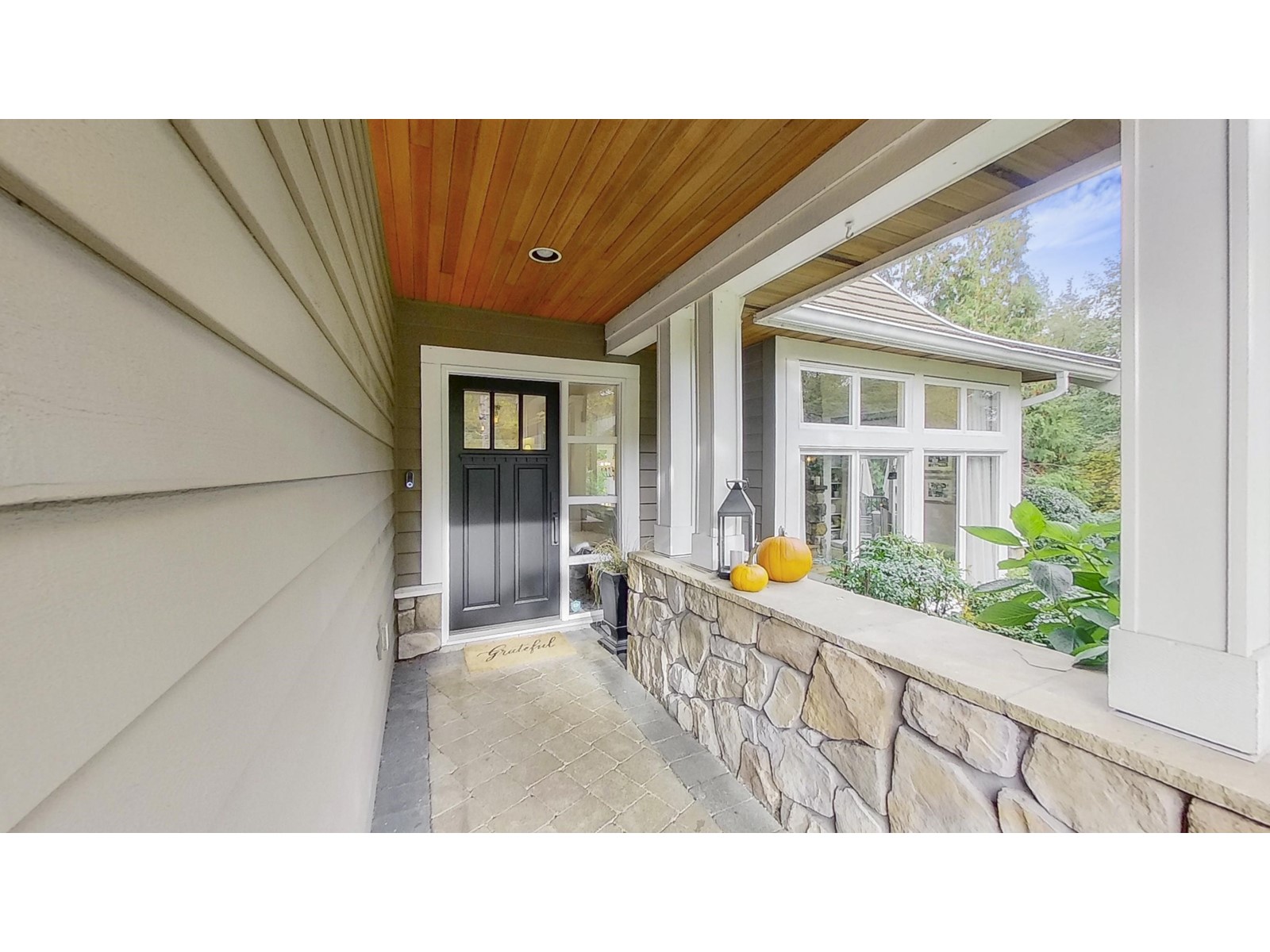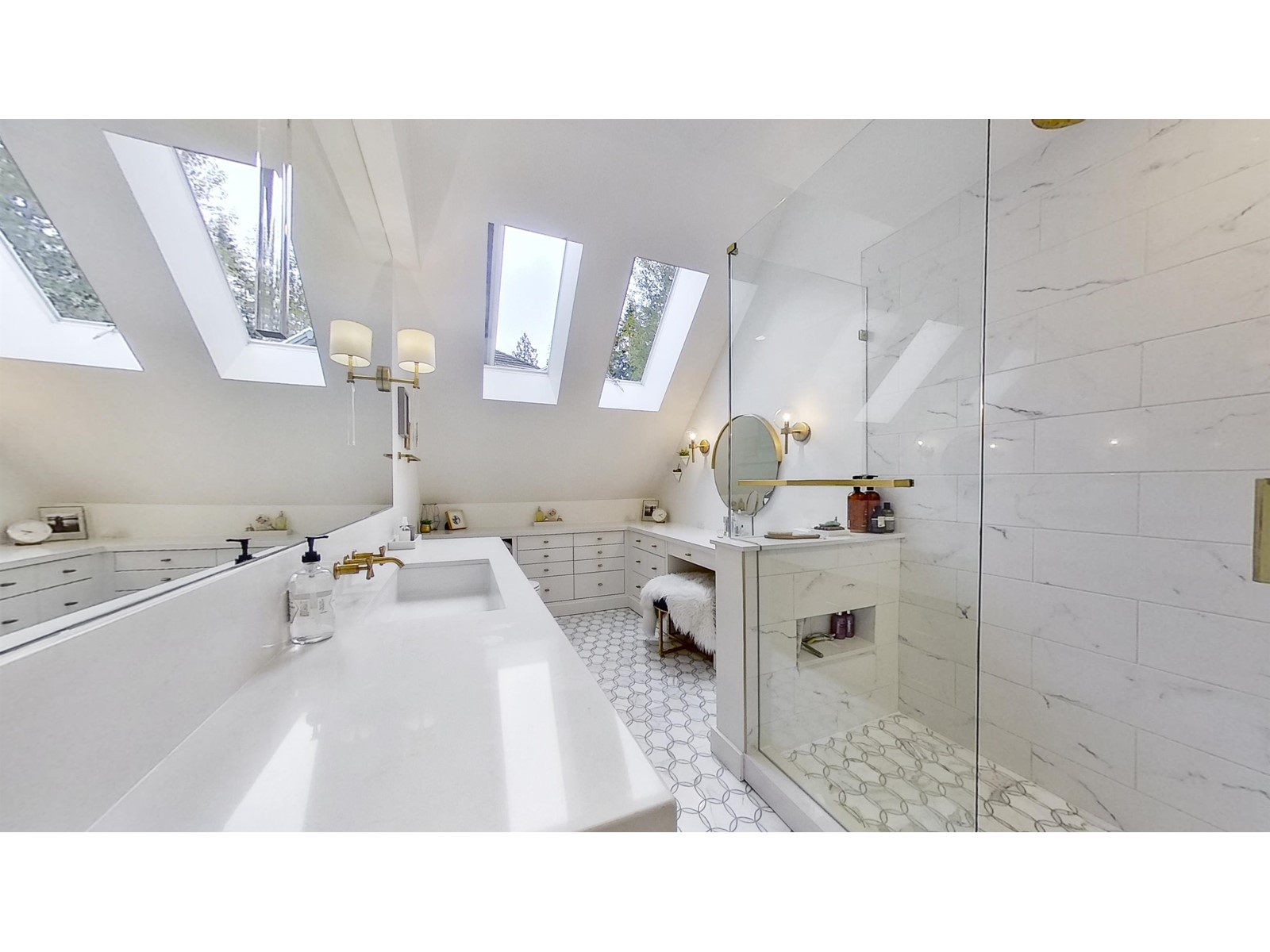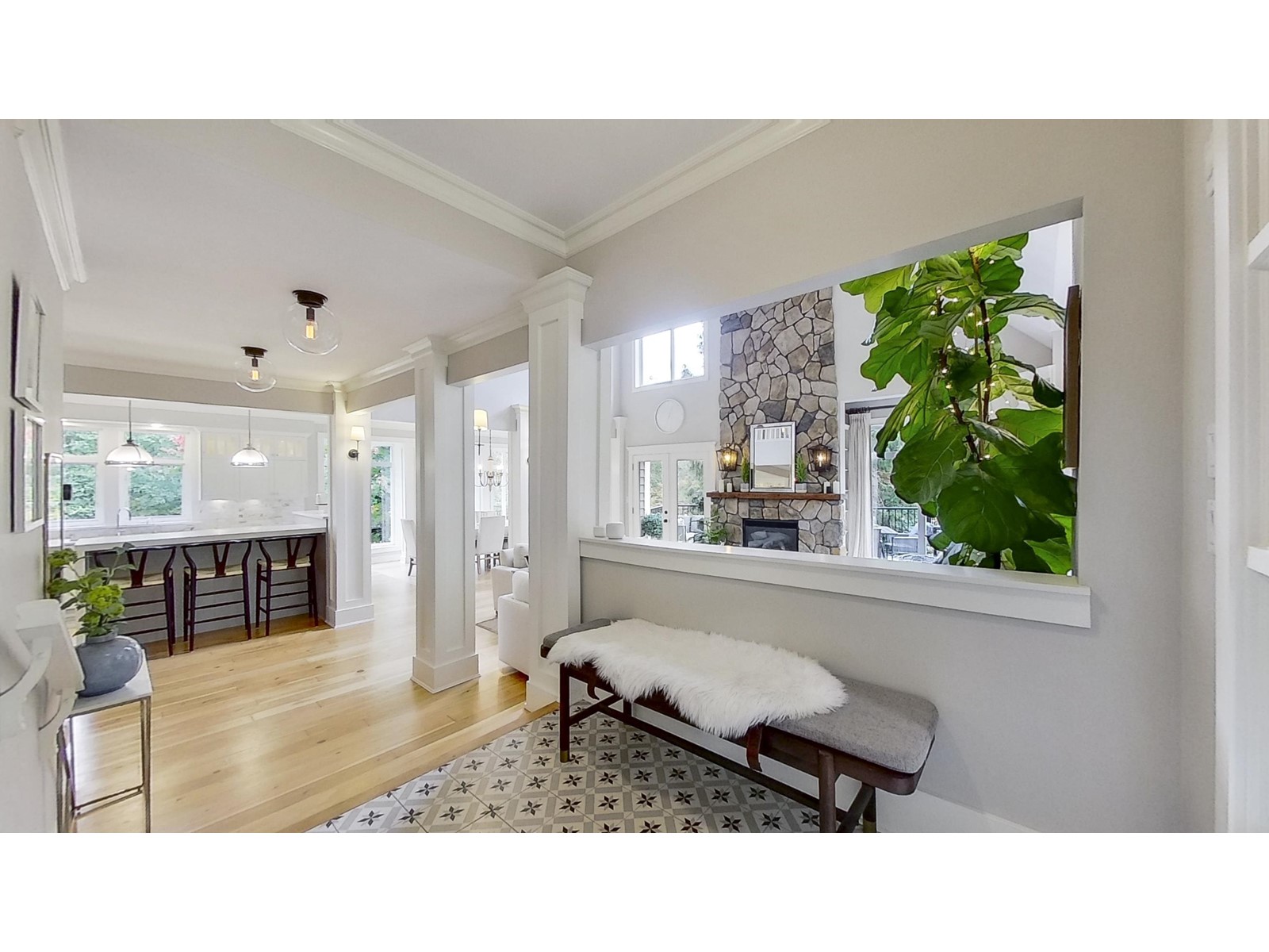 Extraordinary, custom-built luxury home, tucked away on cul de sac within private 1/4+ acre lot. Expansive living room featuring vaulted ceilings, stone gas fireplace & cozy window seats. Adjoining are the dining room & gourmet kitchen w modern appliances, all surrounded by full-length windows w serene green belt views. Main floor w 3 workstation office w built-ins & spacious deck. Upper level welcomes you w seating area overlooking living room. Primary suite offers concealed motorized TV lift, built-in vanity & gas fireplace. Ensuite boasts built-ins, skylights, under-vanity lighting & heated floors. Floor complete w 3 more bedrooms, an additional bathroom & convenient laundry chute. The walkout basement, easily converted into a suite, features 2 bedrooms, a bathroom & sizeable rec room. Enjoy attached double garage w EV charger, storage shed & extra RV parking. Home is within walking distance to Pacific Academy & has newly refinished original fir floors, as well as new A/C & furnace system. (id:22211)