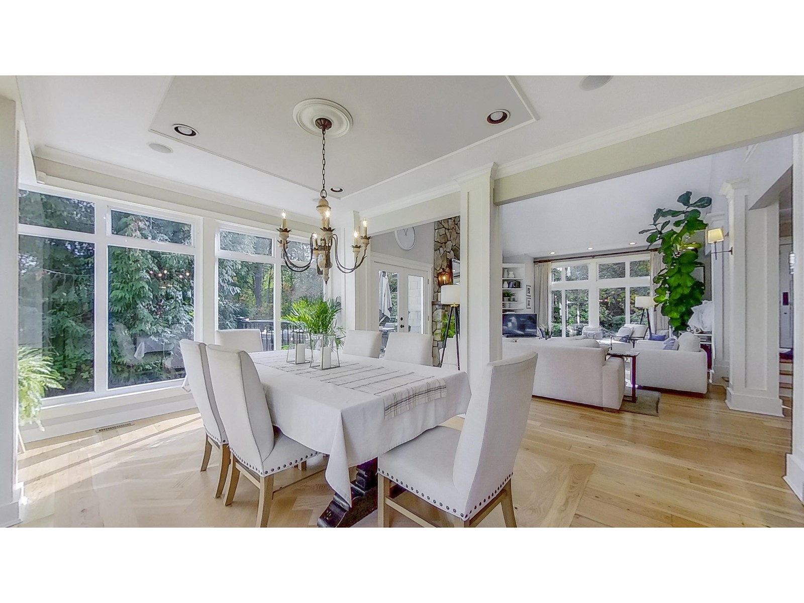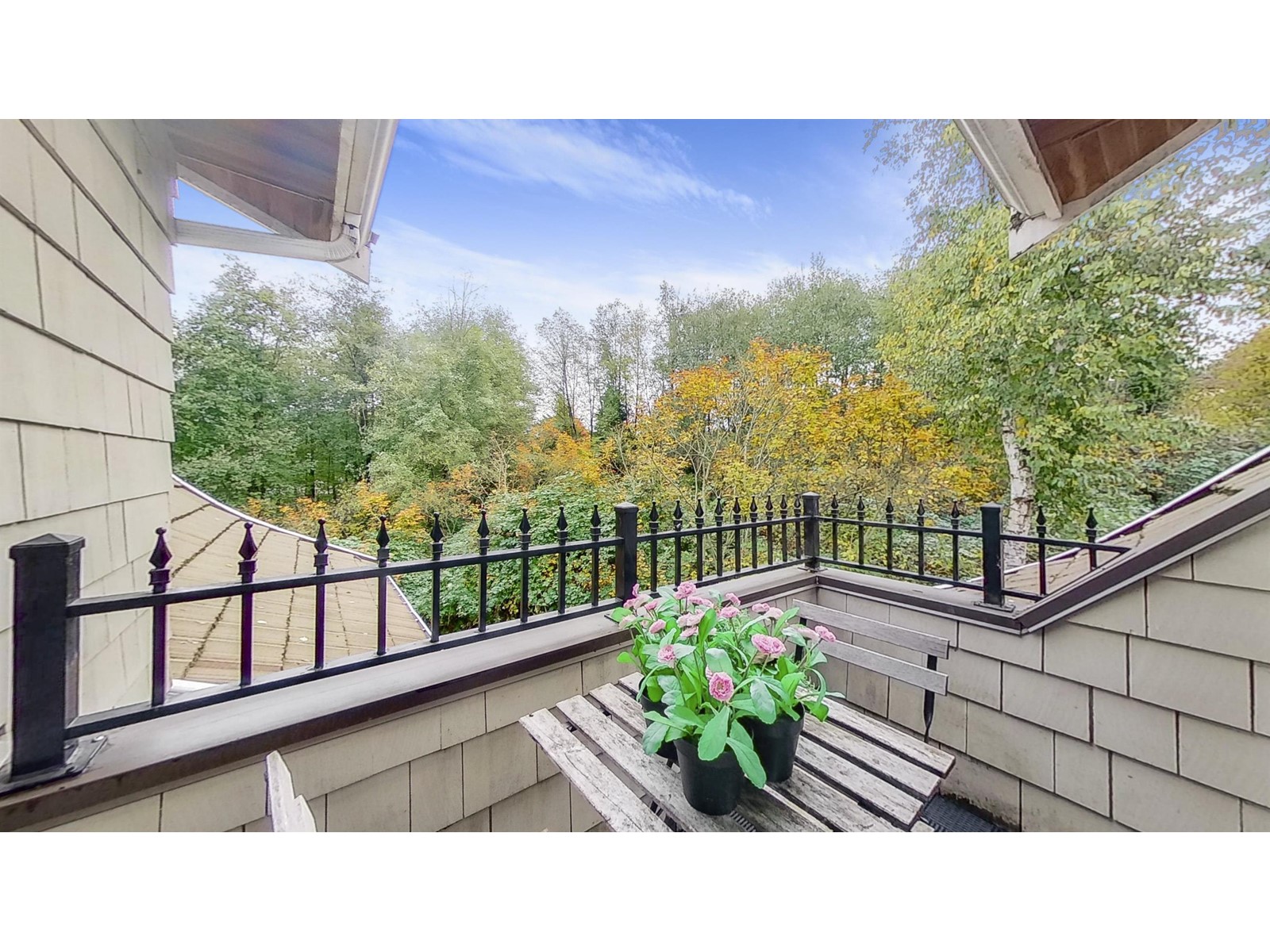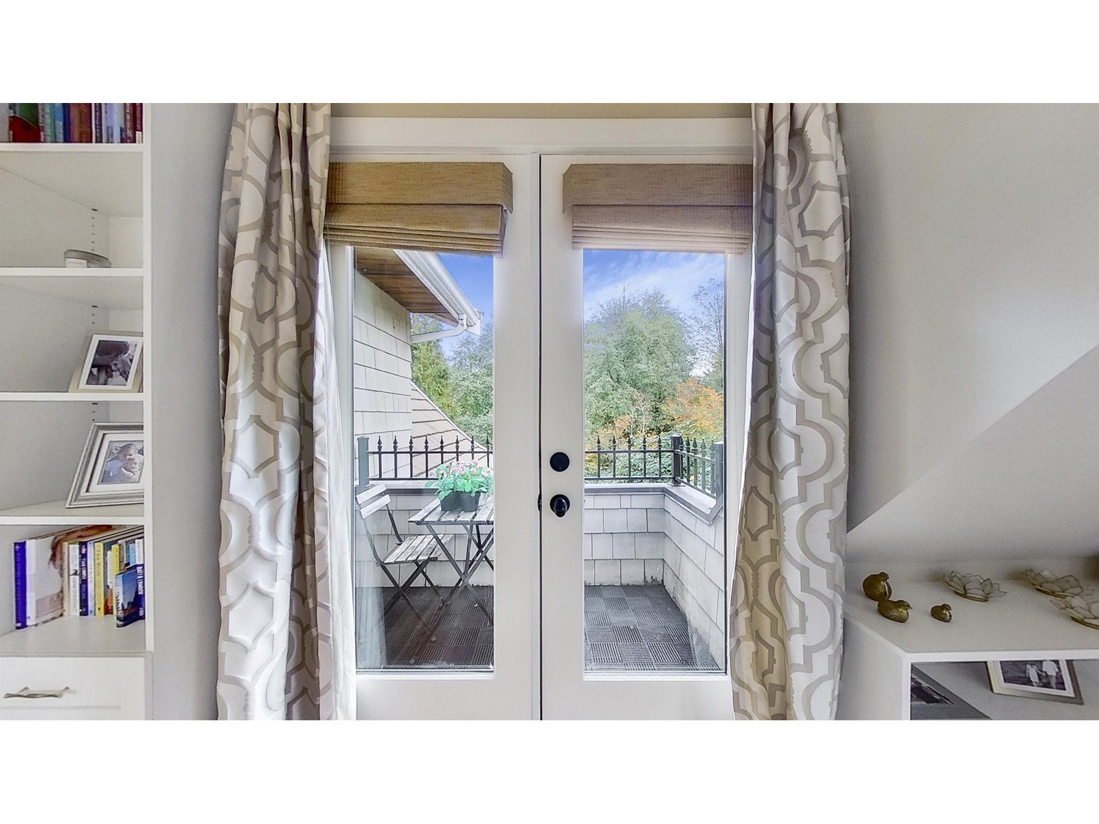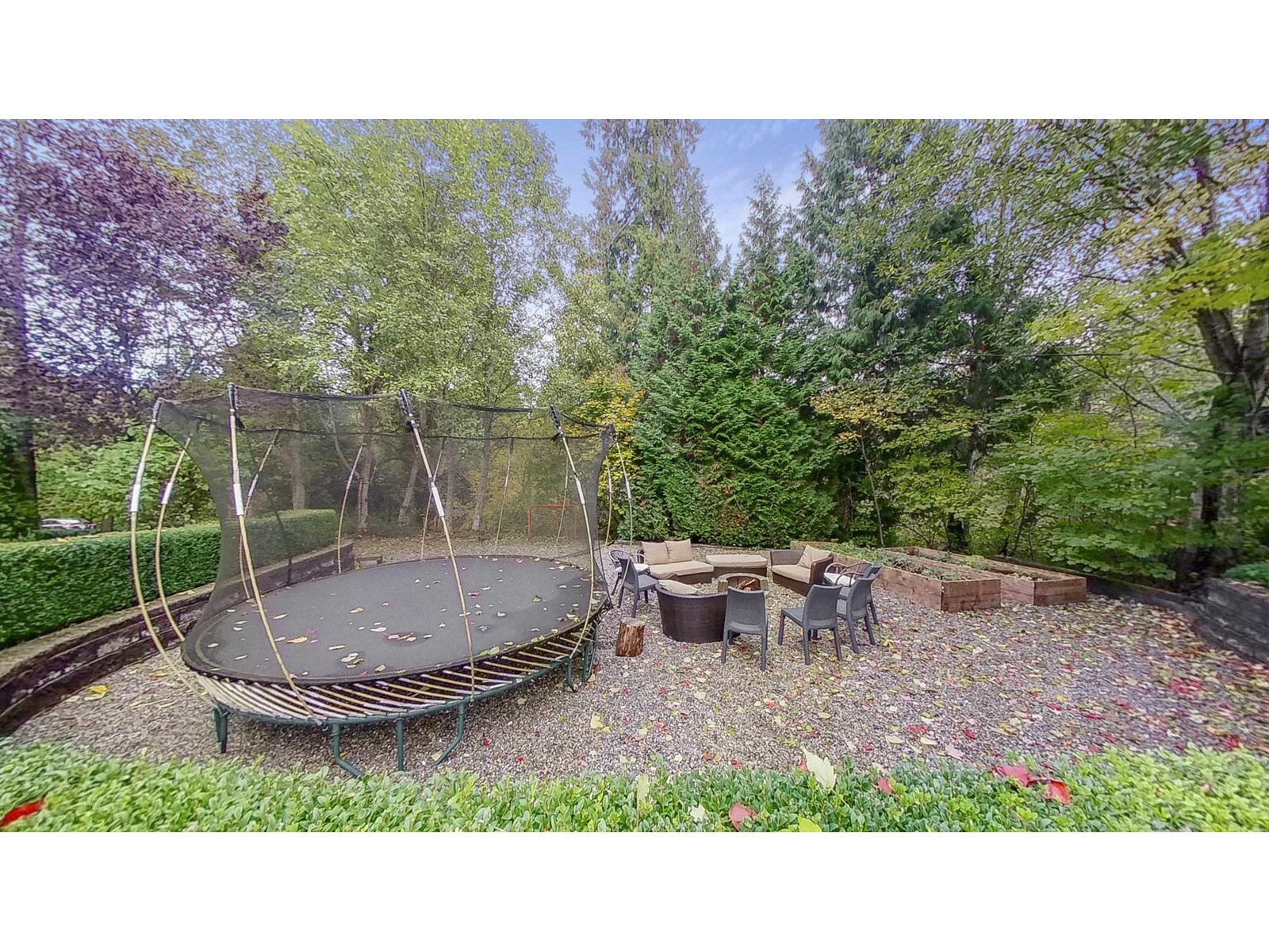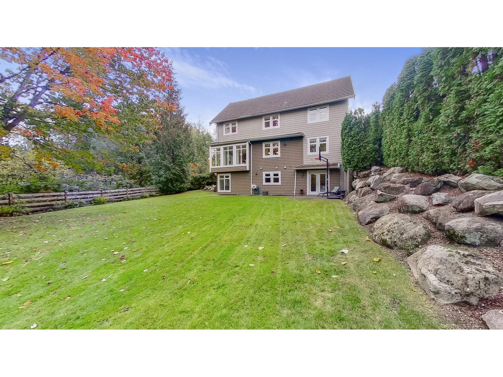 Extraordinary, custom-built luxury home, tucked away on cul de sac within private 1/4+ acre lot. Expansive living room featuring vaulted ceilings, stone gas fireplace & cozy window seats. Adjoining are the dining room & gourmet kitchen w modern appliances, all surrounded by full-length windows w serene green belt views. Main floor w 3 workstation office w built-ins & spacious deck. Upper level welcomes you w seating area overlooking living room. Primary suite offers concealed motorized TV lift, built-in vanity & gas fireplace. Ensuite boasts built-ins, skylights, under-vanity lighting & heated floors. Floor complete w 3 more bedrooms, an additional bathroom & convenient laundry chute. The walkout basement, easily converted into a suite, features 2 bedrooms, a bathroom & sizeable rec room. Enjoy attached double garage w EV charger, storage shed & extra RV parking. Home is within walking distance to Pacific Academy & has newly refinished original fir floors, as well as new A/C & furnace system. (id:22211)