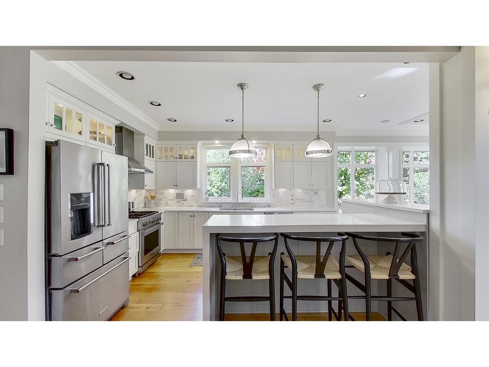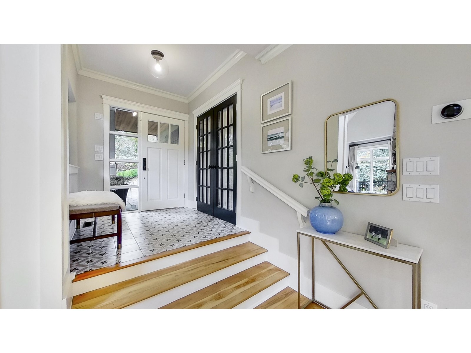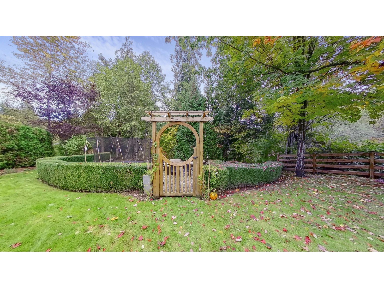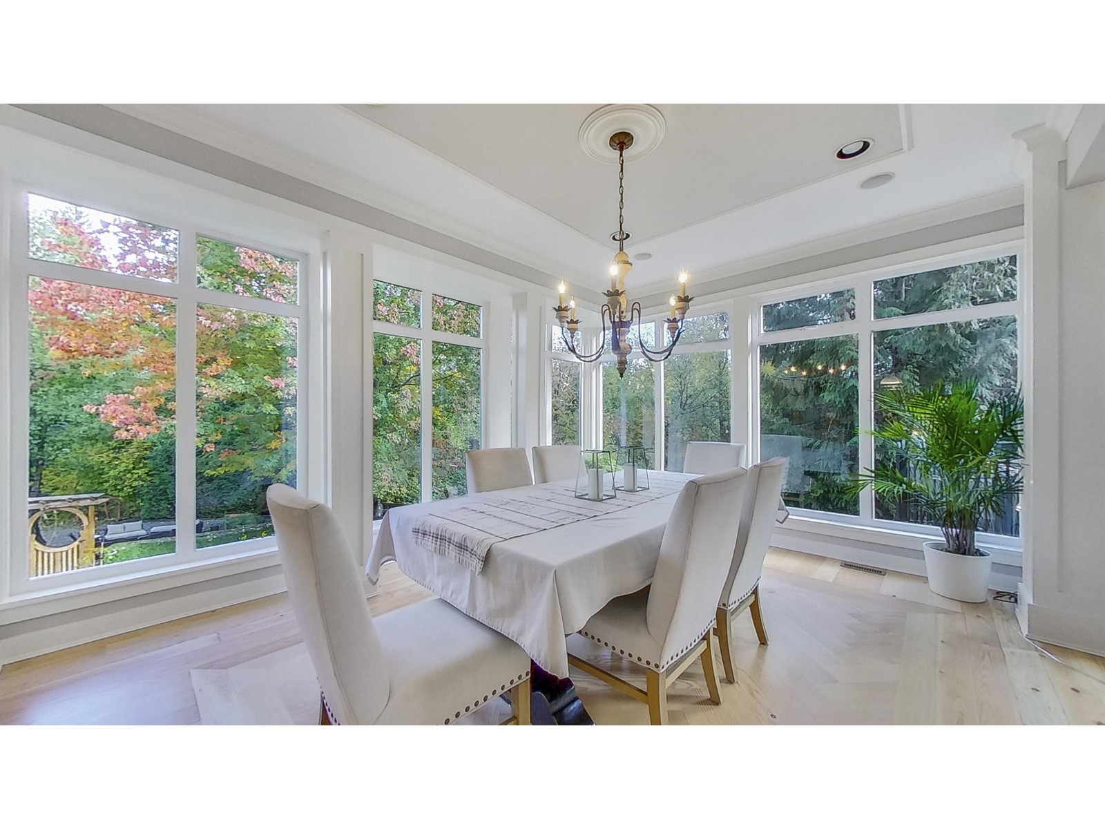 Extraordinary, custom-built luxury home, tucked away on cul de sac within private 1/4+ acre lot. Expansive living room featuring vaulted ceilings, stone gas fireplace & cozy window seats. Adjoining are the dining room & gourmet kitchen w modern appliances, all surrounded by full-length windows w serene green belt views. Main floor w 3 workstation office w built-ins & spacious deck. Upper level welcomes you w seating area overlooking living room. Primary suite offers concealed motorized TV lift, built-in vanity & gas fireplace. Ensuite boasts built-ins, skylights, under-vanity lighting & heated floors. Floor complete w 3 more bedrooms, an additional bathroom & convenient laundry chute. The walkout basement, easily converted into a suite, features 2 bedrooms, a bathroom & sizeable rec room. Enjoy attached double garage w EV charger, storage shed & extra RV parking. Home is within walking distance to Pacific Academy & has newly refinished original fir floors, as well as new A/C & furnace system. (id:22211)
