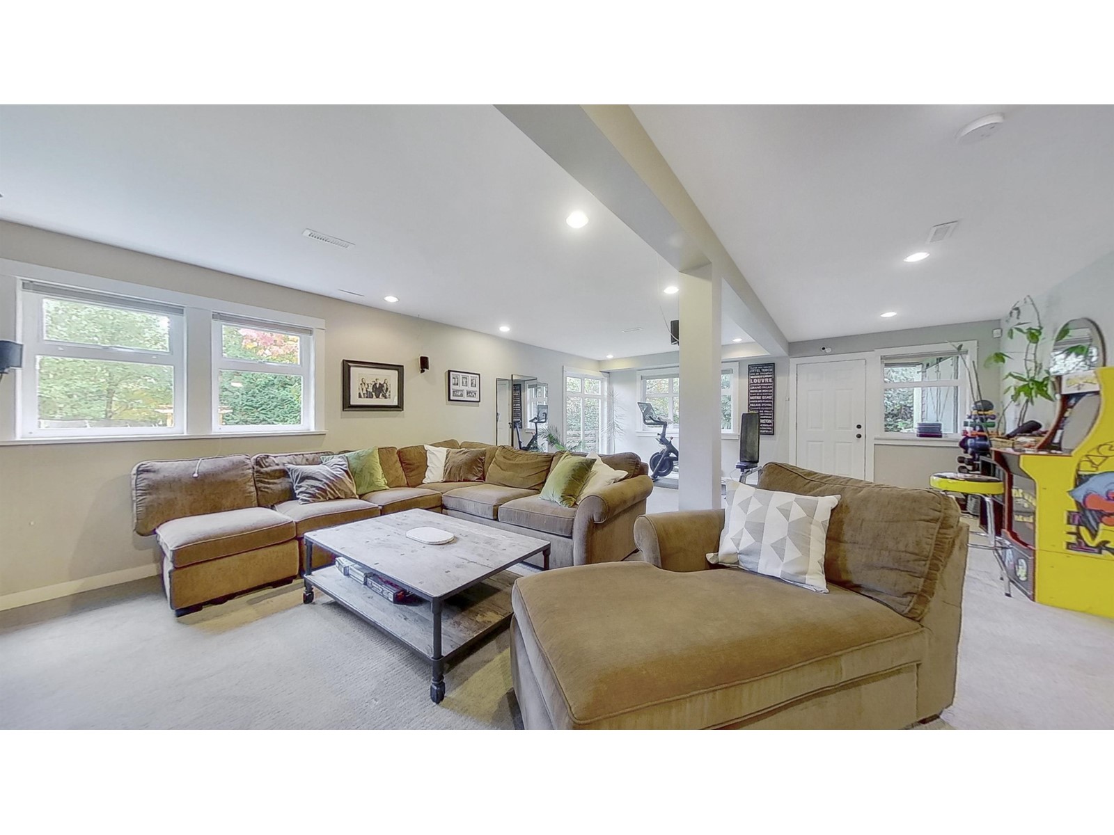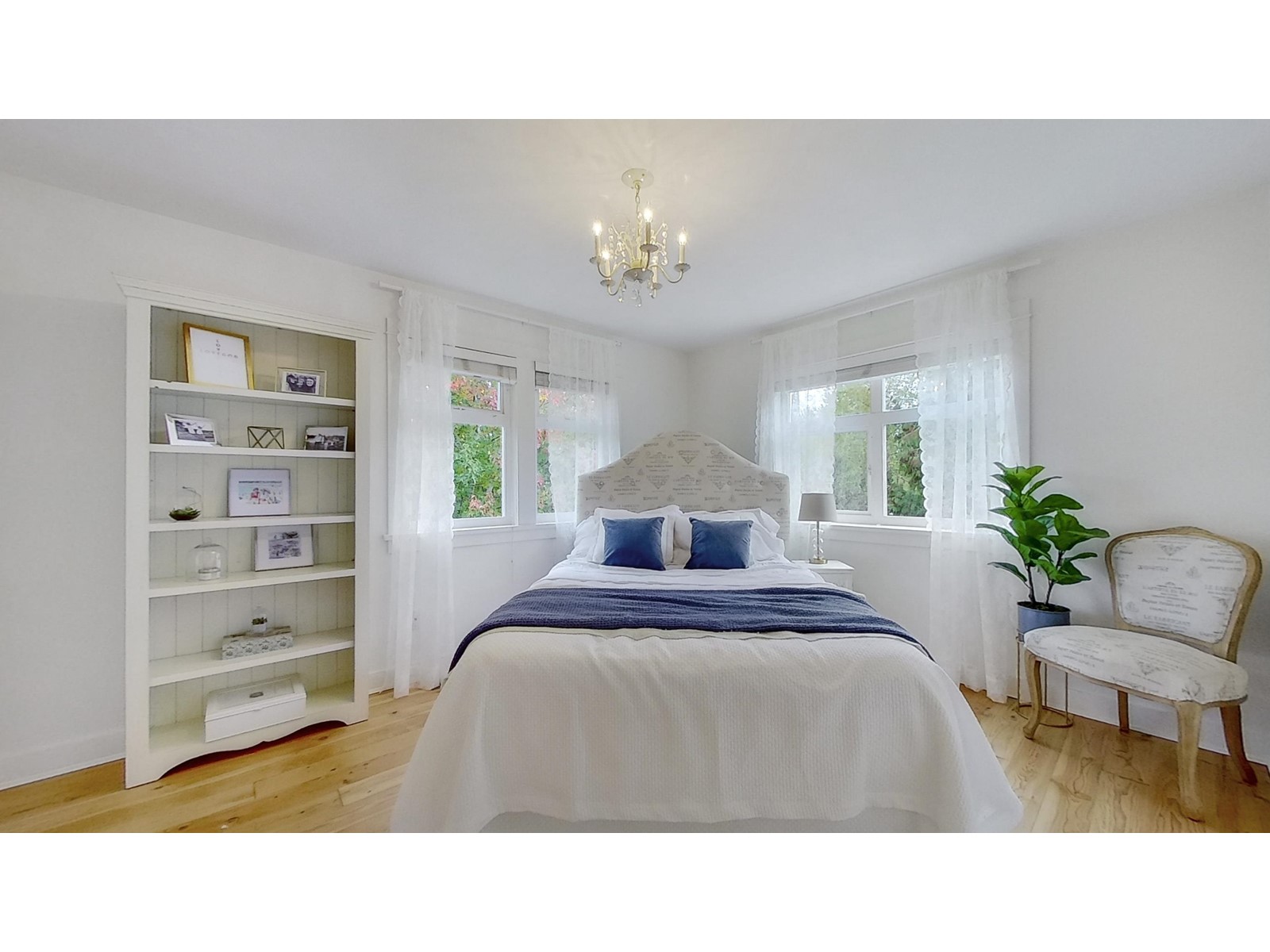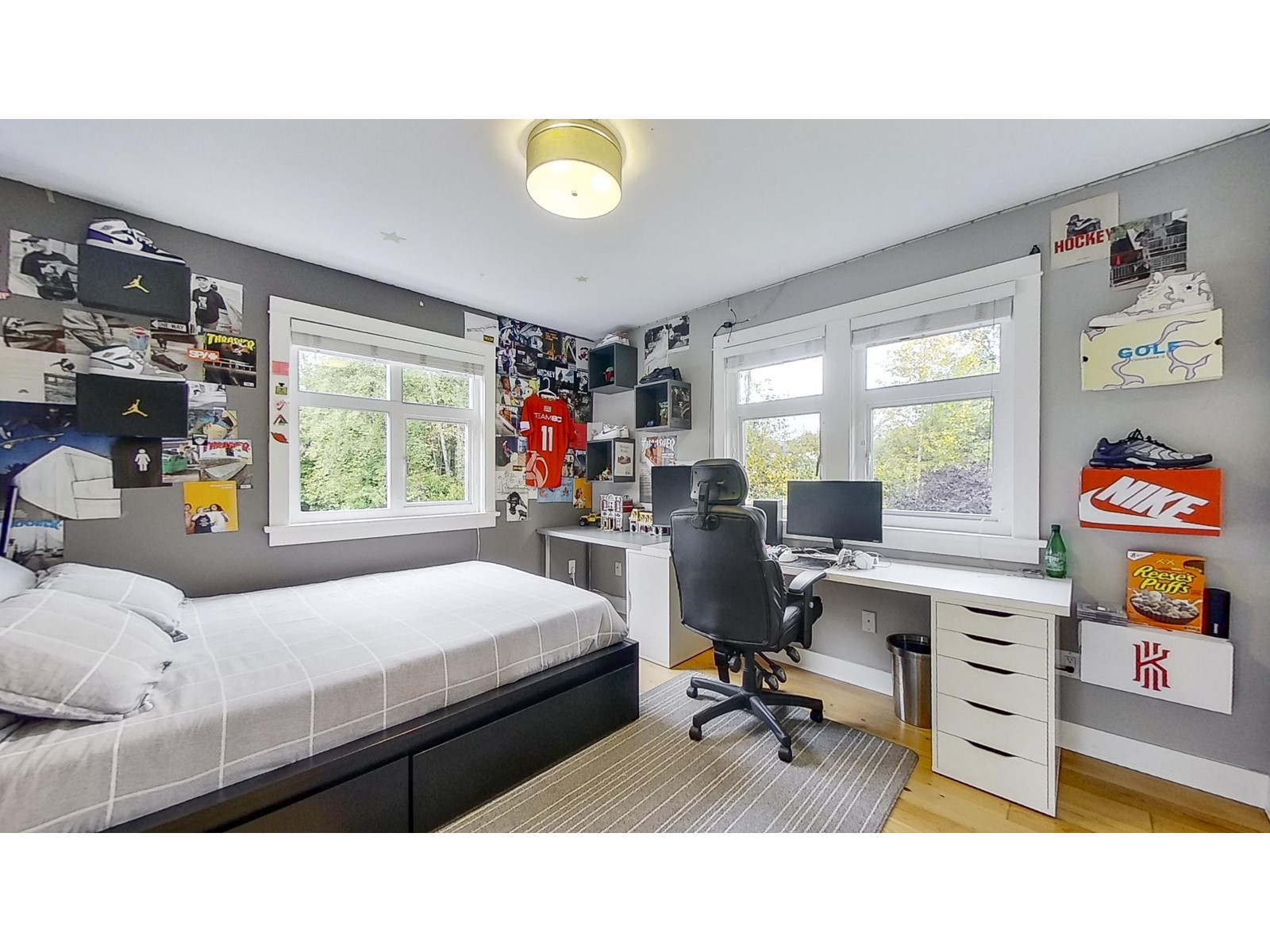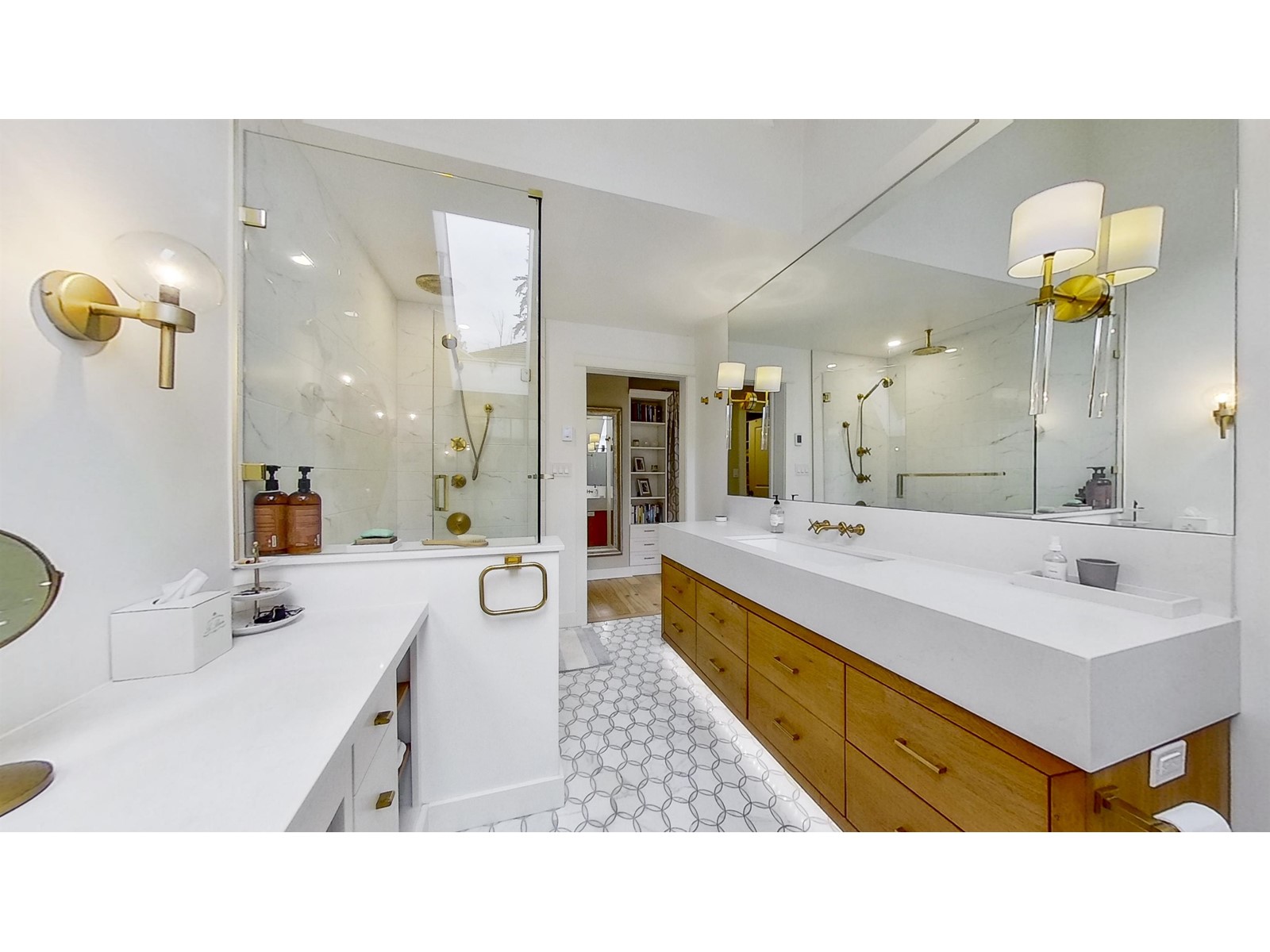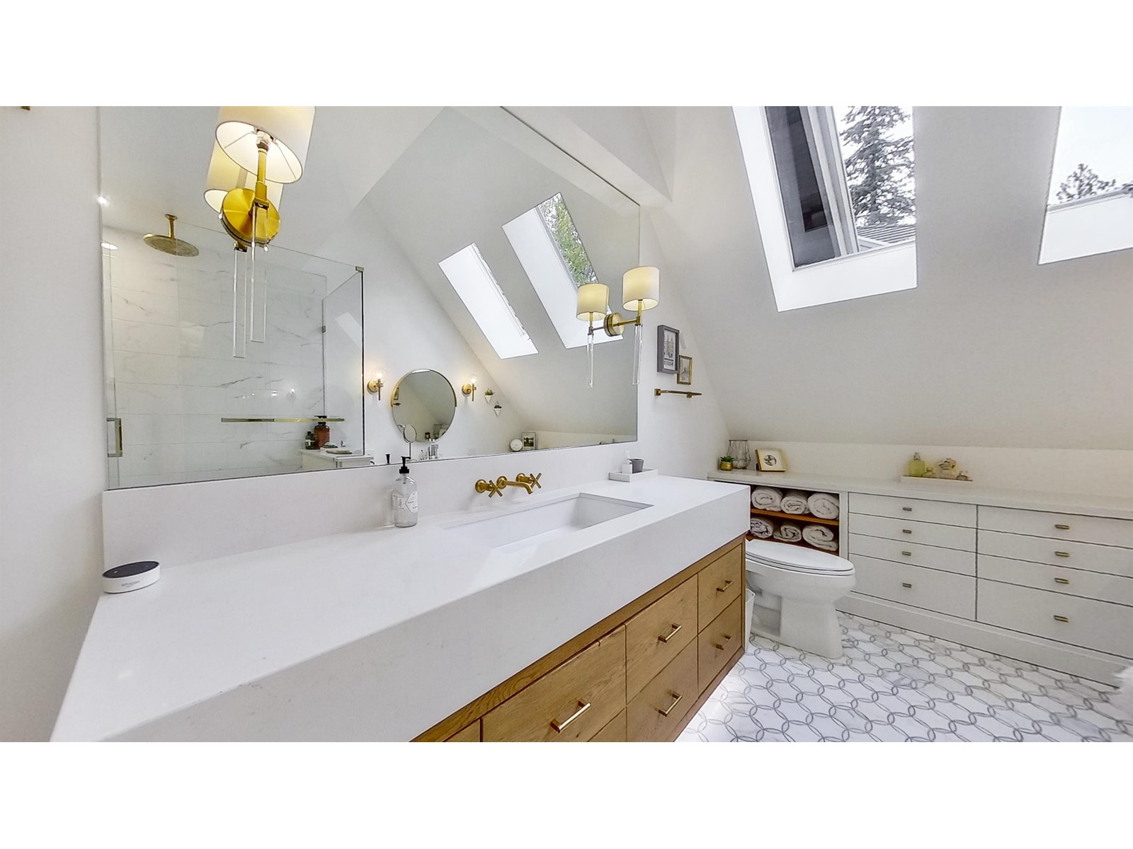Extraordinary, custom-built luxury home, tucked away on cul de sac within private 1/4+ acre lot. Expansive living room featuring vaulted ceilings, stone gas fireplace & cozy window seats. Adjoining are the dining room & gourmet kitchen w modern appliances, all surrounded by full-length windows w serene green belt views. Main floor w 3 workstation office w built-ins & spacious deck. Upper level welcomes you w seating area overlooking living room. Primary suite offers concealed motorized TV lift, built-in vanity & gas fireplace. Ensuite boasts built-ins, skylights, under-vanity lighting & heated floors. Floor complete w 3 more bedrooms, an additional bathroom & convenient laundry chute. The walkout basement, easily converted into a suite, features 2 bedrooms, a bathroom & sizeable rec room. Enjoy attached double garage w EV charger, storage shed & extra RV parking. Home is within walking distance to Pacific Academy & has newly refinished original fir floors, as well as new A/C & furnace system. (id:22211)