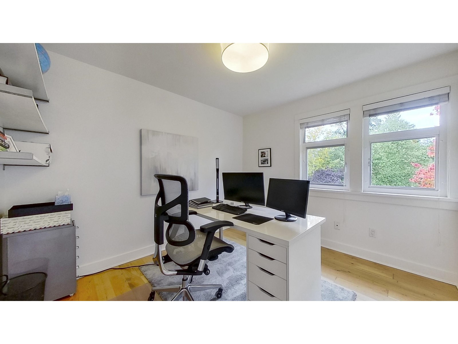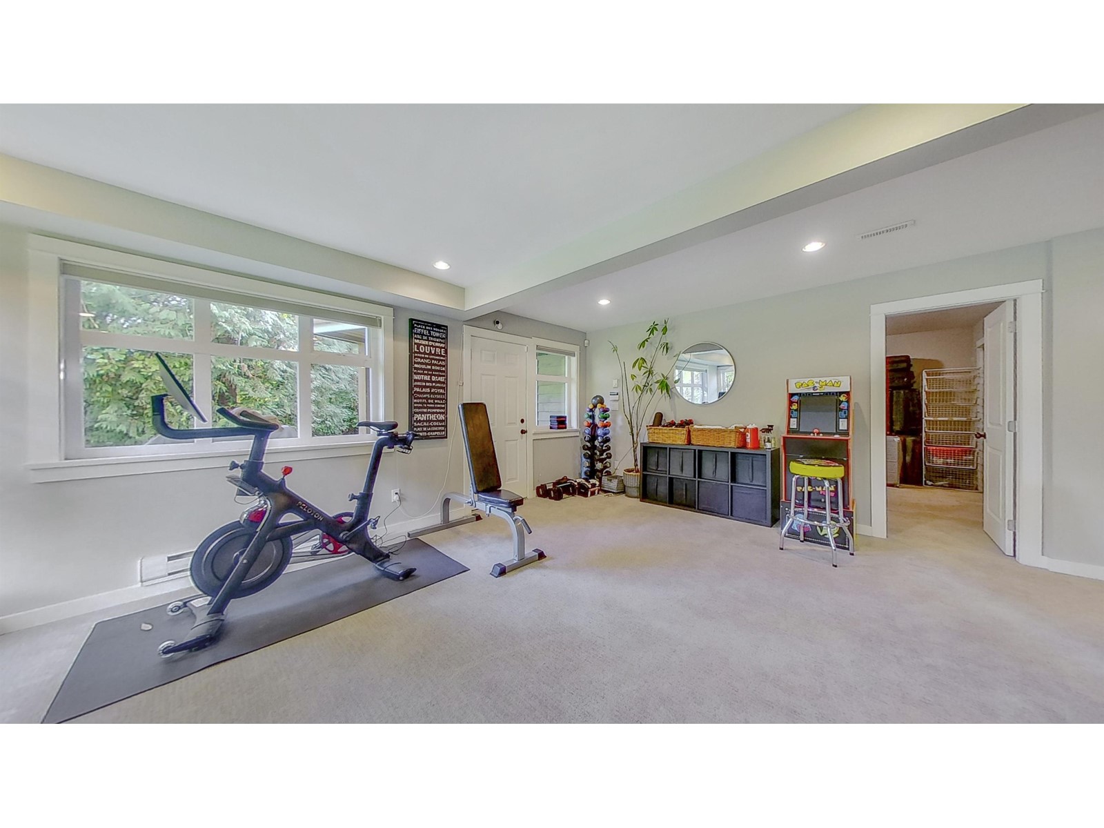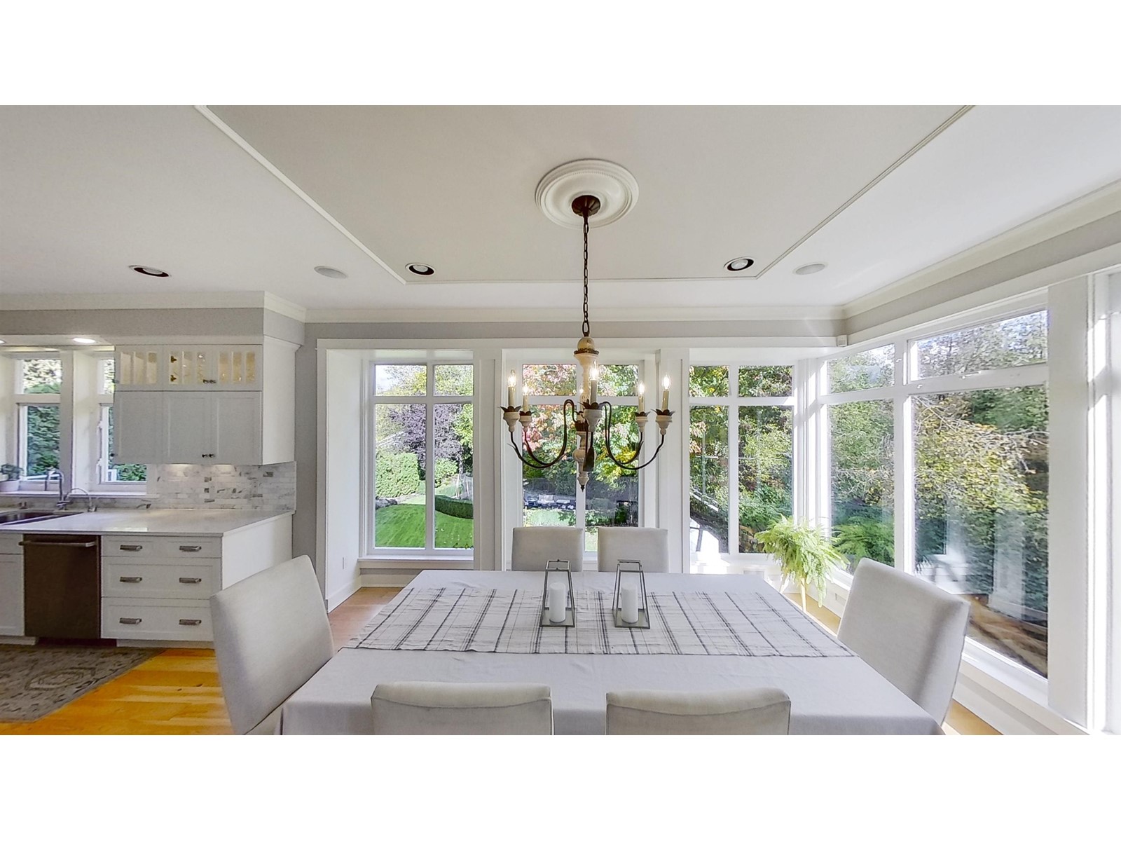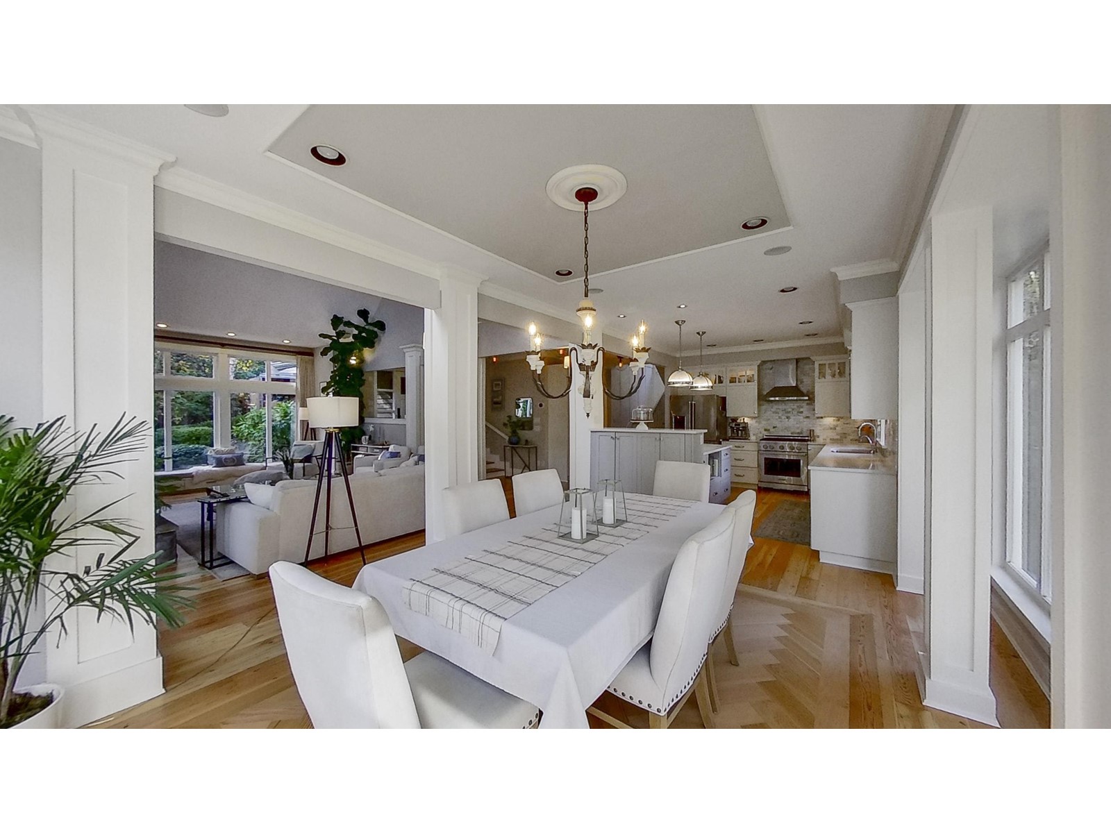 Extraordinary, custom-built luxury home, tucked away on cul de sac within private 1/4+ acre lot. Expansive living room featuring vaulted ceilings, stone gas fireplace & cozy window seats. Adjoining are the dining room & gourmet kitchen w modern appliances, all surrounded by full-length windows w serene green belt views. Main floor w 3 workstation office w built-ins & spacious deck. Upper level welcomes you w seating area overlooking living room. Primary suite offers concealed motorized TV lift, built-in vanity & gas fireplace. Ensuite boasts built-ins, skylights, under-vanity lighting & heated floors. Floor complete w 3 more bedrooms, an additional bathroom & convenient laundry chute. The walkout basement, easily converted into a suite, features 2 bedrooms, a bathroom & sizeable rec room. Enjoy attached double garage w EV charger, storage shed & extra RV parking. Home is within walking distance to Pacific Academy & has newly refinished original fir floors, as well as new A/C & furnace system. (id:22211)