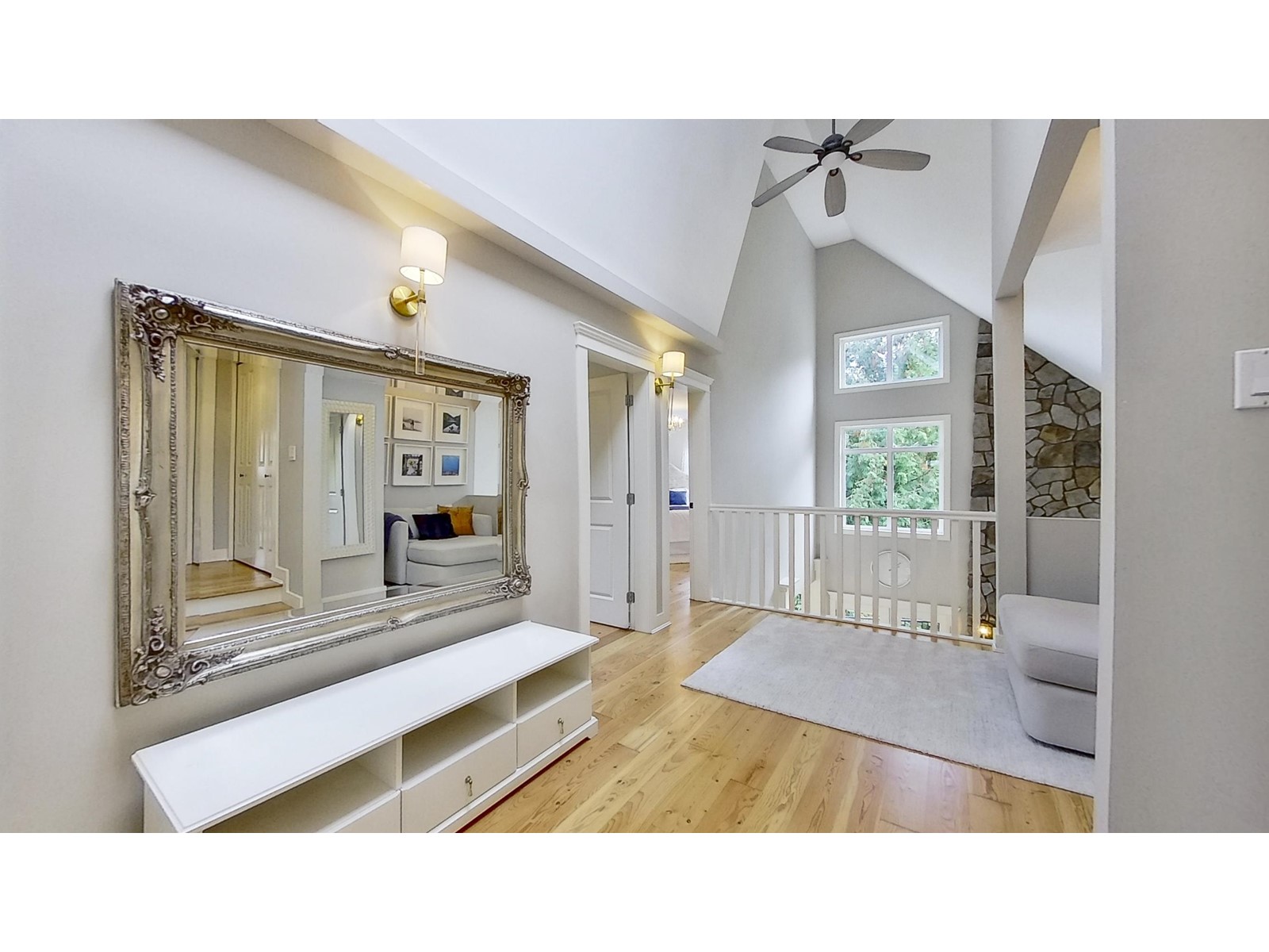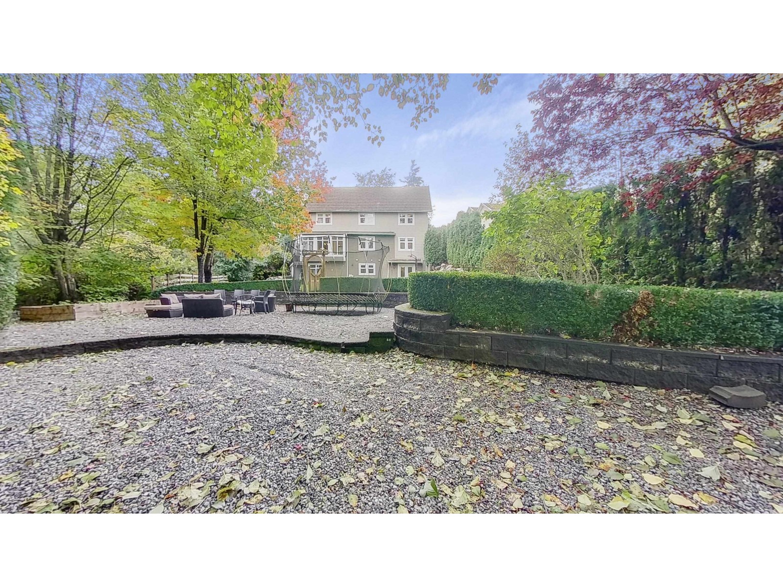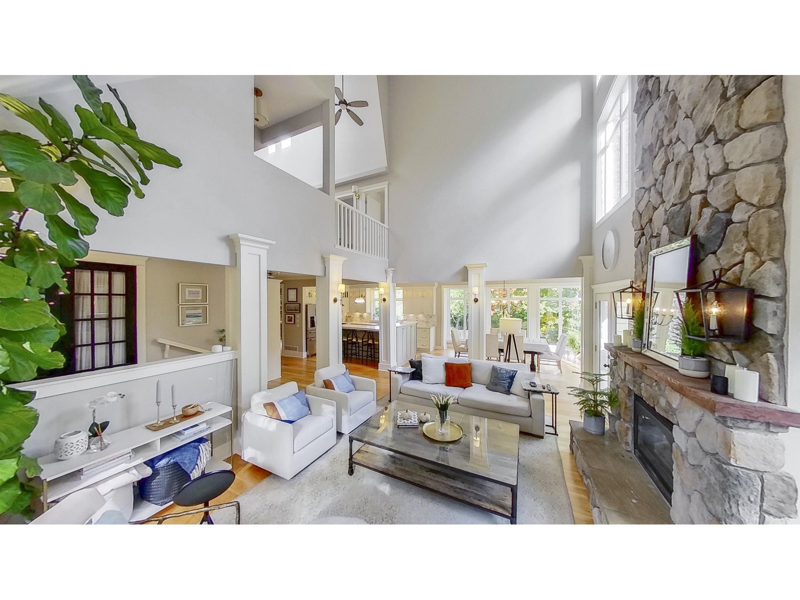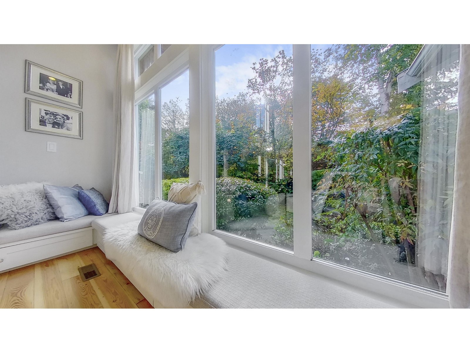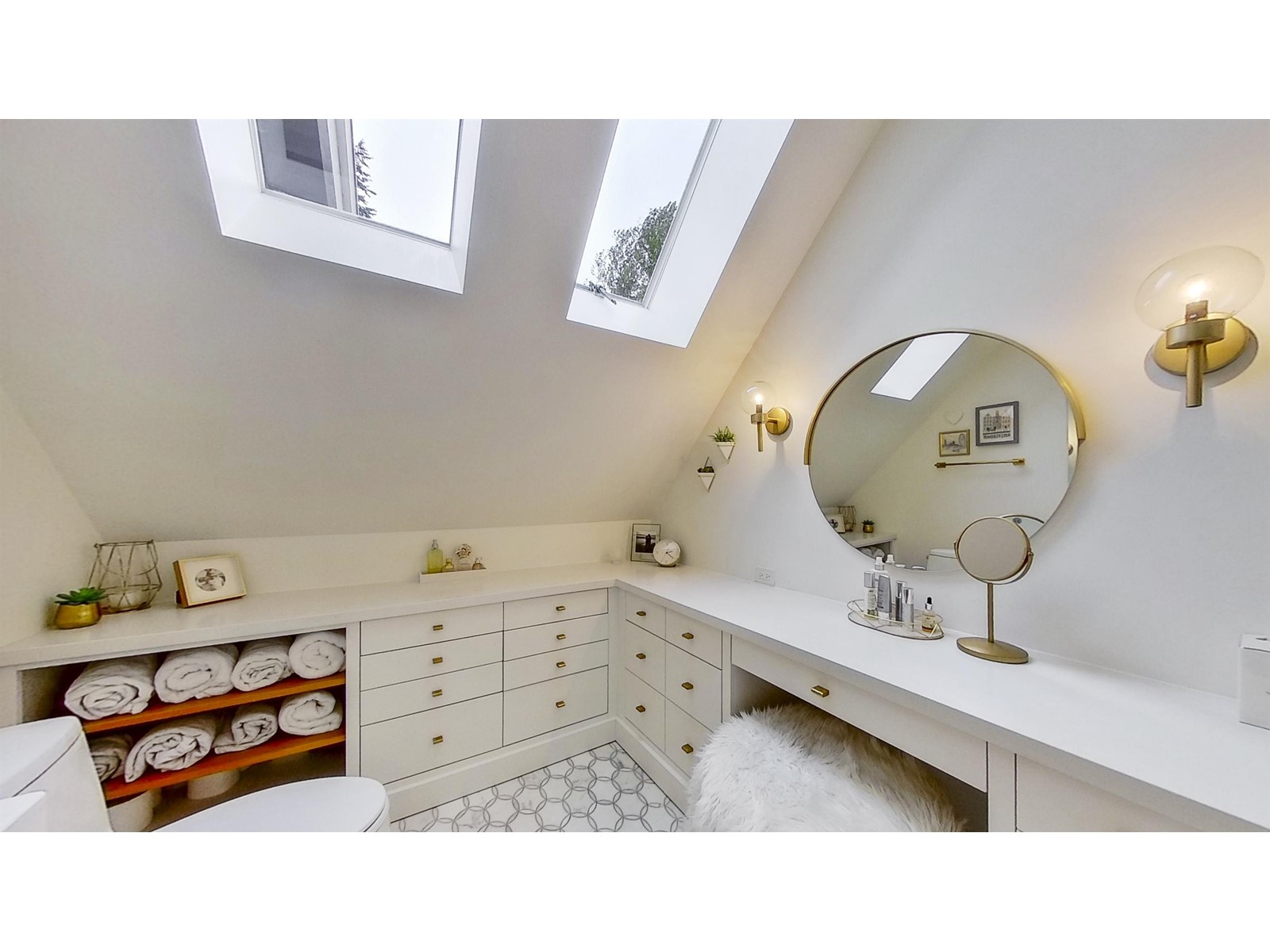 Extraordinary, custom-built luxury home, tucked away on cul de sac within private 1/4+ acre lot. Expansive living room featuring vaulted ceilings, stone gas fireplace & cozy window seats. Adjoining are the dining room & gourmet kitchen w modern appliances, all surrounded by full-length windows w serene green belt views. Main floor w 3 workstation office w built-ins & spacious deck. Upper level welcomes you w seating area overlooking living room. Primary suite offers concealed motorized TV lift, built-in vanity & gas fireplace. Ensuite boasts built-ins, skylights, under-vanity lighting & heated floors. Floor complete w 3 more bedrooms, an additional bathroom & convenient laundry chute. The walkout basement, easily converted into a suite, features 2 bedrooms, a bathroom & sizeable rec room. Enjoy attached double garage w EV charger, storage shed & extra RV parking. Home is within walking distance to Pacific Academy & has newly refinished original fir floors, as well as new A/C & furnace system. (id:22211)