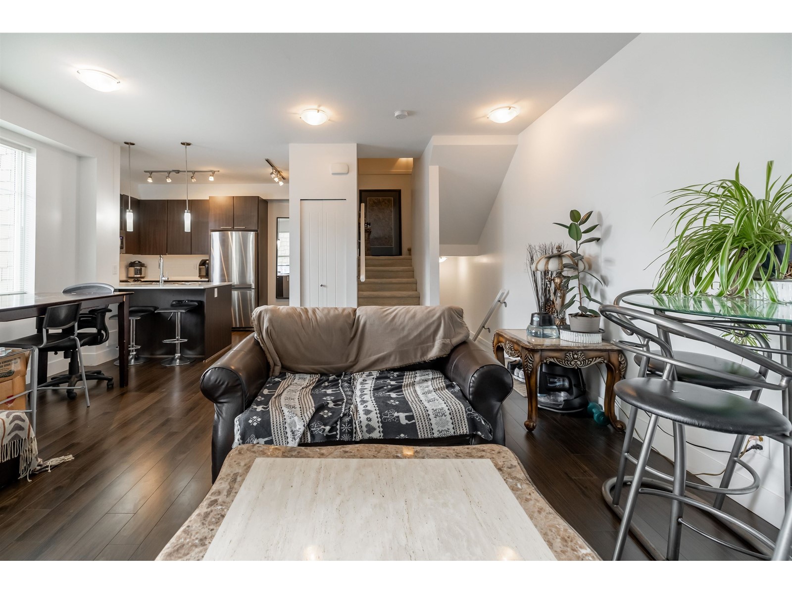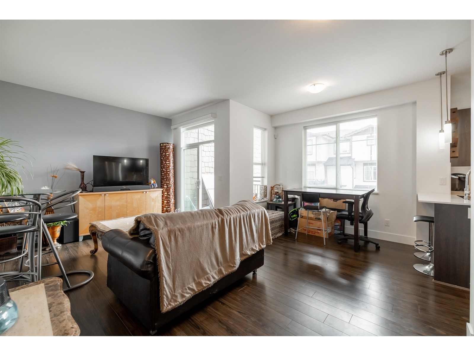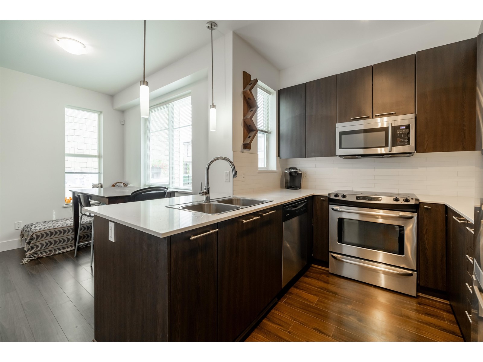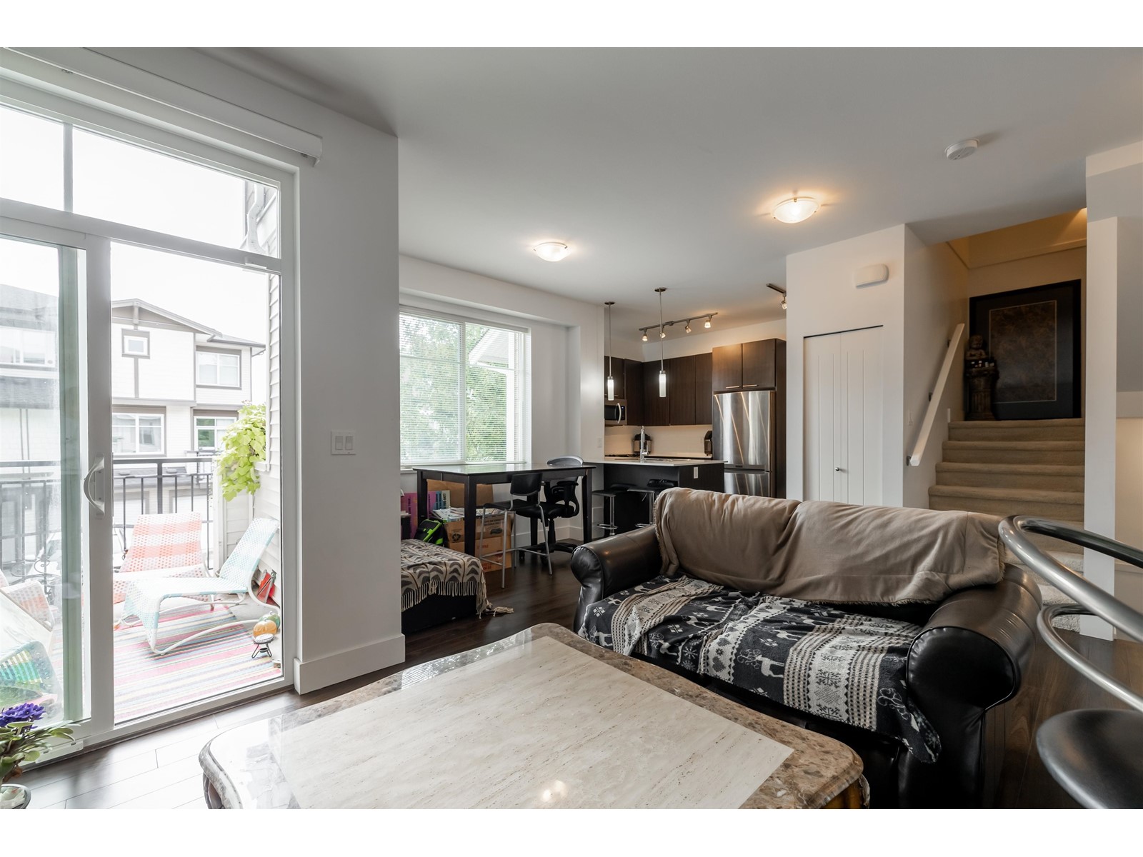 Welcome to the Grove by developer Townline Homes. Desirable 2 bdrm + 2 full bath townhome living in the heart of Clayton. Outstanding features include 9'0 high airy ceiling on main floor, open concept living/kitchen with full height double pantry, stainless steel appliances, bonus nook/office space and walk-out to private patio from liv rm. Laundry conveniently located upstairs. 2 parking: Single car garage + pad. Complex amenities include 2 clubhouses, 2 gyms, mini indoor floor hockey rink, theatre, & outdoor pool. Minutes from Hwy 1, near the future Skytrain station! Kitty corner to convenience store, tasty pizza, sushi, and a martial arts centre. Walking distance to Breweries, the mall, parks & Katzie elementary school! Great home for both kids and pets! (id:22211)