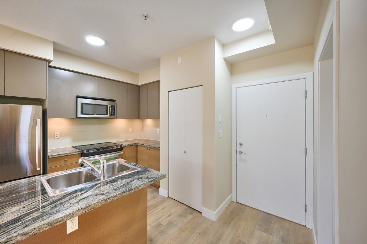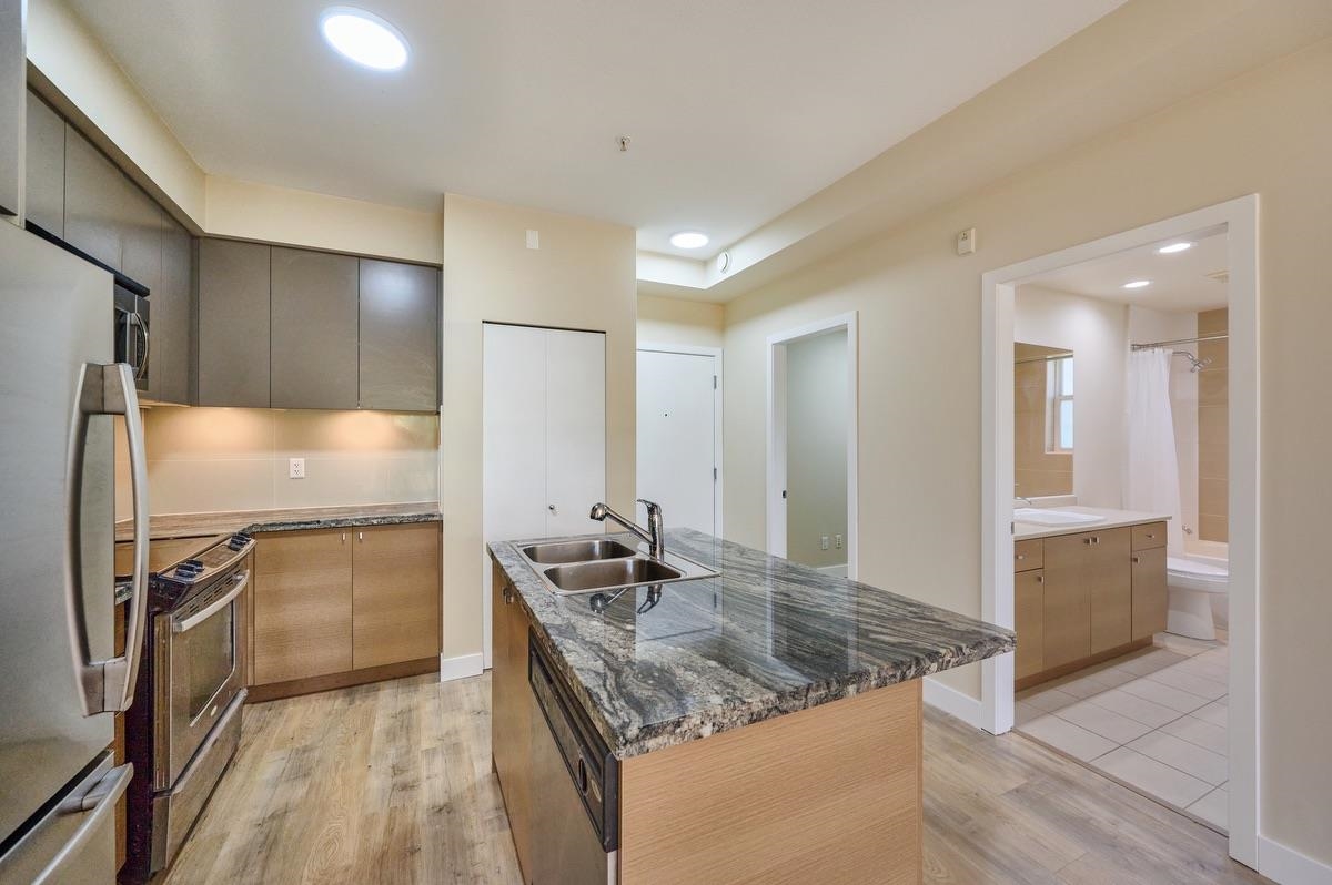 Welcome to Waterstone! This spacious one bedroom & den CORNER unit with a 200+ sqft. wrap-around patio is refreshed & move-in ready. Enjoy plenty of natural light with this sunny south & east facing unit. This property includes NEW modern laminate flooring, a fresh coat of paint, new blinds, new light fixtures, stainless steel appliances, a new washer & dryer, granite countertops, & a kitchen island with barstool seating. Waterstone offers a resort like living with a full fitness centre, indoor pool & hot tub, entertainment lounge, theatre room, & an oversized meeting & party room with a chef's kitchen. Set just minutes away from Willowbrook Centre, this spectacular community is central yet in a peaceful setting. 1 parking & 1 locker included.