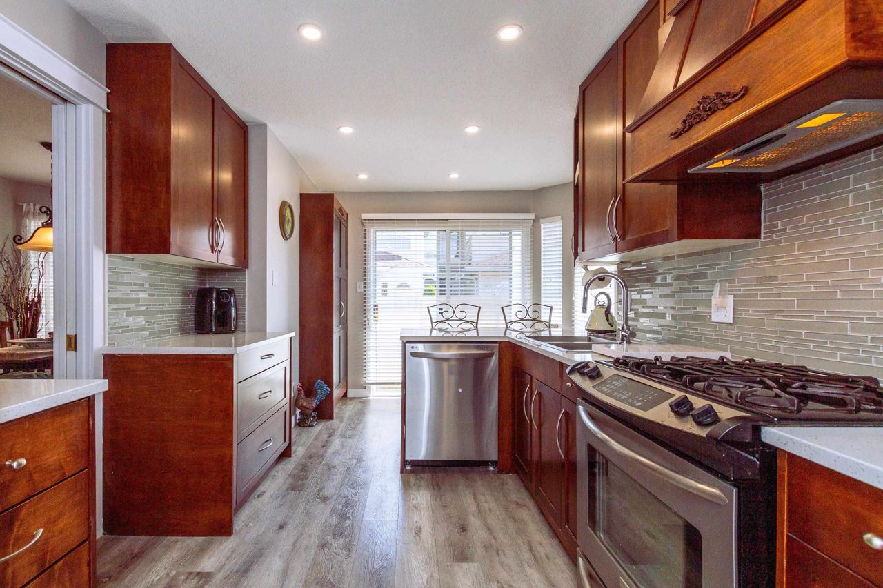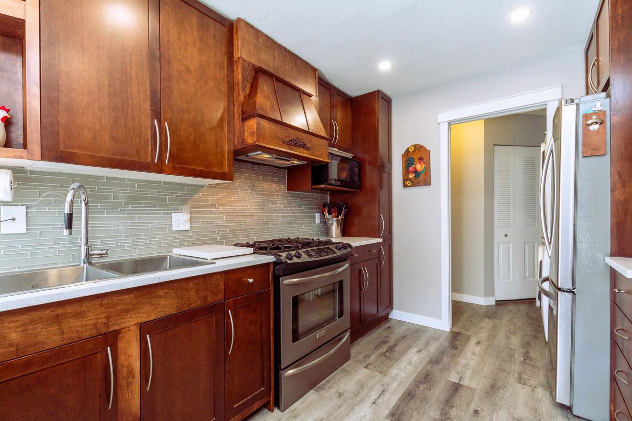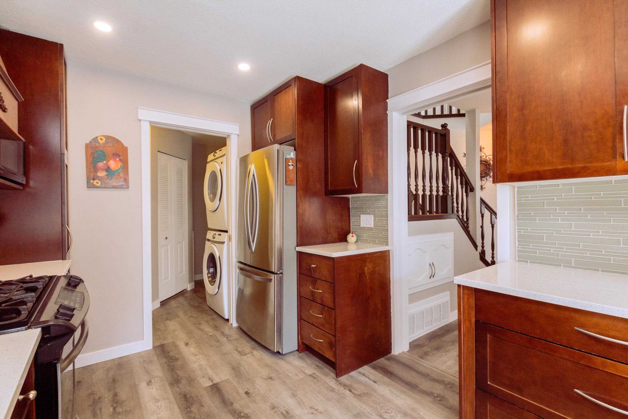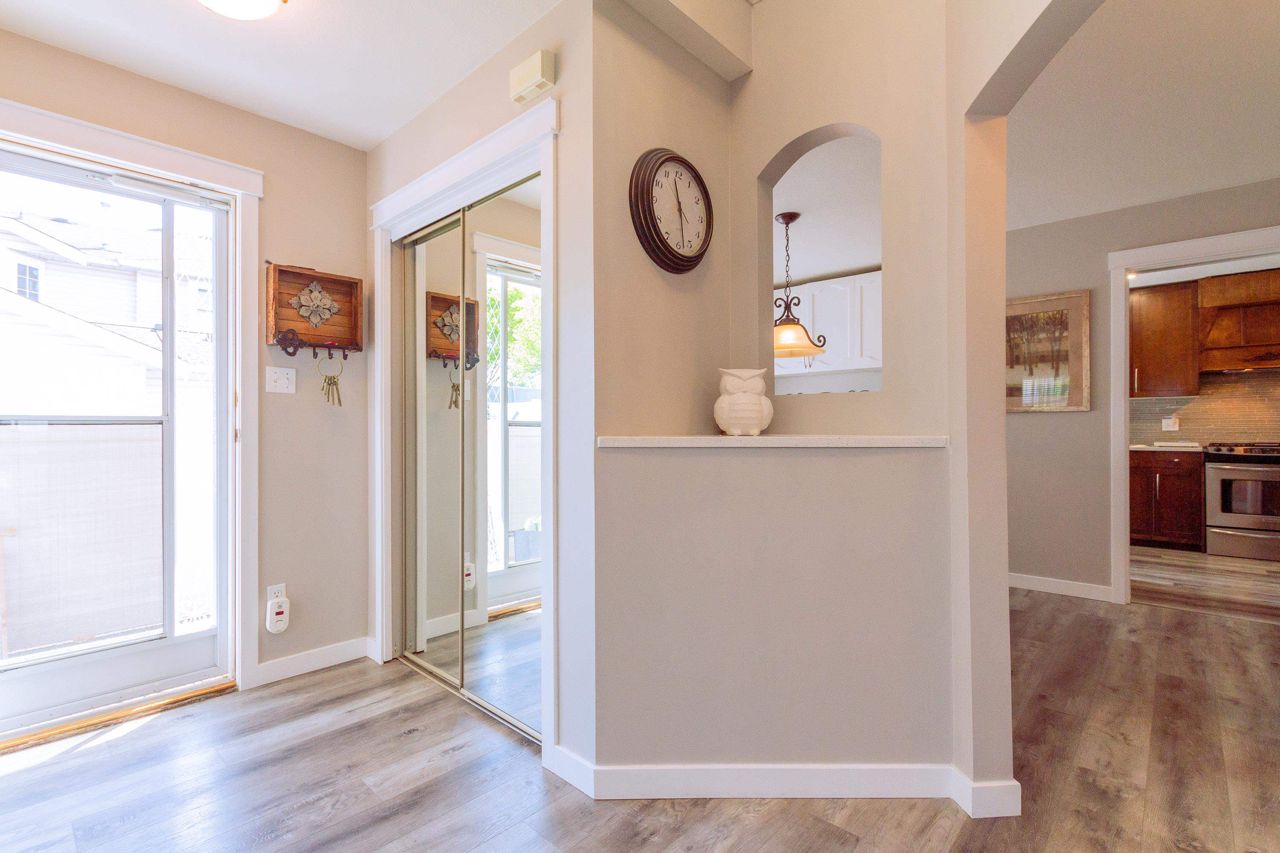 Lovely updated end unit feels like a house. This spacious 3 bdrm, 2 1/2 bath, 2 storey duplex style townhome features a convenient spacious MASTER BEDROOM ON THE MAIN FLOOR with a huge walk-in shower. Updates incl new flooring throughout, new bathroom fixtures, new finish work, gas stove, gas f/p, s/s appliances, 2" blinds and window coverings, nat gas BBQ outlet, central A/C, paint, lighting & more. Tons of windows and natural light. The kitchen has modern cabinets and counters with an adjacent eating area. Large pantry off laudry. 2 lge bdrms up. Storage closet upstairs plus a 4 ft. high crawl space. DBLE GARAGE with plenty of guest parking, plus addl street parking behind unit. Very quiet unit and private patio, all in a secure gated community. Close to transit, schools, and shopping.
