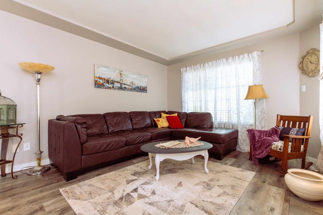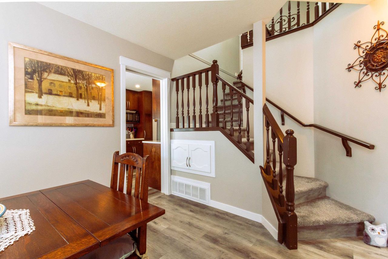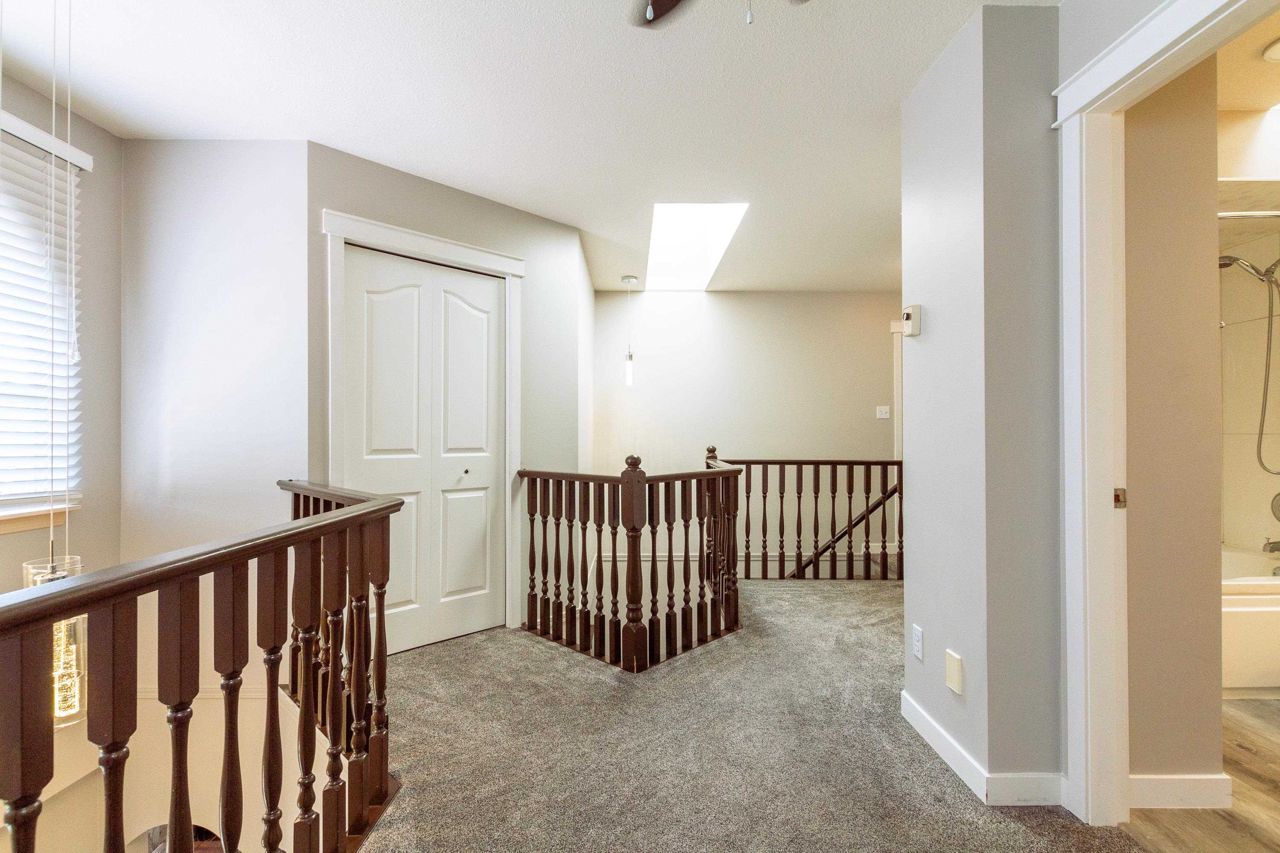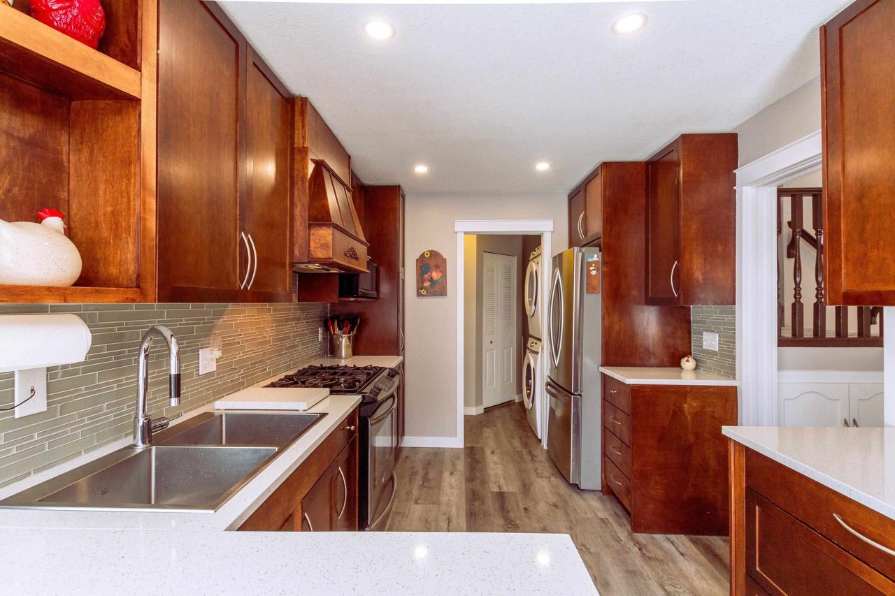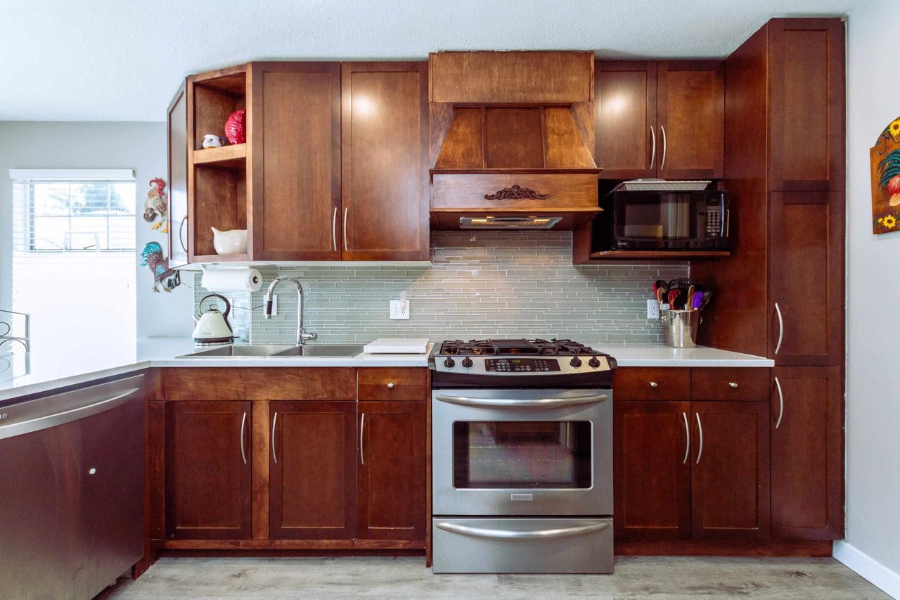 Lovely updated end unit feels like a house. This spacious 3 bdrm, 2 1/2 bath, 2 storey duplex style townhome features a convenient spacious MASTER BEDROOM ON THE MAIN FLOOR with a huge walk-in shower. Updates incl new flooring throughout, new bathroom fixtures, new finish work, gas stove, gas f/p, s/s appliances, 2" blinds and window coverings, nat gas BBQ outlet, central A/C, paint, lighting & more. Tons of windows and natural light. The kitchen has modern cabinets and counters with an adjacent eating area. Large pantry off laudry. 2 lge bdrms up. Storage closet upstairs plus a 4 ft. high crawl space. DBLE GARAGE with plenty of guest parking, plus addl street parking behind unit. Very quiet unit and private patio, all in a secure gated community. Close to transit, schools, and shopping.