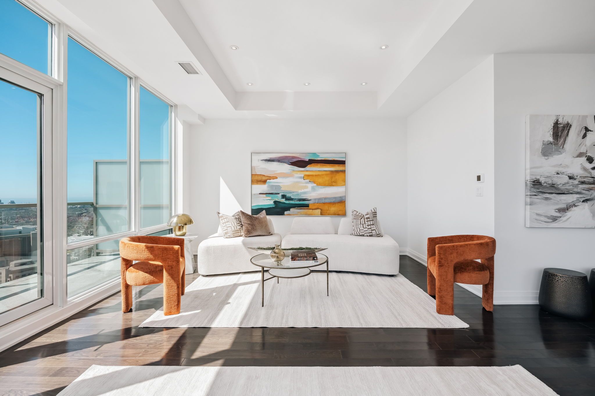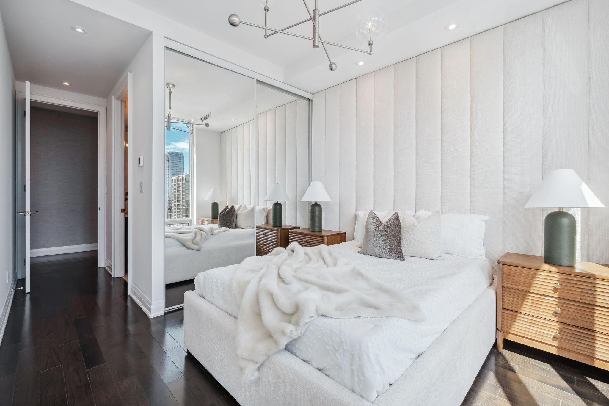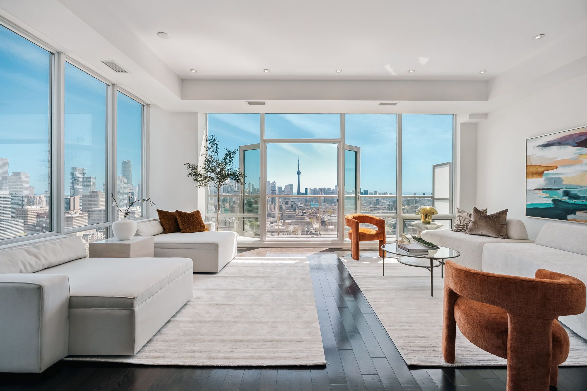 Welcome to Suite 3201 at One Bedford a rare penthouse residence in one of Toronto's most prestigious addresses. This exclusive 2+1 bed,3-bath home spans 2,539 sq. ft. and is one of only two suites on the floor, offering exceptional privacy and panoramic views of the CN Tower, downtown skyline, and lake. Impeccably upgraded with designer finishes, the suite features hardwood floors, custom pot lighting, tailored wallpaper, and elegant fixtures throughout. A spacious foyer leads into a stunning living room with floor-to-ceiling windows and a formal dining space beneath a sculptural chandelier. The chef's kitchen is a true showpiece, with a quartz waterfall island, glass tile backsplash, Miele appliances, and bespoke cabinetry. The primary suite is a private retreat, complete with its own balcony, a walk-in closet, and a spa-like ensuite with a deep soaker tub beneath a picture window, double vanity, marble tile, and separate water closet. The second bedroom features east-facing windows, custom built-ins, and a sleek 3-piece ensuite. A spacious den with balcony access adds flexibility as a home office or third bedroom. Even the laundry room has been thoughtfully designed with custom cabinetry, quartz counters, and full-size washer/dryer. Includes two premium side-by-side parking spots and a private locker. Residents enjoy five-star amenities: indoor pool, hot tub, sauna, steam room, fitness centre, party room, outdoor terrace, concierge, guest suites, and more. Unbeatable location near U of T, ROM, Royal Conservatory, and Yorkville's finest shops and dining. This is elevated, turnkey penthouse living refined, private, and move-in ready. This suite includes 2 premium side-by-side parking spots & a private locker rare in the city. Five-star amenities incl. indoor pool, hot tub, gym, concierge, guest suites, visitor parking & more for elevated urban living.