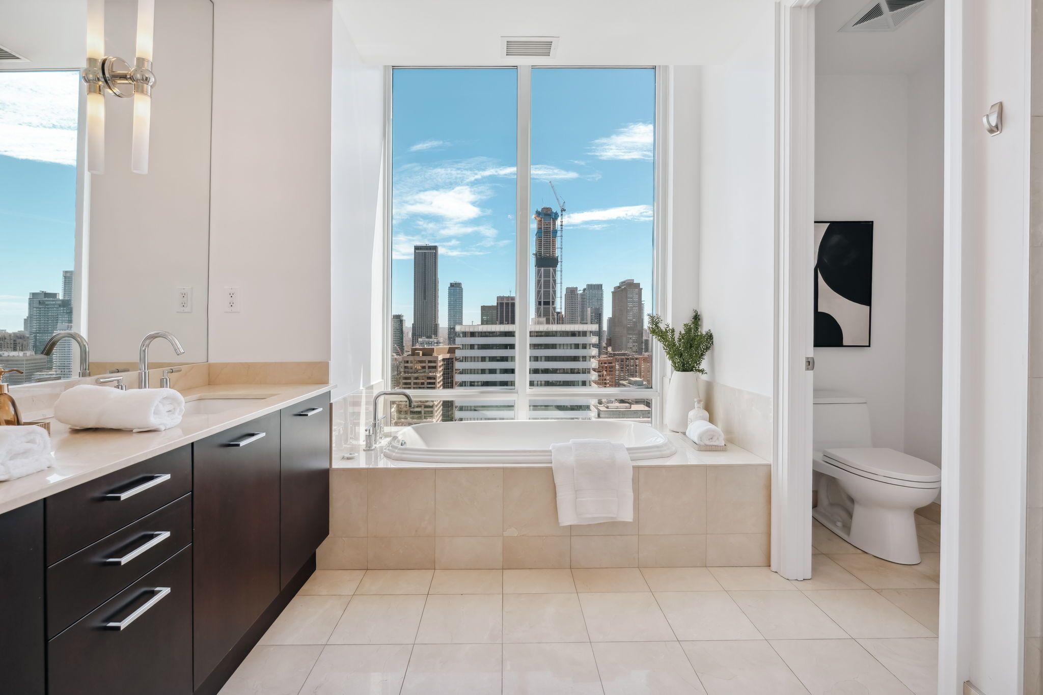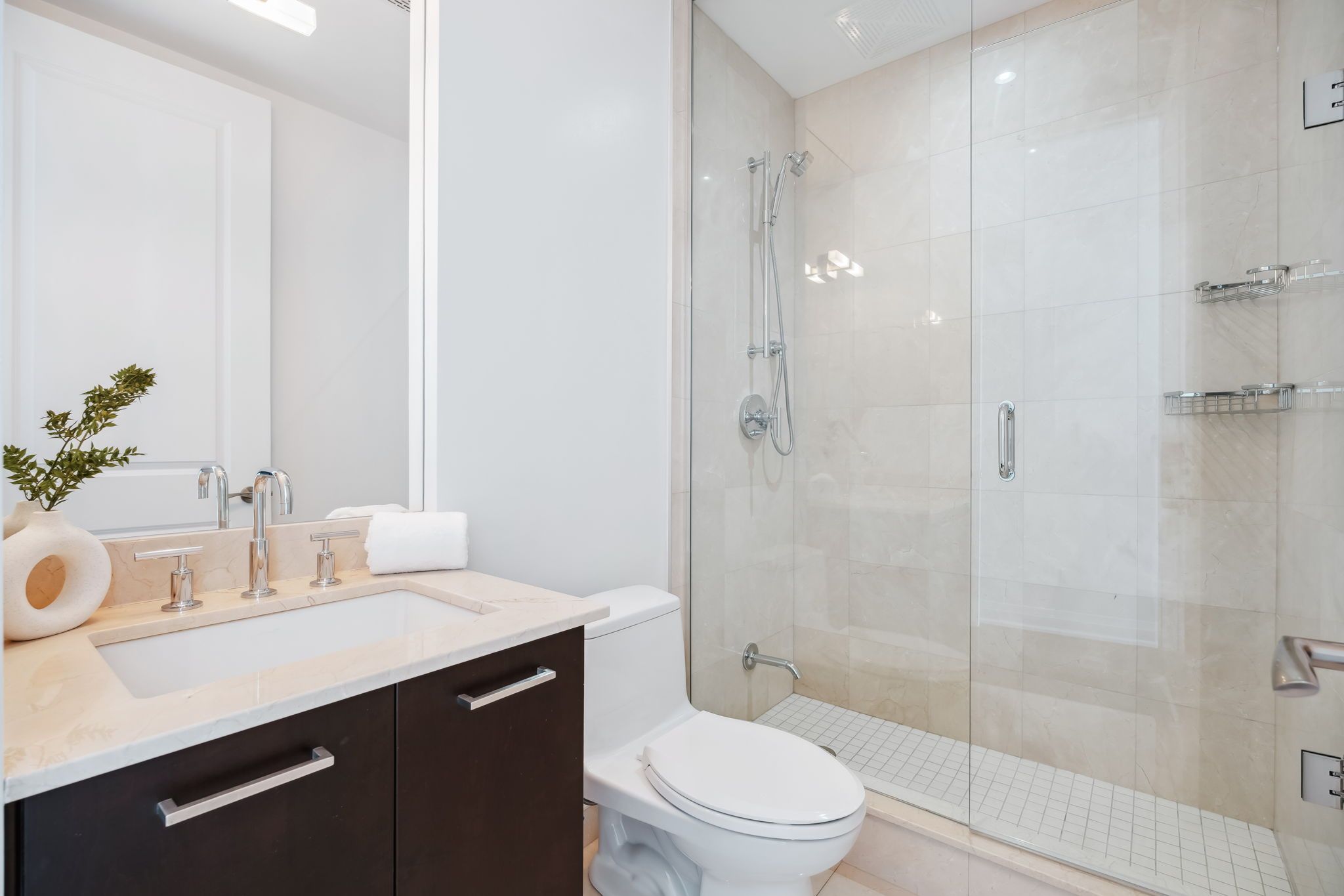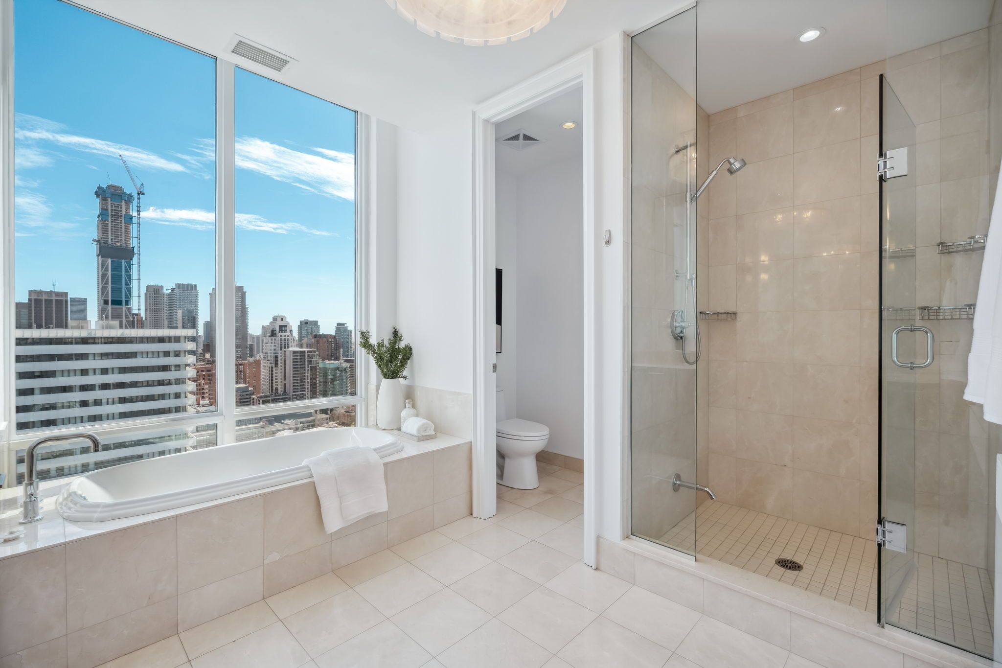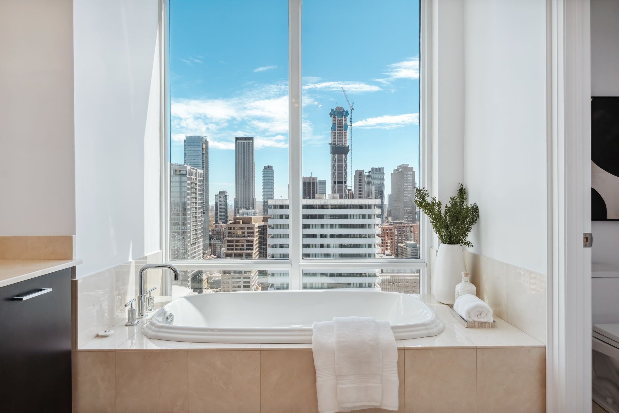 Welcome to Suite 3201 at One Bedford a rare penthouse residence in one of Toronto's most prestigious addresses. This exclusive 2+1 bed,3-bath home spans 2,539 sq. ft. and is one of only two suites on the floor, offering exceptional privacy and panoramic views of the CN Tower, downtown skyline, and lake. Impeccably upgraded with designer finishes, the suite features hardwood floors, custom pot lighting, tailored wallpaper, and elegant fixtures throughout. A spacious foyer leads into a stunning living room with floor-to-ceiling windows and a formal dining space beneath a sculptural chandelier. The chef's kitchen is a true showpiece, with a quartz waterfall island, glass tile backsplash, Miele appliances, and bespoke cabinetry. The primary suite is a private retreat, complete with its own balcony, a walk-in closet, and a spa-like ensuite with a deep soaker tub beneath a picture window, double vanity, marble tile, and separate water closet. The second bedroom features east-facing windows, custom built-ins, and a sleek 3-piece ensuite. A spacious den with balcony access adds flexibility as a home office or third bedroom. Even the laundry room has been thoughtfully designed with custom cabinetry, quartz counters, and full-size washer/dryer. Includes two premium side-by-side parking spots and a private locker. Residents enjoy five-star amenities: indoor pool, hot tub, sauna, steam room, fitness centre, party room, outdoor terrace, concierge, guest suites, and more. Unbeatable location near U of T, ROM, Royal Conservatory, and Yorkville's finest shops and dining. This is elevated, turnkey penthouse living refined, private, and move-in ready. This suite includes 2 premium side-by-side parking spots & a private locker rare in the city. Five-star amenities incl. indoor pool, hot tub, gym, concierge, guest suites, visitor parking & more for elevated urban living.