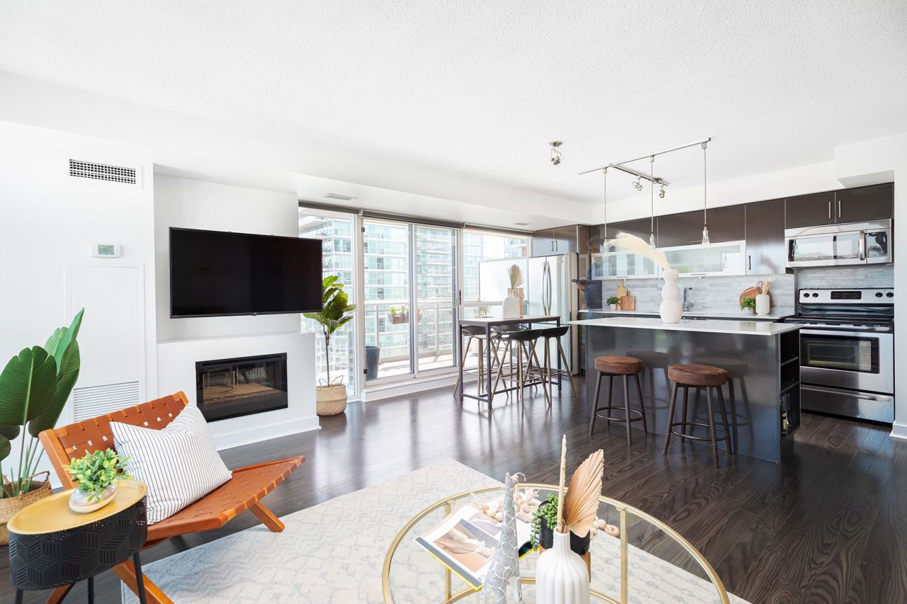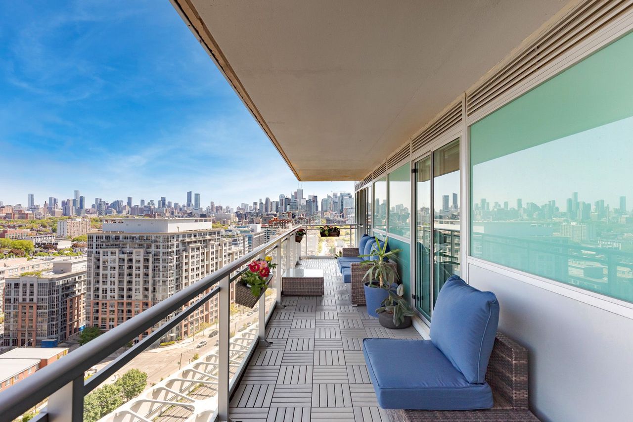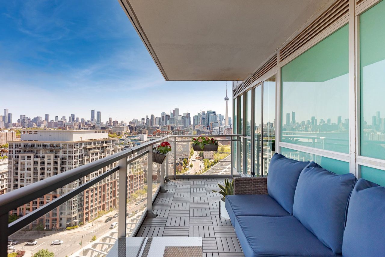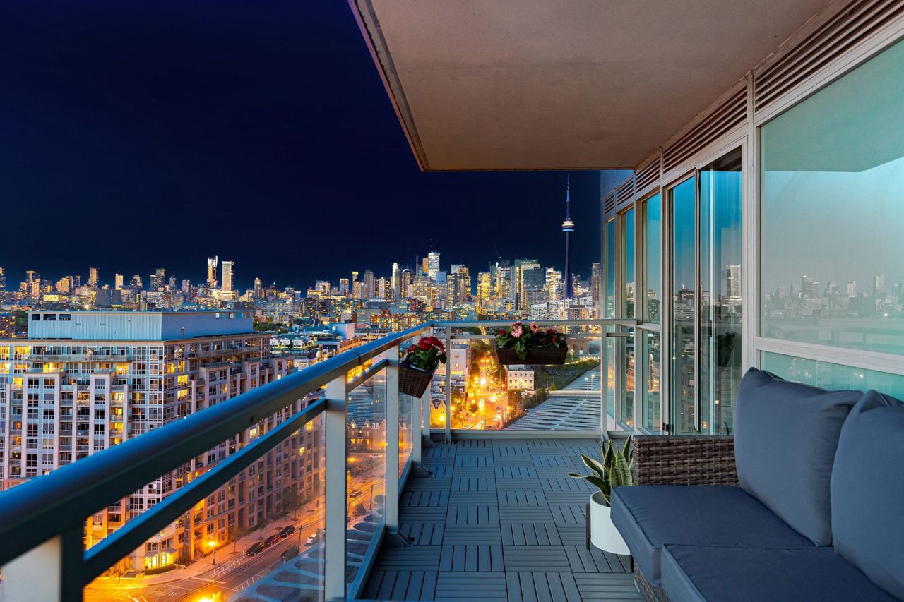 Welcome to the Vibe Building in the Heart of Liberty Village! This rarely offered 2 bedroom, 2 bathroom Corner Unit is a must-see. With not One, but Two balconies you'll have over 200 sq ft of outdoor living space with Balcony Access From Every Room. Wake up to stunning city views then enjoy your morning coffee while savouring the Million Dollar CN Tower Cityscape Views. Unwind & Cozy up by the fireplace and soak in all the modern finishes this condo exudes. The open concept living space shows off its Style with a sophisticated Kitchen, offering Full Sized Stainless Steel Appliances, an Island with ample Space for seating & dark gleaming floors throughout. You'll be spoiled with the convenience of ensuite laundry, your very own privately Owned parking space with Bike Rack and an Owned locker... providing ample storage. Here's Your Opportunity to Embrace the Liberty Village lifestyles and call one of Toronto's most sought-after neighbourhoods home.King / Liberty Bridge is literally right at your front door! So King St is just a few steps away. Plus all of Liberty's vibrant local pubs, bars, restaurants, Budweiser Stage, BMO Fields & Exhibition Station/Fairgrounds in your backyard