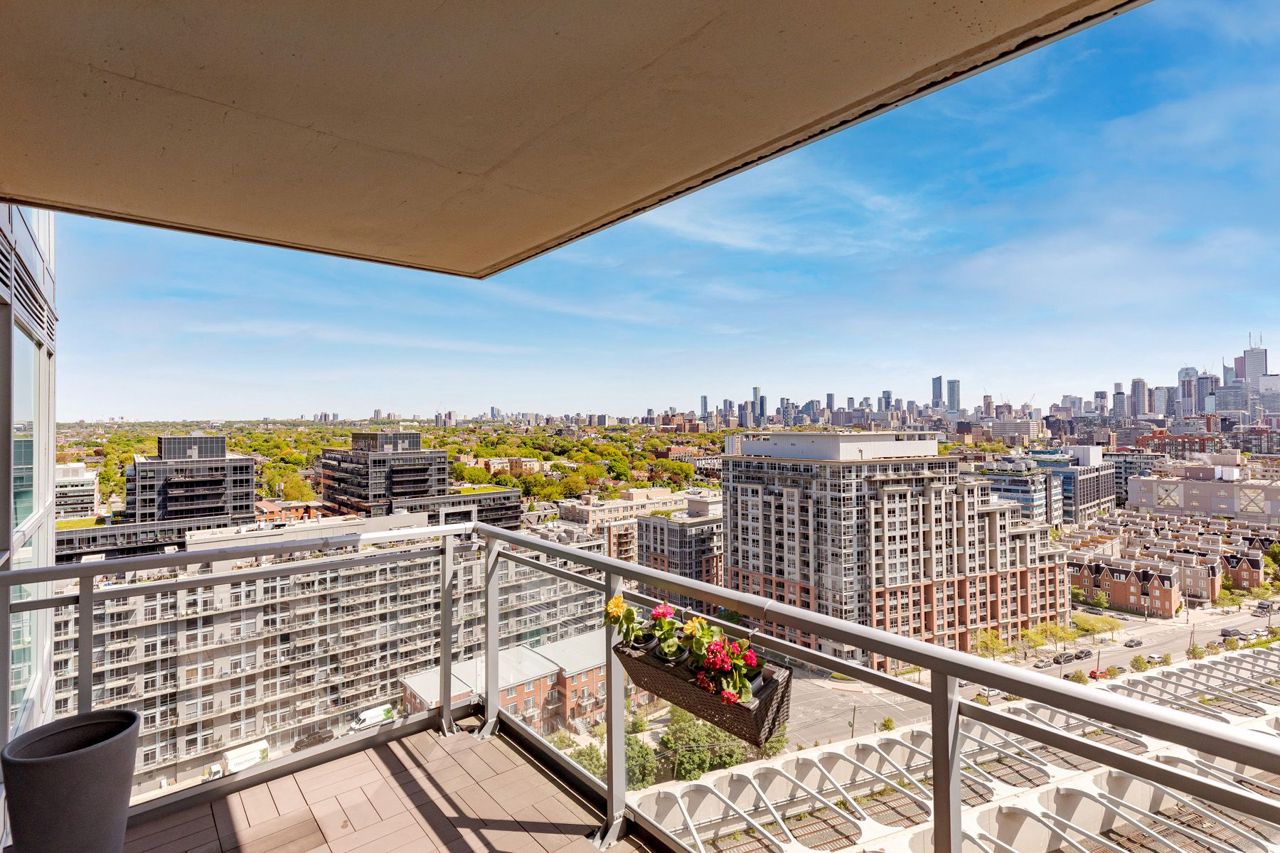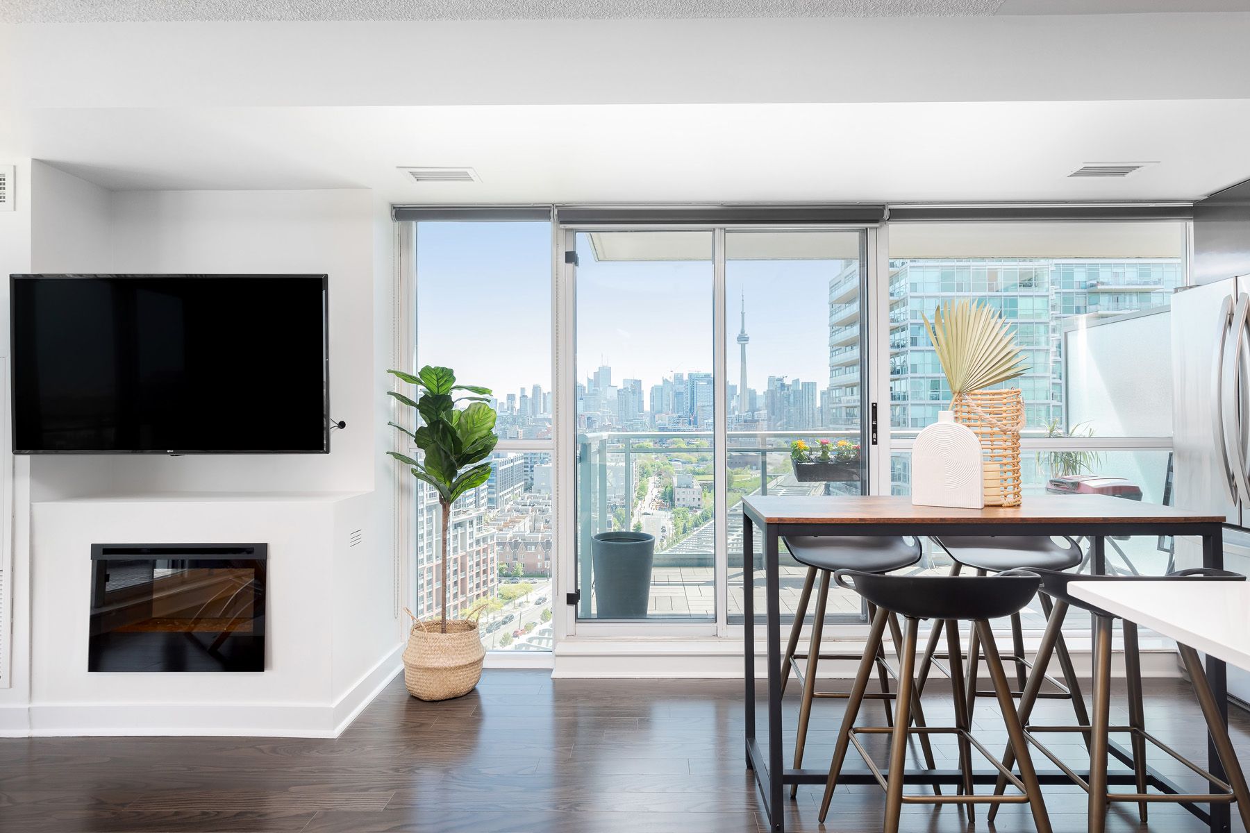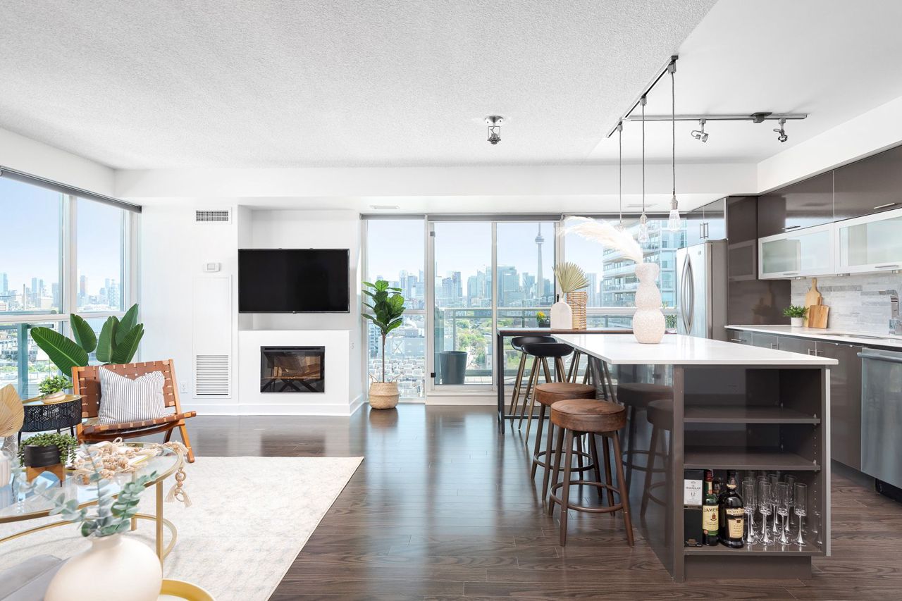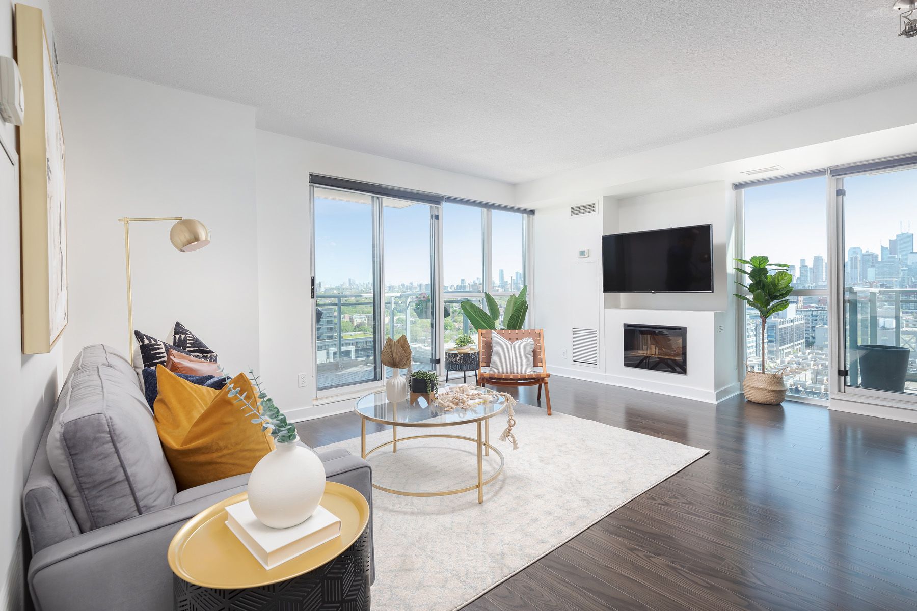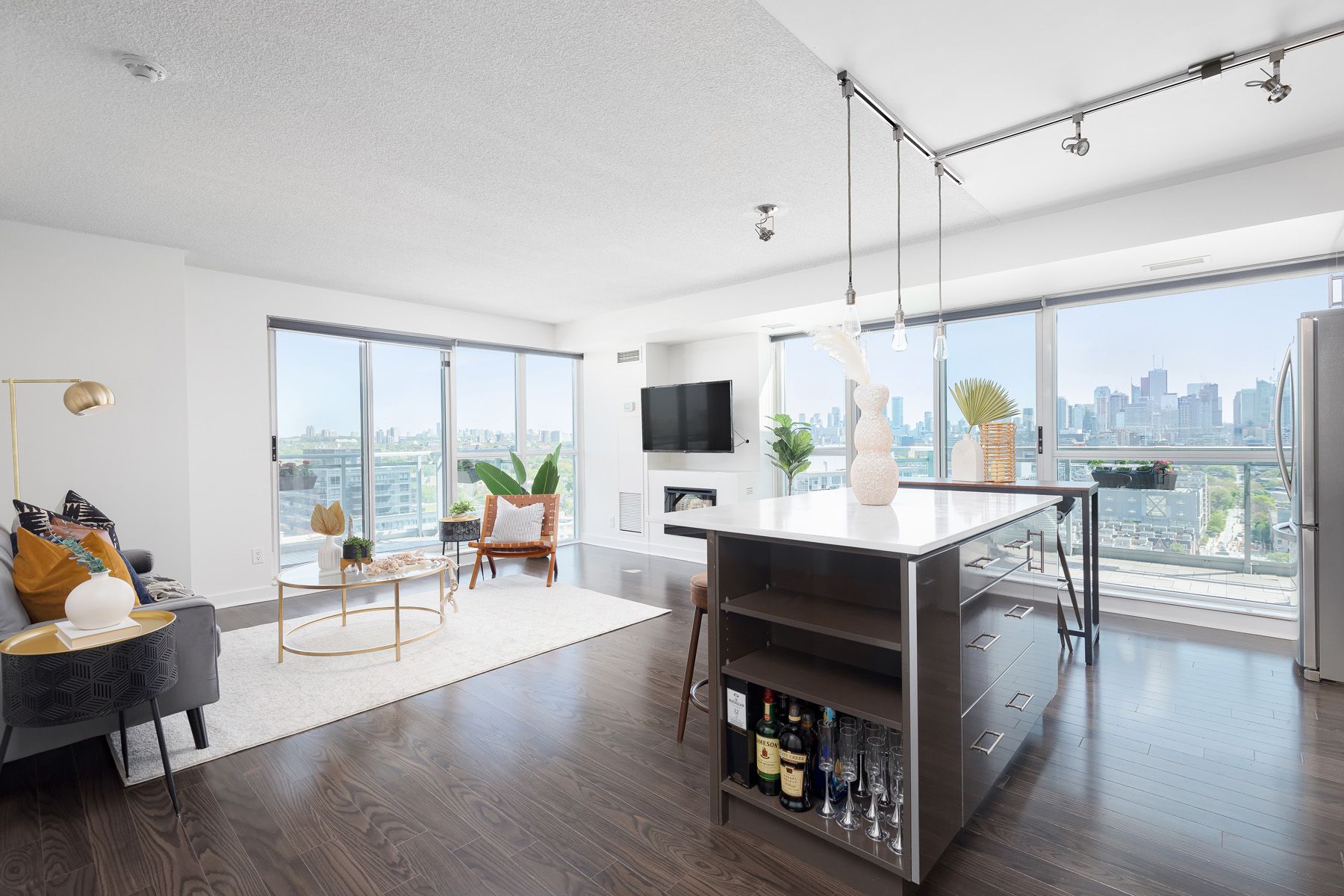 Welcome to the Vibe Building in the Heart of Liberty Village! This rarely offered 2 bedroom, 2 bathroom Corner Unit is a must-see. With not One, but Two balconies you'll have over 200 sq ft of outdoor living space with Balcony Access From Every Room. Wake up to stunning city views then enjoy your morning coffee while savouring the Million Dollar CN Tower Cityscape Views. Unwind & Cozy up by the fireplace and soak in all the modern finishes this condo exudes. The open concept living space shows off its Style with a sophisticated Kitchen, offering Full Sized Stainless Steel Appliances, an Island with ample Space for seating & dark gleaming floors throughout. You'll be spoiled with the convenience of ensuite laundry, your very own privately Owned parking space with Bike Rack and an Owned locker... providing ample storage. Here's Your Opportunity to Embrace the Liberty Village lifestyles and call one of Toronto's most sought-after neighbourhoods home.King / Liberty Bridge is literally right at your front door! So King St is just a few steps away. Plus all of Liberty's vibrant local pubs, bars, restaurants, Budweiser Stage, BMO Fields & Exhibition Station/Fairgrounds in your backyard