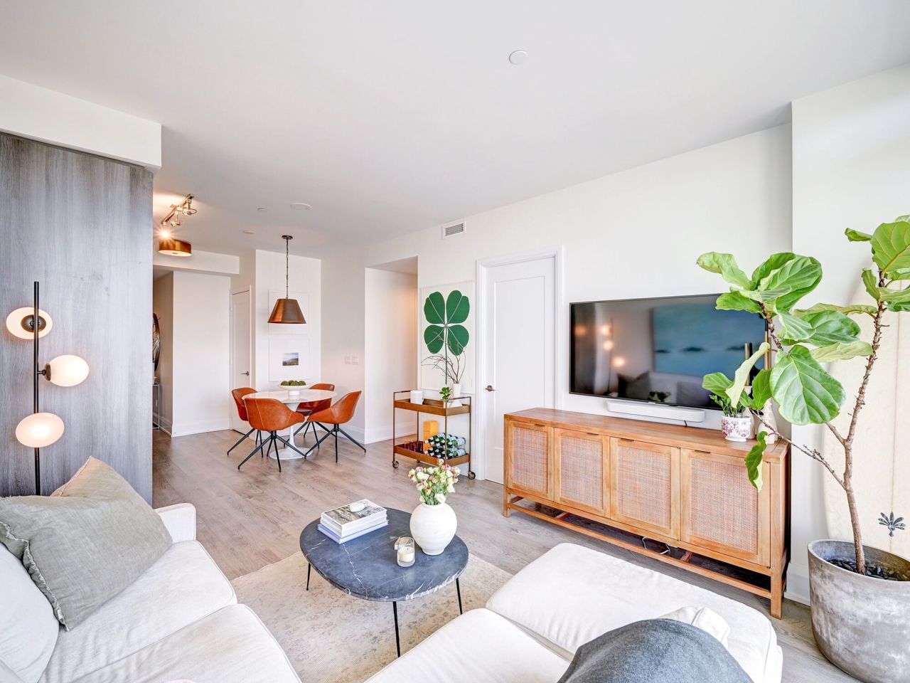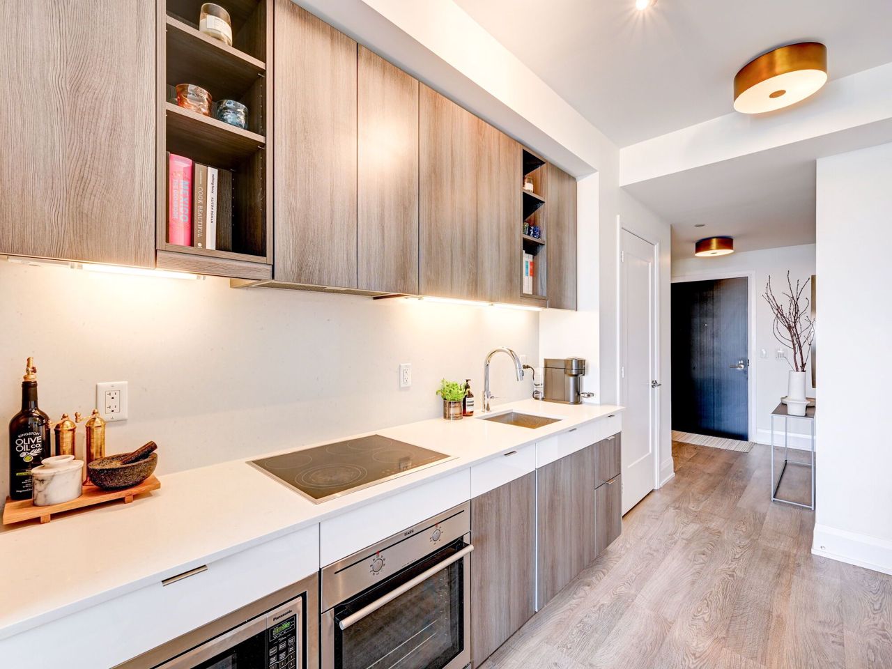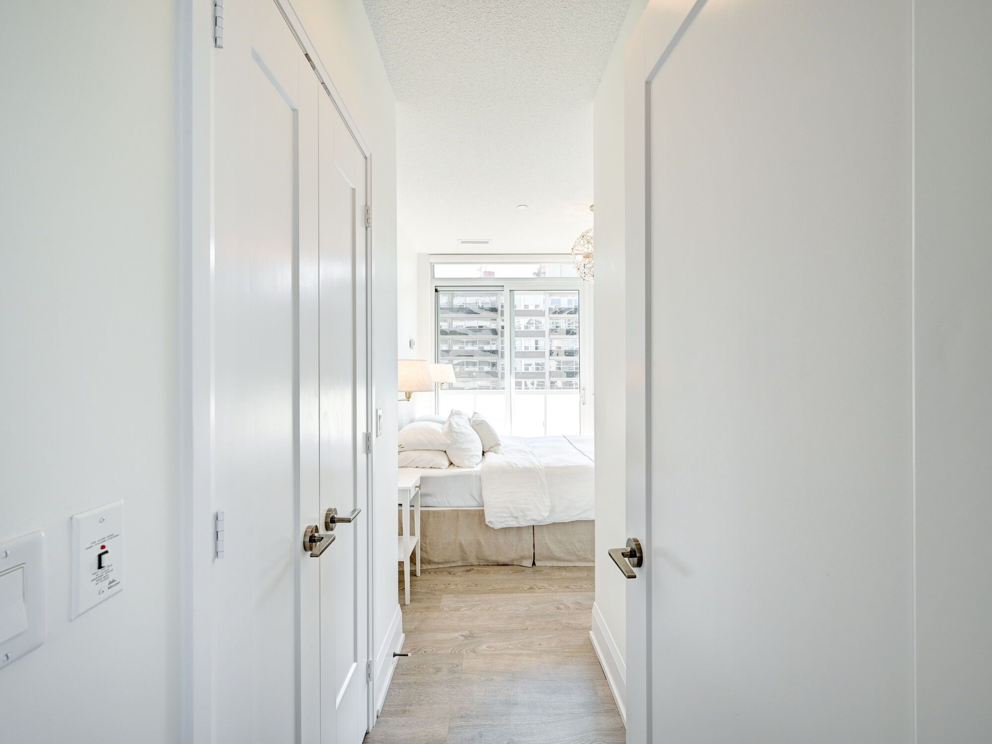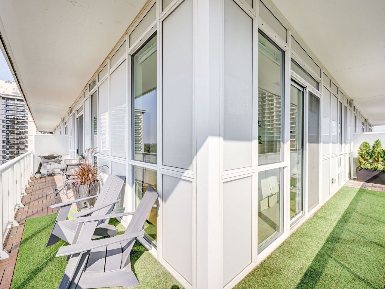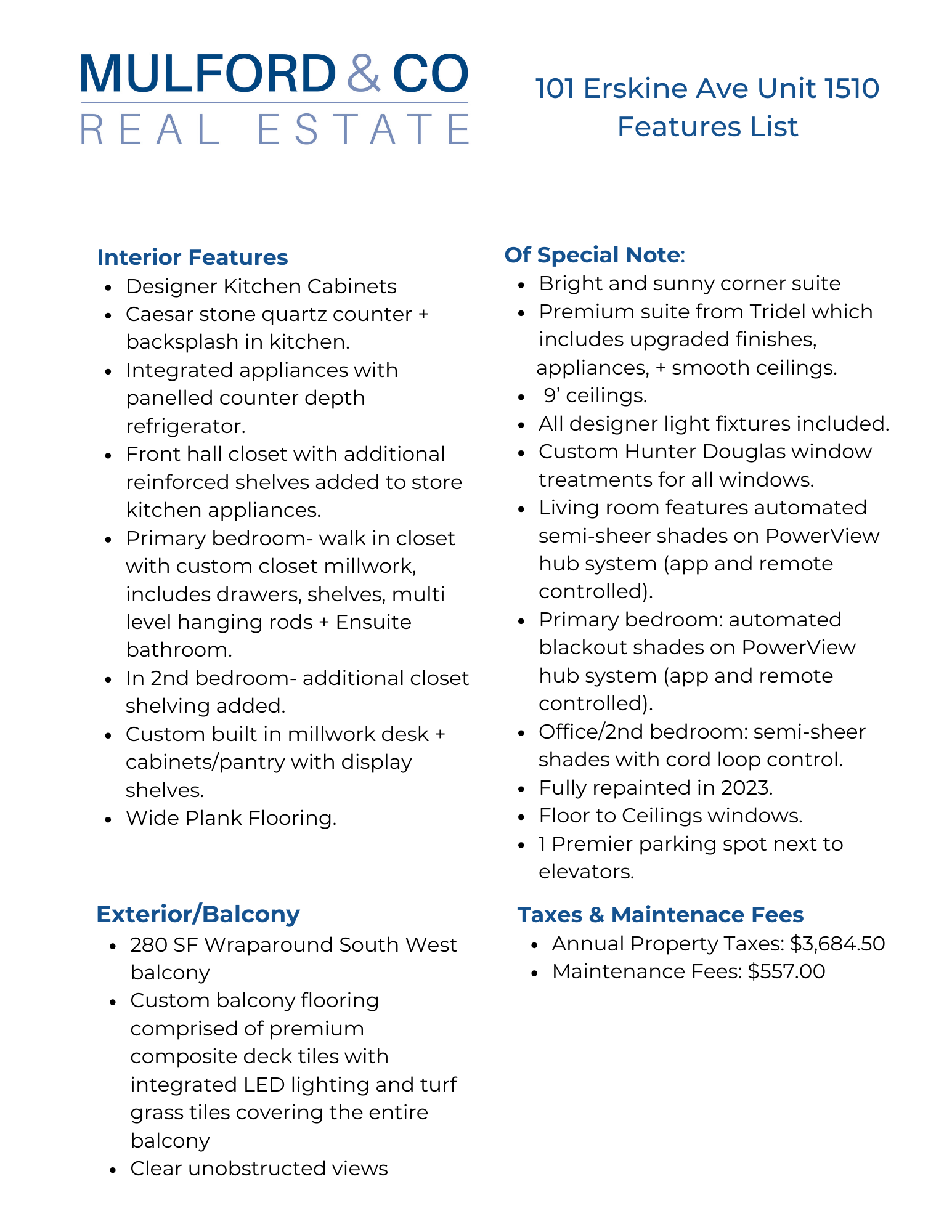 South West Facing, Designer Two Bedroom Two Bathroom Corner Unit! Totally Luxurious and Loaded With Extensive Upgrades & Builder Premium Package! Sunny 280 SF Wrap Around Balcony With Clear Unobstructed View! Kitchen Features Panelled Cabinetry, Premium Quartz Ceasarstone Counters & Black Splash. Smooth 9' Ceilings! Custom Millwork & Built- In Desk in 2nd Bedroom. Primary Bedroom Features A Walk-in Closet, Closet Organizers & Ensuite! Amazing Storage! Hunter Douglas Blinds W/Remote. Parking Spot Next To Elevators! Tridel Built Quality Building With Resort Style Amenities! Walking Distance to Restaurants & Transit!Custom Hunter Douglas Blinds W/ Remote, High End Light Fixtures, Custom Cabinetry & Built-Ins. Smooth 9' foot Ceilings , 280 SF Wrap Around Balcony W/ Premium Composite Deck & Turf Grass Tiles! Integrated LED lighting! Upgraded Appliances