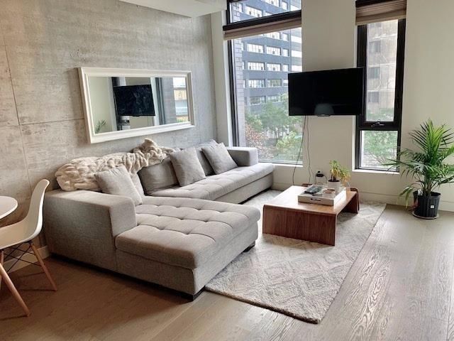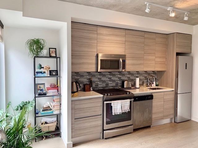 Great Location In The Heart Of King And Queen West! One Bedroom, Hardwood Flooring Throughout W/Modern Finishes In Kitchen & Bathroom. Exposed Concrete Ceiling & Feature Walls. Gas Range, 9FtCeilings, Ensuite Stacked Laundry. Modern Loft Style. Easy Access To Hwys. Steps To Ttc (King, Queen Or Bathurst Streetcars), Restaurants, Shopping, Parks, Bars And Nightlife. 99 Walk Score. 100Transit Score.Stainless Steel (Gas Stove, Fridge, Microwave, Dishwasher) Stacked Washer/Dryer. Party Room, Roof Deck, Guest Suites. Concierge. Heat Pump is Rental.