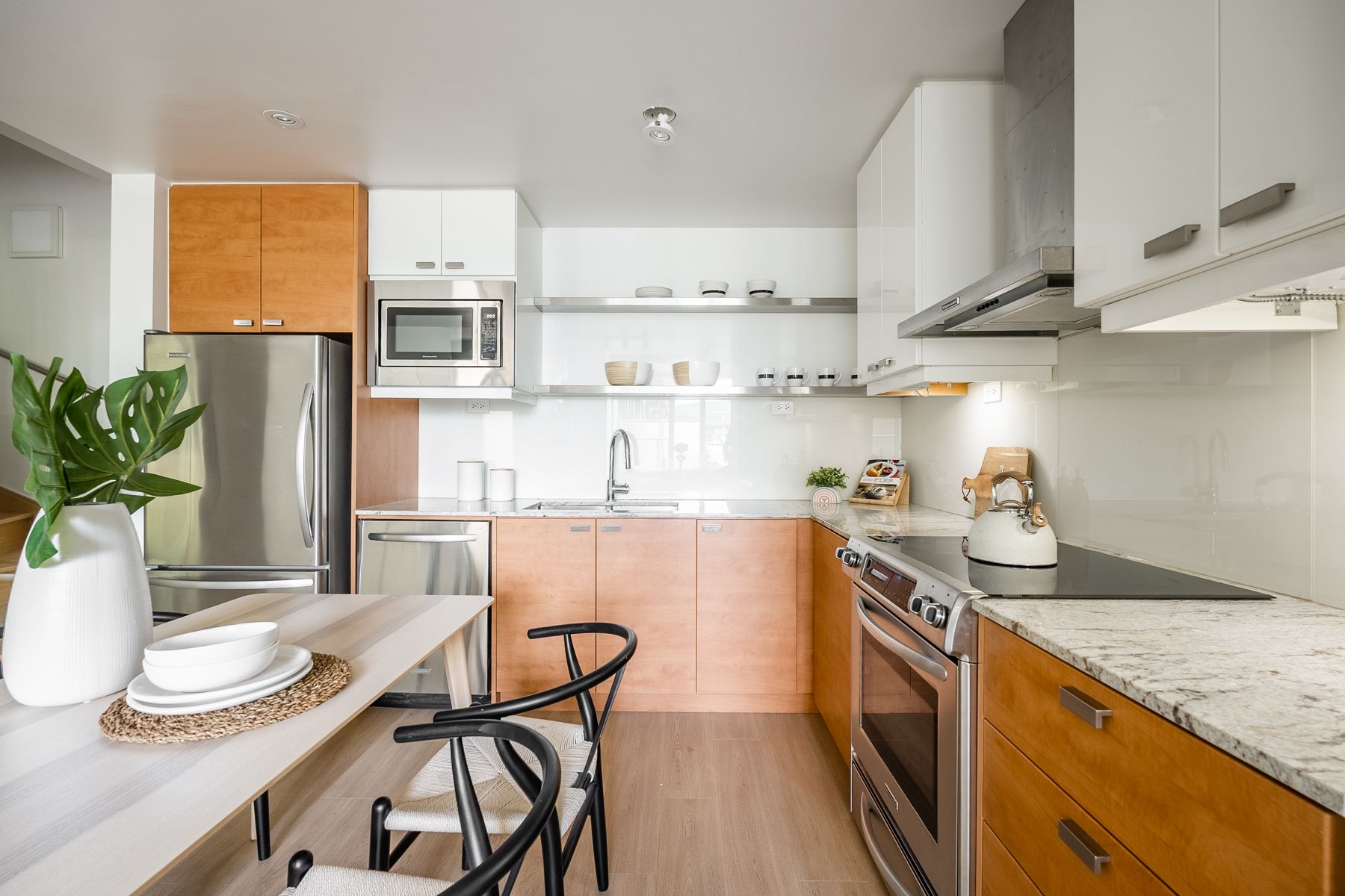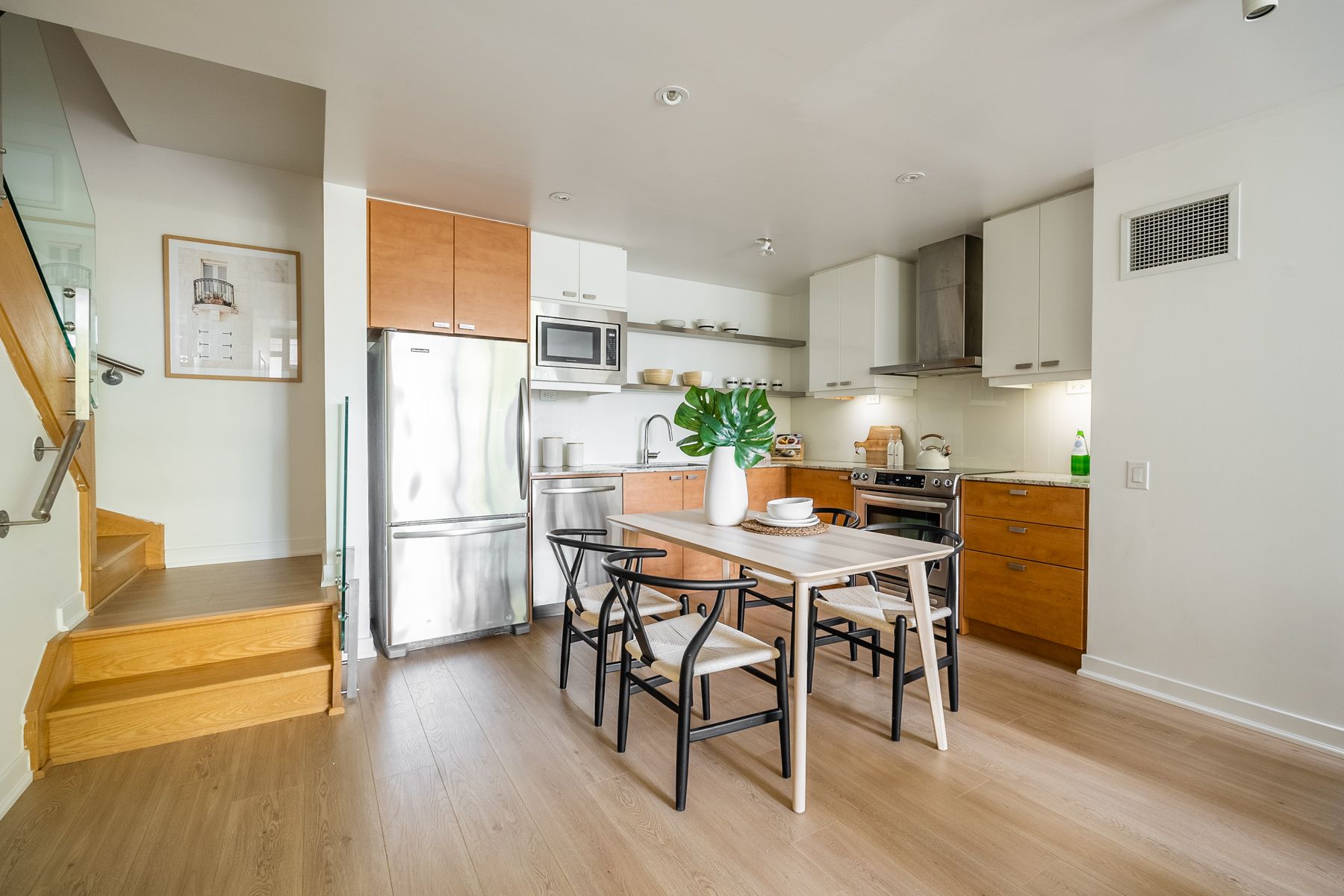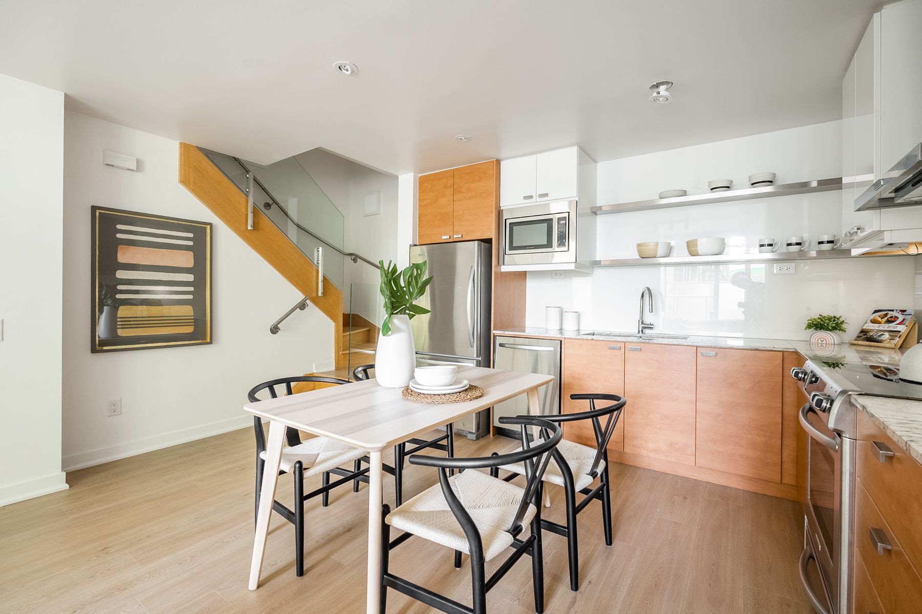 Newly renovated Luxurious Townhome At Bayview Village. Bright & Spacious. 9' Smooth Ceiling at main floor, Floor To Ceilings Window, 7.7" Wide high quality Flooring Throughout, Granite Counter Tops, S/S Appliance. $$$ Upgrades. Enjoy The Use Of Tango Amenities: Indoor & Outdoor Whirlpools, Cardio Rm, Weights Rm, Steam Rm, Party Rm, Guest Suites. Shuttle Bus Service. Walking Distance To Subways, Close To 401 & 404, New Neighbourhood Development Includes Parks And New Community Centre.Stainless Steel Fridge, Stove, Exhaust Hood Fan, Built-In Microwave, Built-In Dishwasher, Front Loading Washer & Dryer. All Elfs & Existing Window Coverings. One Parking And One Locker Included.