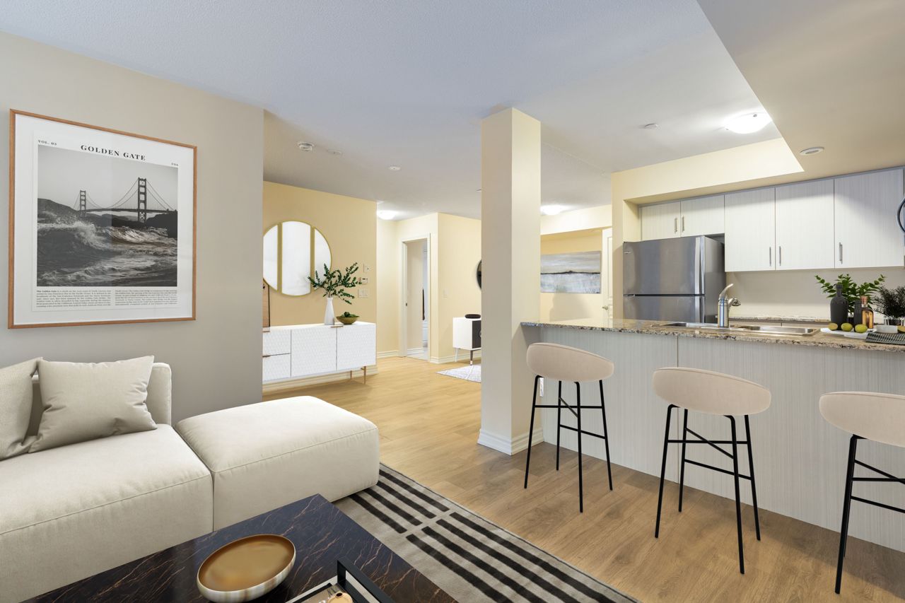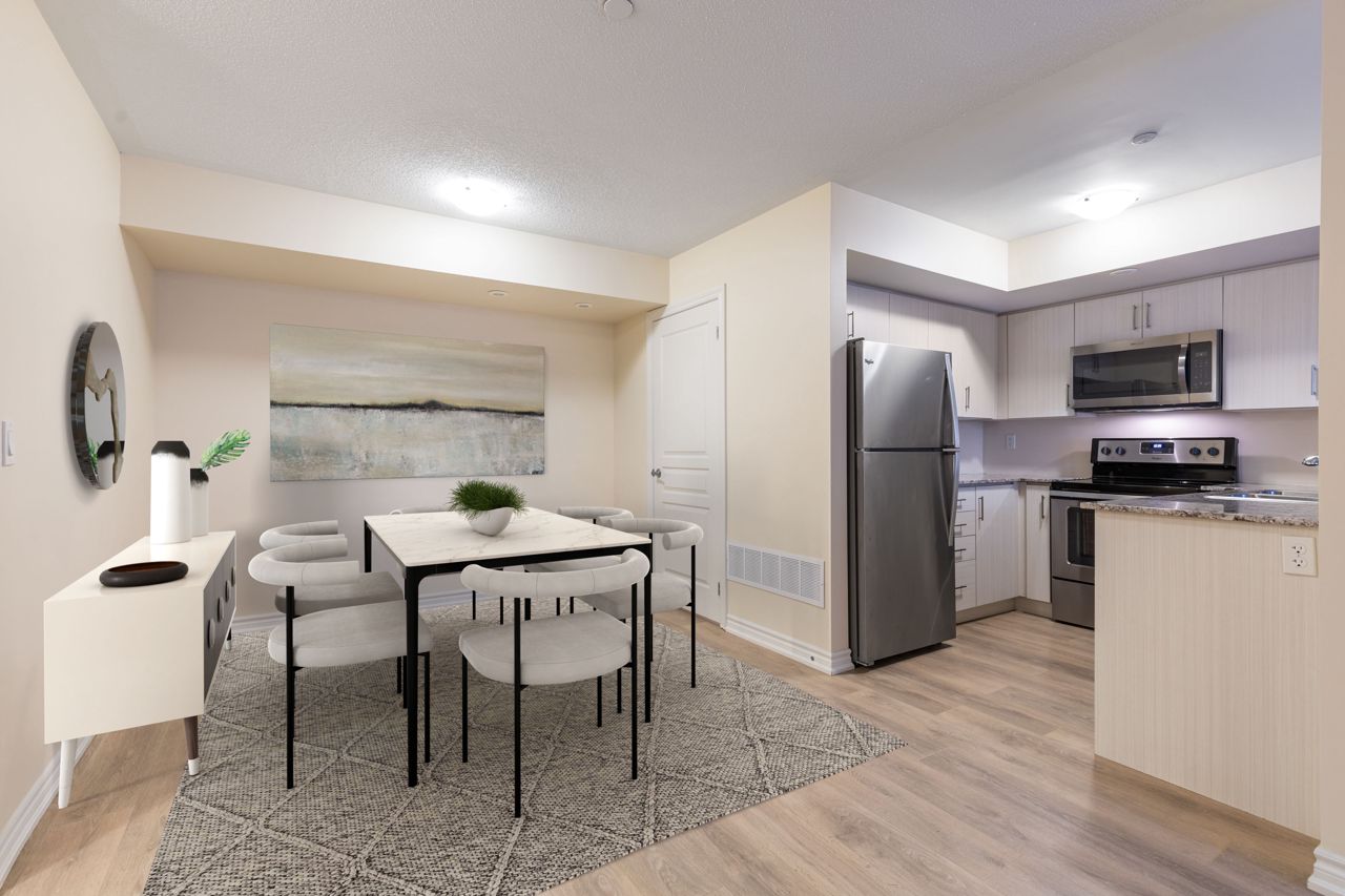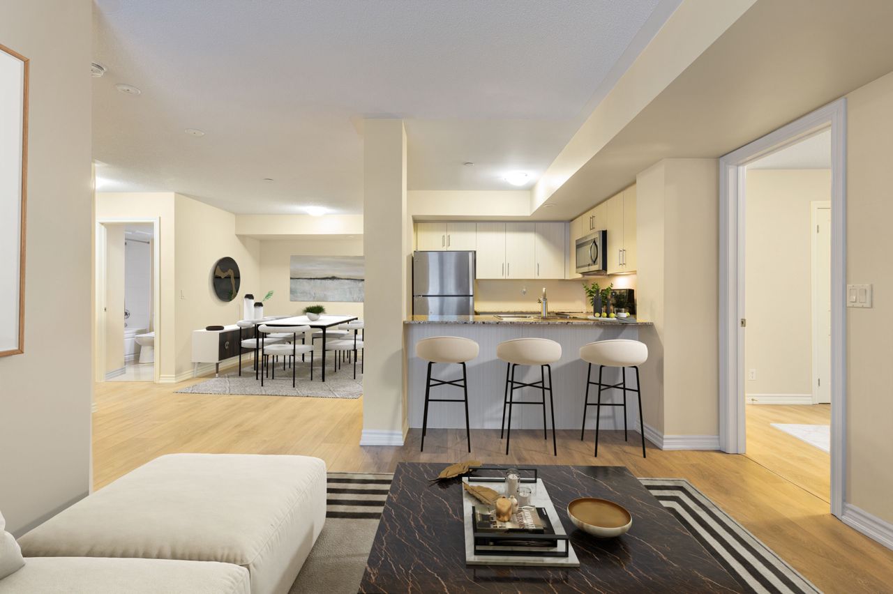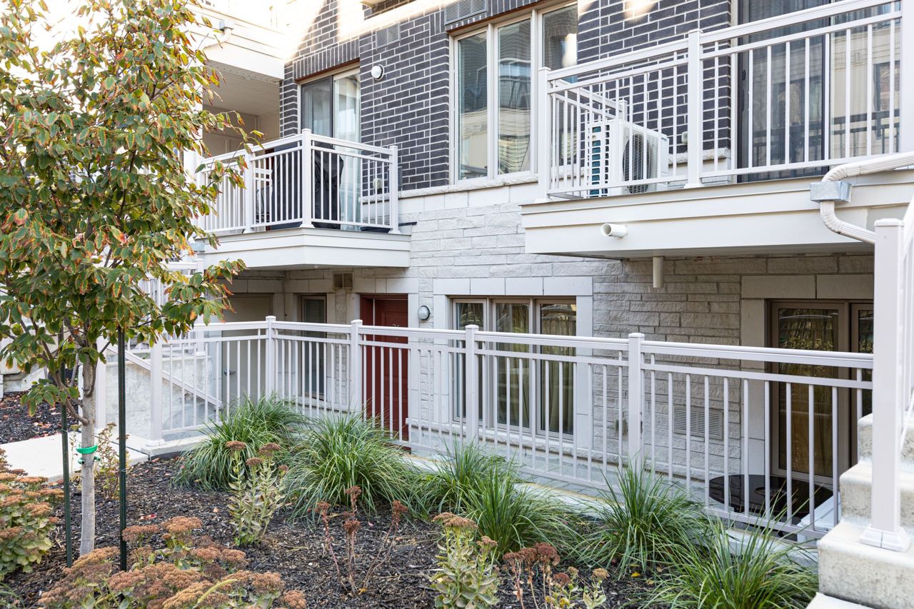 Nestled in a quiet, new Minto-built complex, this 2-bedroom, 2-bathroom home with split bedroom plan boasts 1077 sq ft of one-level elegance. Revel in laminate flooring, ceramic-tiled bathrooms, and a kitchen adorned with Whirlpool stainless steel appliances and soft-close drawers. Enjoy a spacious private patio, perfect for summer entertaining, and two large storage spaces. The home also features an upgraded full-wall foyer, ensuite laundry, and large windows for ample natural light. Location-wise, you're steps away from Starbucks, No Frills, Farm Boy, Shoppers Drug Mart, LCBO/Beer Store, banks, and eateries. The Long Branch GO Train is a short walk, and the TTC bus is a block away. Additionally, benefit from an underground parking spot and visitor parking. A blend of convenience and serenity awaits! *Interior is virtually staged * Patio runs in front of unit; **2 storage lockers** (at each end of patio).