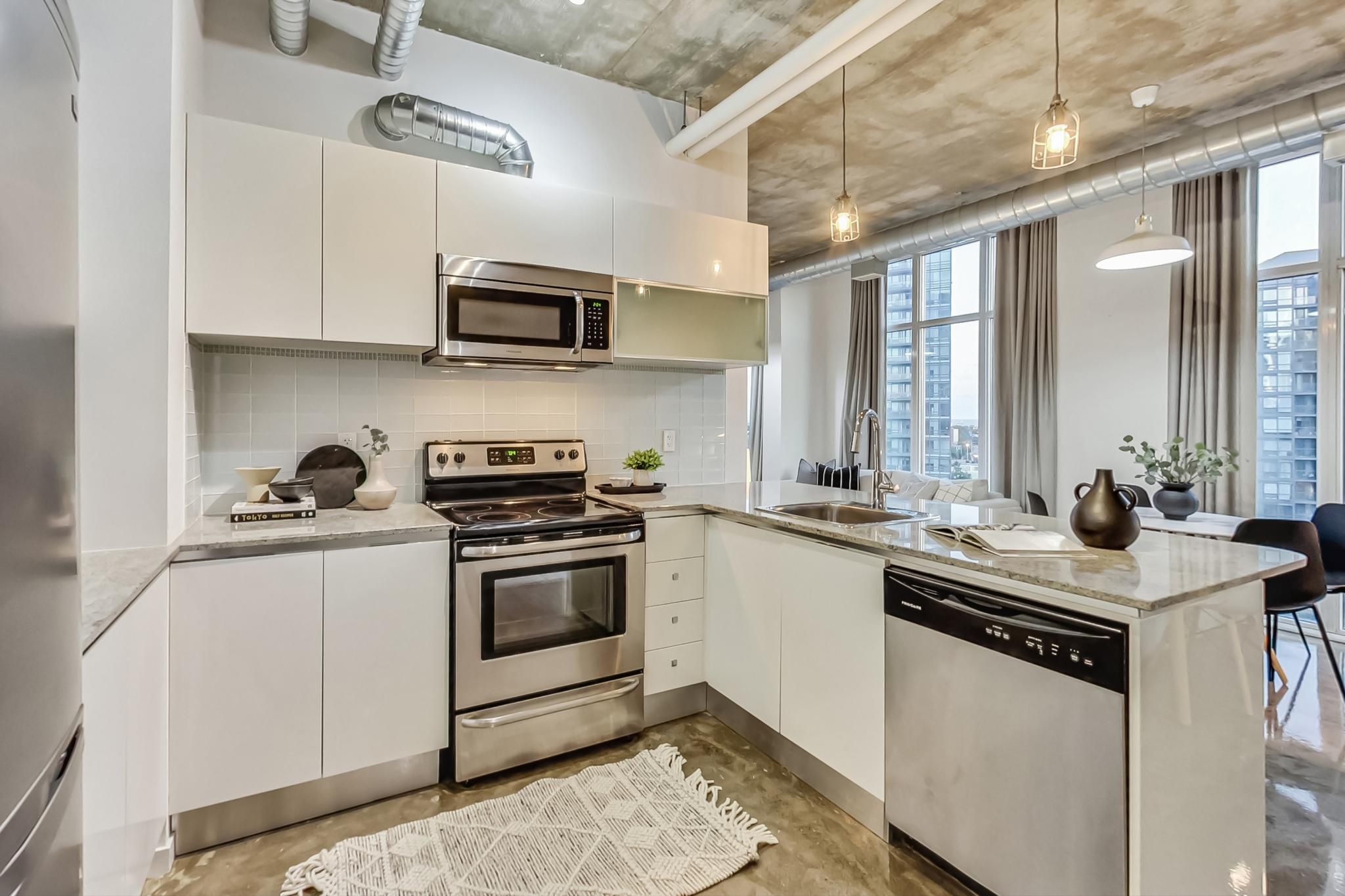 Spectacular south facing 2 bedroom 2 bathroom corner unit at Westside Gallery Lofts! Widely considered the building's best floor plan. Lots of natural light from over-sized floor to ceiling windows throughout. Soaring 10 foot ceilings. Unobstructed panoramic city views. Classic urban loft feel with exposed duct work and polished concrete floors. Large primary bedroom with huge walk-in closet and 4-pce ensuite. Upgraded kitchen with Scavolini cupboards, granite countertops and glass backsplash. Pet friendly building w/ green space nearby. The local shops, cafes and restaurants of this dynamic Queen West community will be the backdrop for the story of your new life in this vibrant neighbourhood.Pet friendly. Transit at your door. Steps to the area amenities. Easy access to Billy Bishop airport, Gardiner Expwy, Trinity Bellwoods