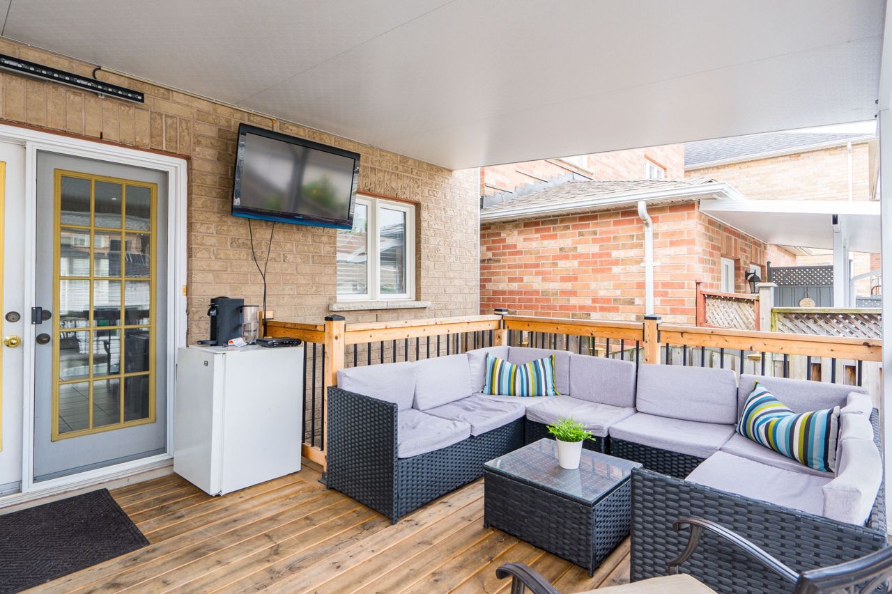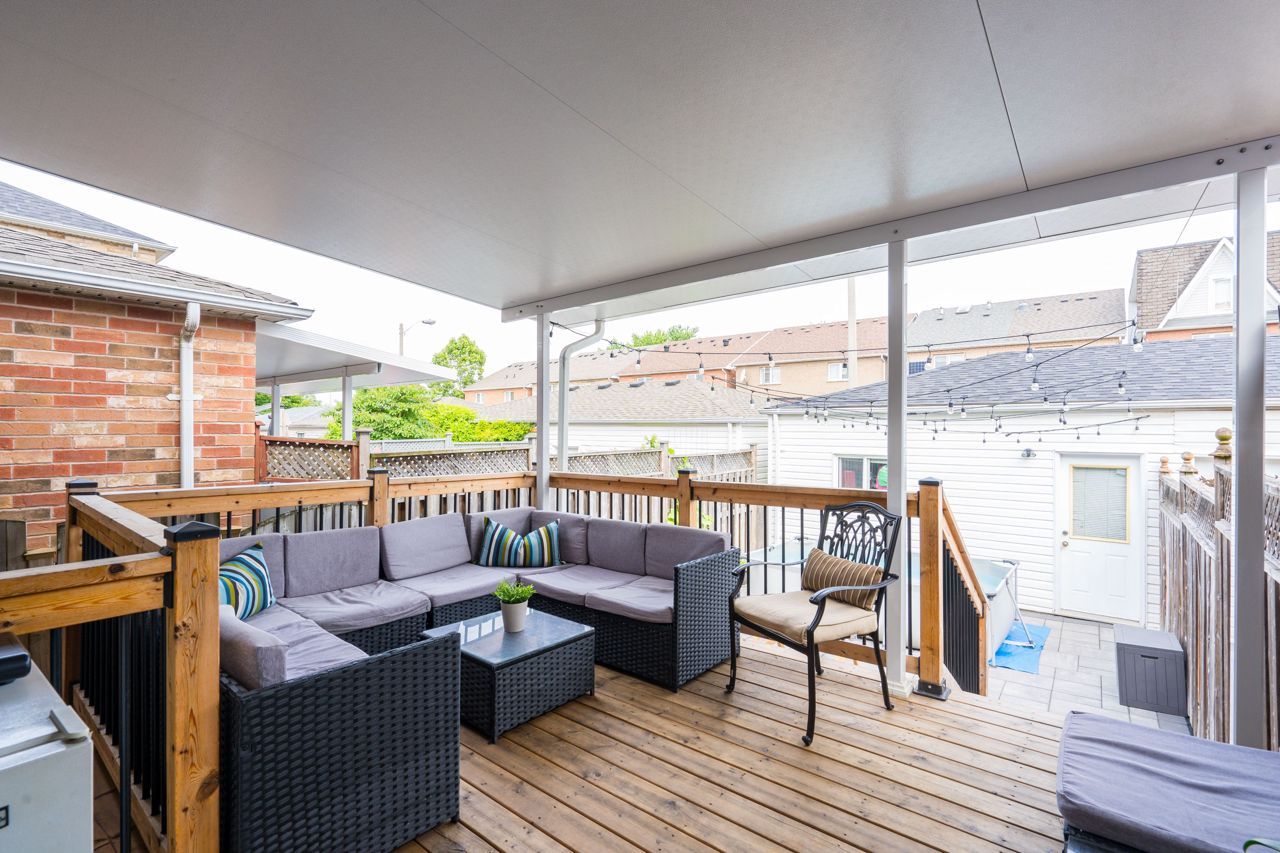 Welcome to 18 Estoril Terrace! This charming home is nestled in Toronto's hidden gem of Turnberry Gardens and is designed for comfort and convenience, making it perfect for families and entertainers alike. The main floor opens to a foyer with tile floor and closet, an open concept living room/dining room layout with elegant strip hardwood floors, and a convenient powder room. The family-sized kitchen is a chef's delight, featuring ample counter space and modern stainless steel appliances. The kitchen leads to a large covered deck and an interlocked backyard, ideal for hosting gatherings and enjoying outdoor living. You'll find a bright and airy space on the second floor thanks to a well-placed skylight. The large primary bedroom features wall-to-wall mirrored closets with built-in organizers, providing plenty of storage. Two additional spacious bedrooms and a 4-piece bathroom complete this level, offering comfortable living for the whole family. The basement, with its separate entrance, is perfect for an in-law suite or a basement apartment. It includes a living room, an additional bedroom, a 4-piece bathroom, and a rough-in for a kitchen, providing flexibility for various living arrangements. There's also a cantina for extra storage or a wine cellar. The property includes a detached double-car garage off the lane, with the potential for converting it into a laneway house, adding even more value and versatility to this already impressive home. This home is close to parks, all essential amenities, and just a short bus ride to the subway. This home offers a blend of comfort, convenience, and potential that is hard to beat. Don/t miss out on this incredible opportunity!