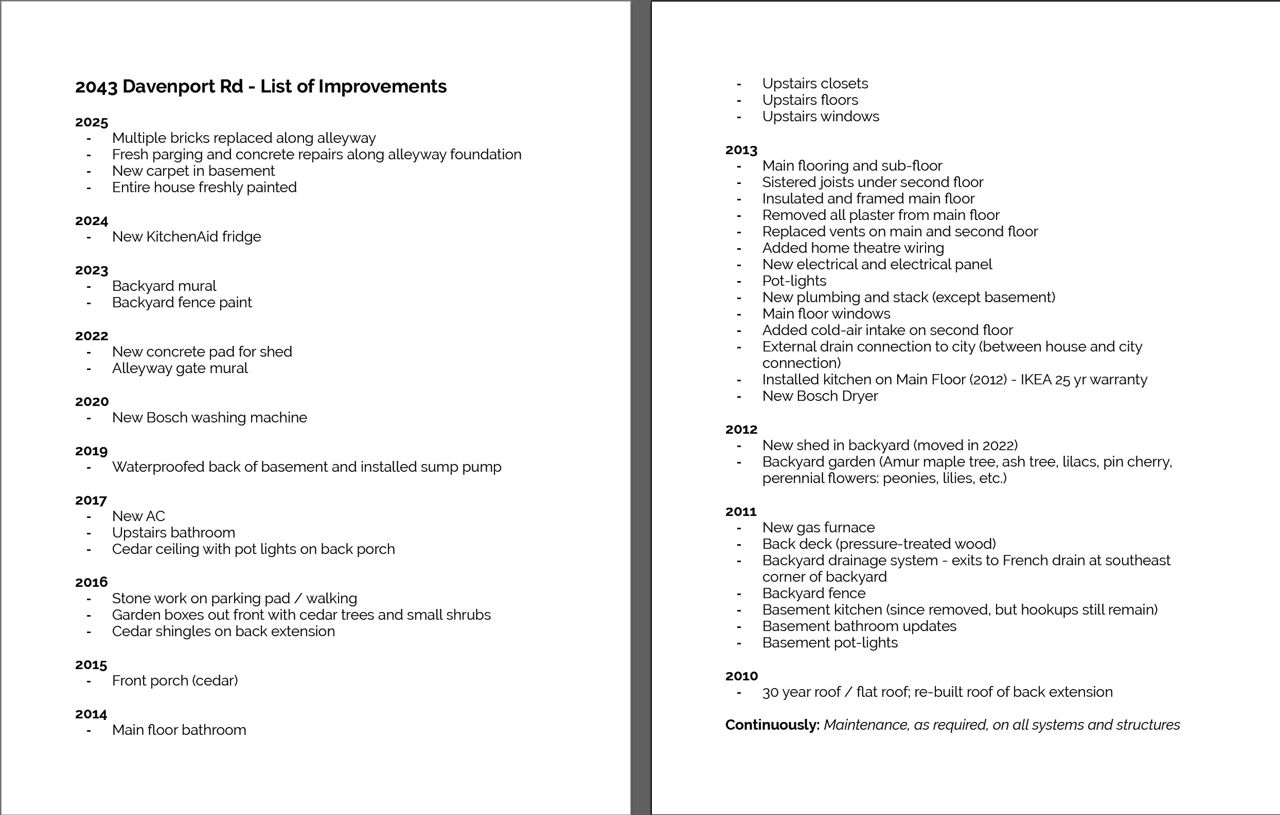 戴文波特路上的珍宝;这座时尚的住宅有积极的卖家,现已可入住!经过深思熟虑的升级和一丝不苟的维护,这座4+1卧室、3浴室的住宅提供了您意想不到的更多空间、风格和宁静。 拥有稀有合法的门前停车位,您将始终拥有停车位。 进入室内,很容易忘记您身处主干道。 几乎每个窗户都框出了绿色植物,而不是城市景观。 这个空间安静祥和,充满了侧街的氛围。 主楼层,具有暴露的砖墙、高天花板和天然硬木特色,拥有宽敞的开放式起居/餐饮区,有足够的空间舒展身躯、娱乐和成长。 无论是舒适的夜晚还是盛大的节日晚餐,这座住宅都能轻松温暖地处理一切。 升级后的厨房通往主楼层的洗手间,然后通向宽敞而深邃、完全围栏的后院。 带有花园棚、多年生植物、酷炫的定制壁画和大型甲板,这个空间非常适合周末休闲、娱乐或让宠物自由漫步。 在楼上,您将找到四个大卧室,带有一个4件式家庭浴室,以及大量的走廊储物空间。 完成的地下室设有独立的入口、完整的浴室、大卧室和洗衣房,可以改造成厨房,为未来提供岳父母房间或潜在的租金收入。 与隔壁的砖墙不同,朝西的窗户全年都能带来下午的阳光。 它确实是城市中的一处隐蔽的绿洲。 这一处住宅的独特之处在于家庭友好的社区。 位于卡尔顿村和交汇三角区的中心地带,步行即可到达沃斯沃思公园、卡尔顿村体育学院、圣保罗六世天主学校,以及一个紧密、热情和安全的社区。 UP Express、自行车道和Railpath 都在附近, 斯泰尔西角、交汇处和仓库区最好的地方都在拐角处。 安静、现代且维护良好,这座现代、永恒且可立即入住的住宅是为生活、聚会和生根发芽而建造的。 来看看它,相信它!