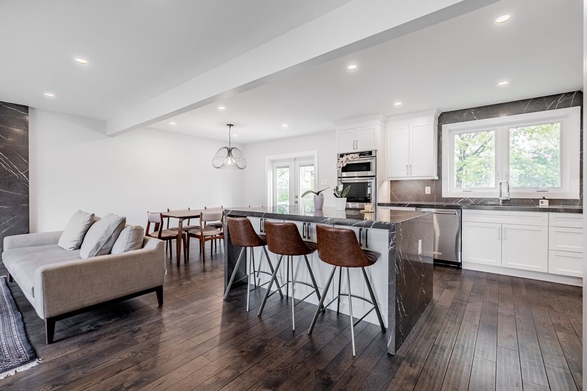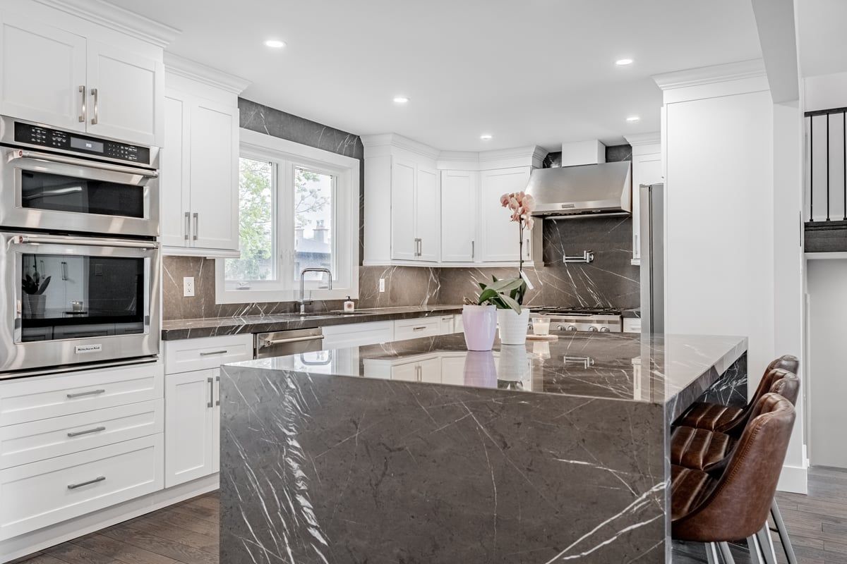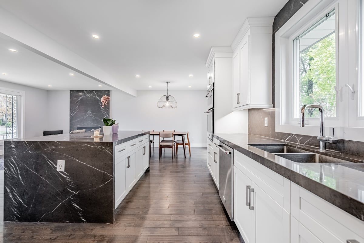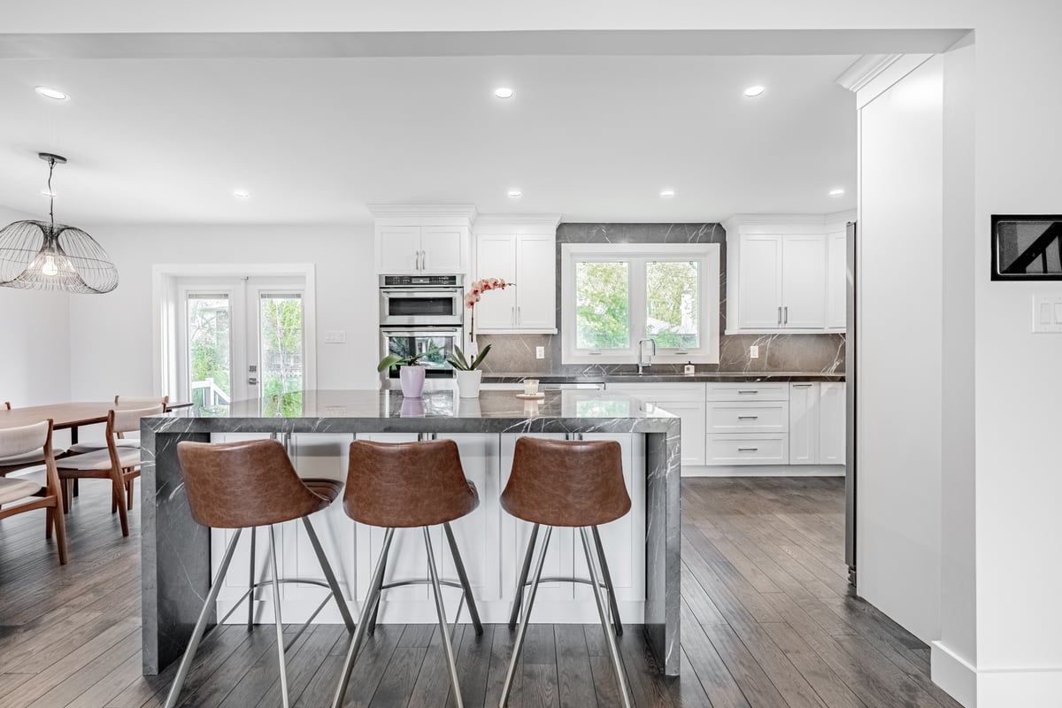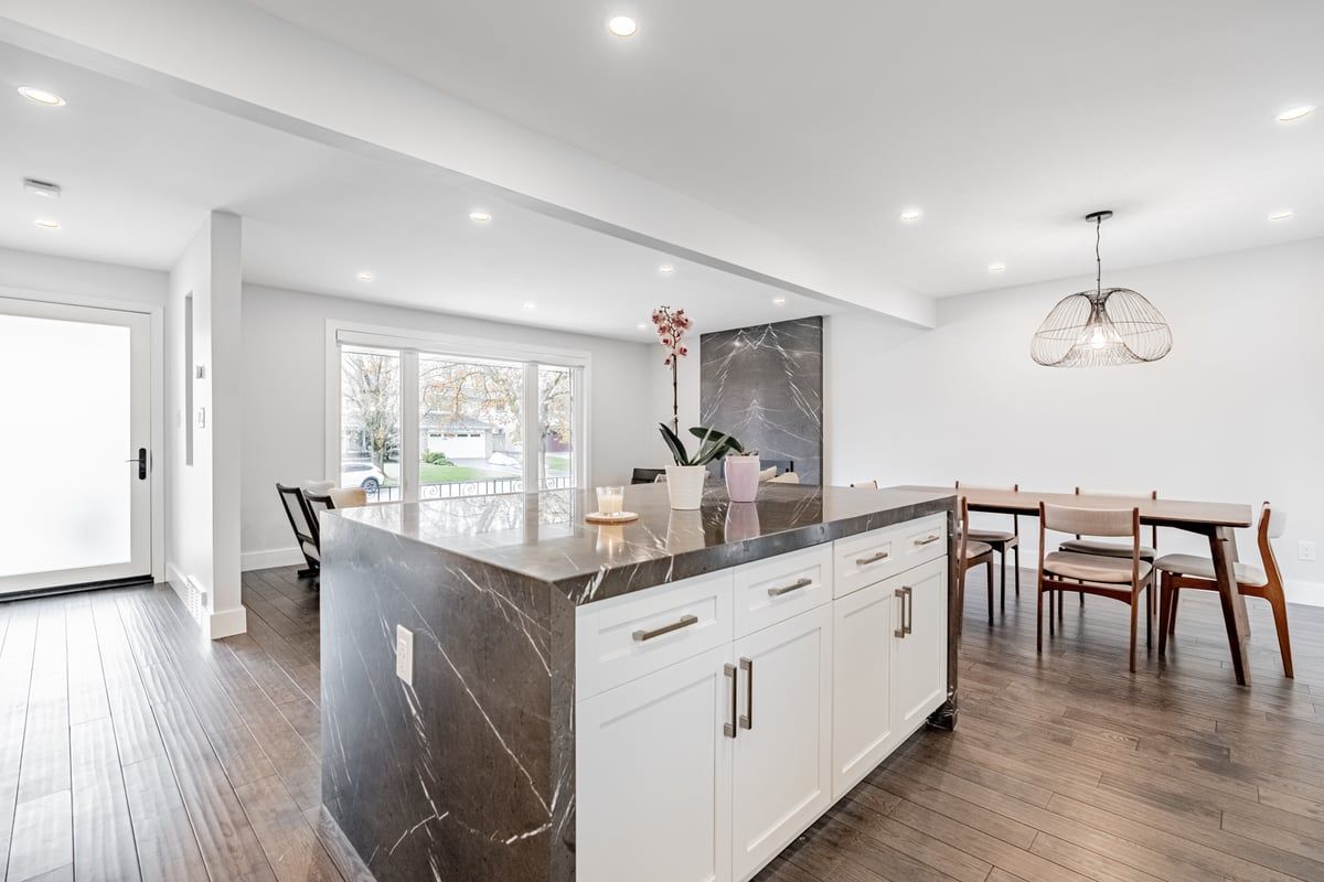 Child-Friendly Street. Open Concept Custom Kitchen with waterfall Island, custom granite counters