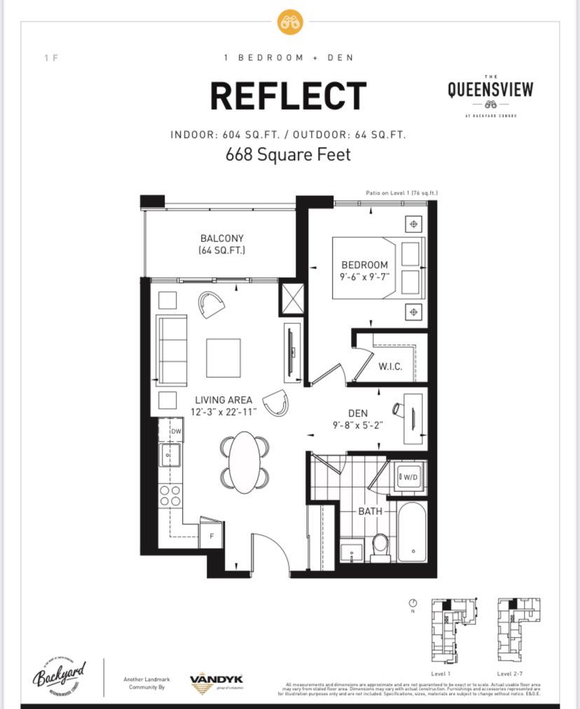 Welcome To The Desirable "Queensview - Backyard Condos" Development By Vandyk Properties. This Well Appointed, "Reflect" Model Is A Modern 1+1 Bedroom Unit Boasting 10' ceilings, Laminate Floors, Stainless Appliances, Ceaserstone Countertops, Valance Lighting, Backsplash And An Open Concept Layout With An Abundance Of Natural Light. A must see!604 sqft, 64 sqft balcony