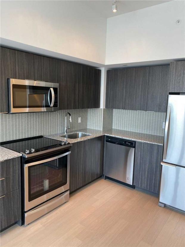Beautiful & Bright 1Bed, 1Bath Unit Located In The Luxurious Waterfront Eau Du Soleil Condos-Toronto's Exquisite Waterfront Address Boasting Endless City & Lake Views, & Resort-Style Amenities. This Functional Layout Features Hardwood Floor Throughout, Two-Point Balcony Access From Living & Bdrm, Upgraded Primary Br W/ W/I Closet. Enjoy Stunning Unobstructed Sunset Views From Private Balcony. Perfectly Located Close To Highways & 10Min Drive To Downtown. S/S Full Size Appliances: Fridge, Stove, B/I Microwave, Dishwasher, Stacked Washer & Dryer. 1 Parking & 1 Locker Included. Resort-Style Amenities: Games Room, Saltwater Pool, Lounge, Yoga & Pilates Studio, Garden & Party Room.