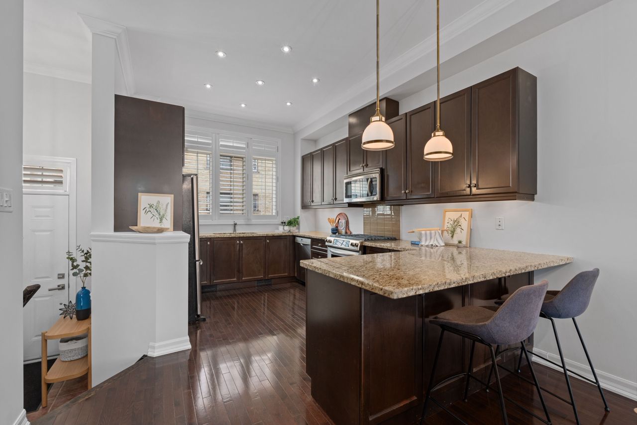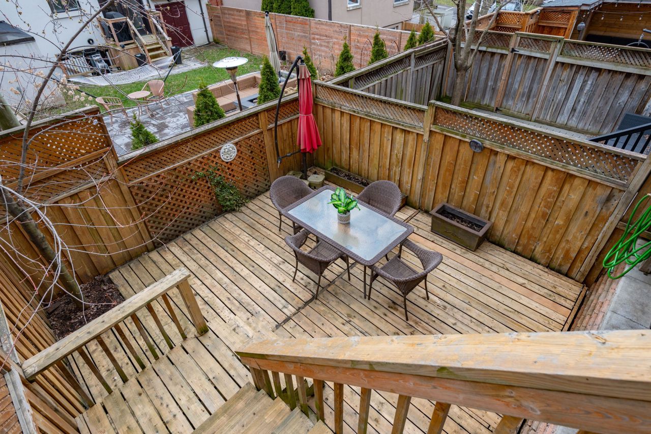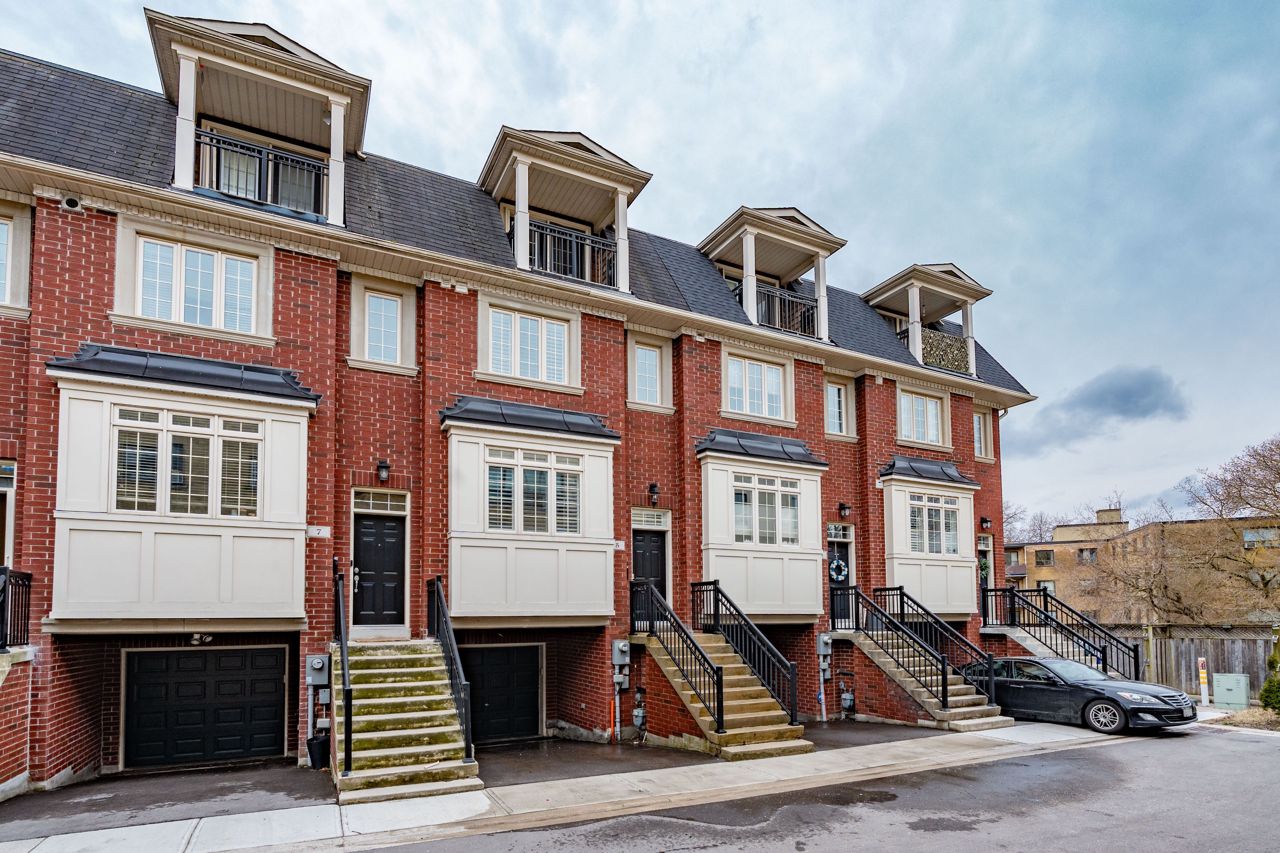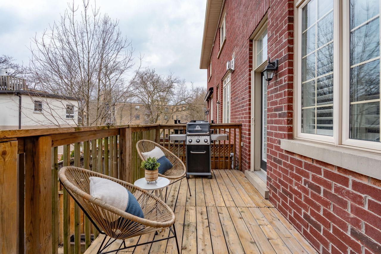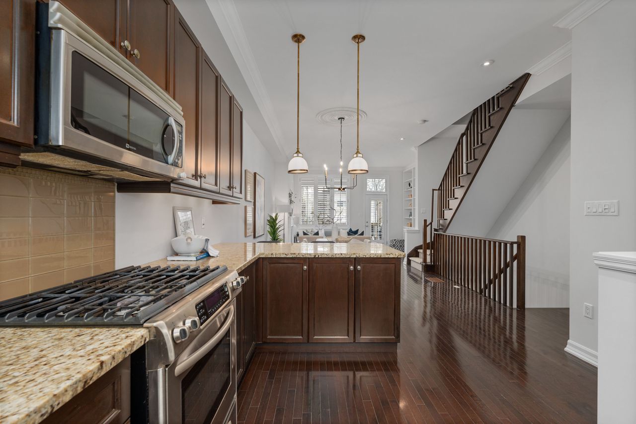 Elegant and rarely available Georgian-inspired 3-bed freehold townhome, tucked away in one of the City's most coveted hidden pockets. Nearly 2,000 sq ft of sleek, functional living space across four levels with a bright, fresh paint job. The main floor brings the wow factor with 10-ft ceilings, hardwood floors, custom built-ins and a gas fireplace all drenched in natural light. The oversized kitchen is built to perform: granite counters, stainless steel appliances, serious storage, and a no-nonsense breakfast bar. The top-level primary suite is your private escape with a walk-in closet, luxe ensuite and balcony overlooking the treetops. Two more large bedrooms, both with walk-in closets, plus a full bath and laundry on the second floor. Lower level rec room, powder room, and direct garage access = total convenience. Out back? A private decked-out yard with tiered entertaining space and low-maintenance gardens. Plus, a new hot water on-demand heating system. Steps to Queen East, transit, top schools, and the boardwalk. Zero fluff. All vibe.