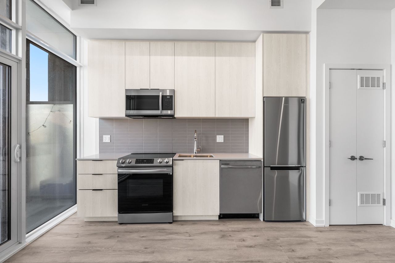 Beautiful 'Home on Power' Condos! This bright and modern 1 bedroom unit is located in the ultra hip Corktown/Moss Park community. Built by reputable and award winning Great Gulf x Hullmark. 9 ft ceilings, sleek European style kitchen, new laminate flooring and freshly painted. 1 locker unit included in your lease. Conveniently located close to grocery stores, coffee shops, eclectic restaurants and park across the street. TTC at your doorstep. Quick access to King/Queen St, Distillery District, downtown core, Gardiner and DVP. Don't miss the fantastic opportunity to live here. Won't last!Stainless steel fridge, stove, built-in dishwasher, built-in microwave, front load washer and dryer, all electrical light fixtures, all window coverings. 1 locker unit.
