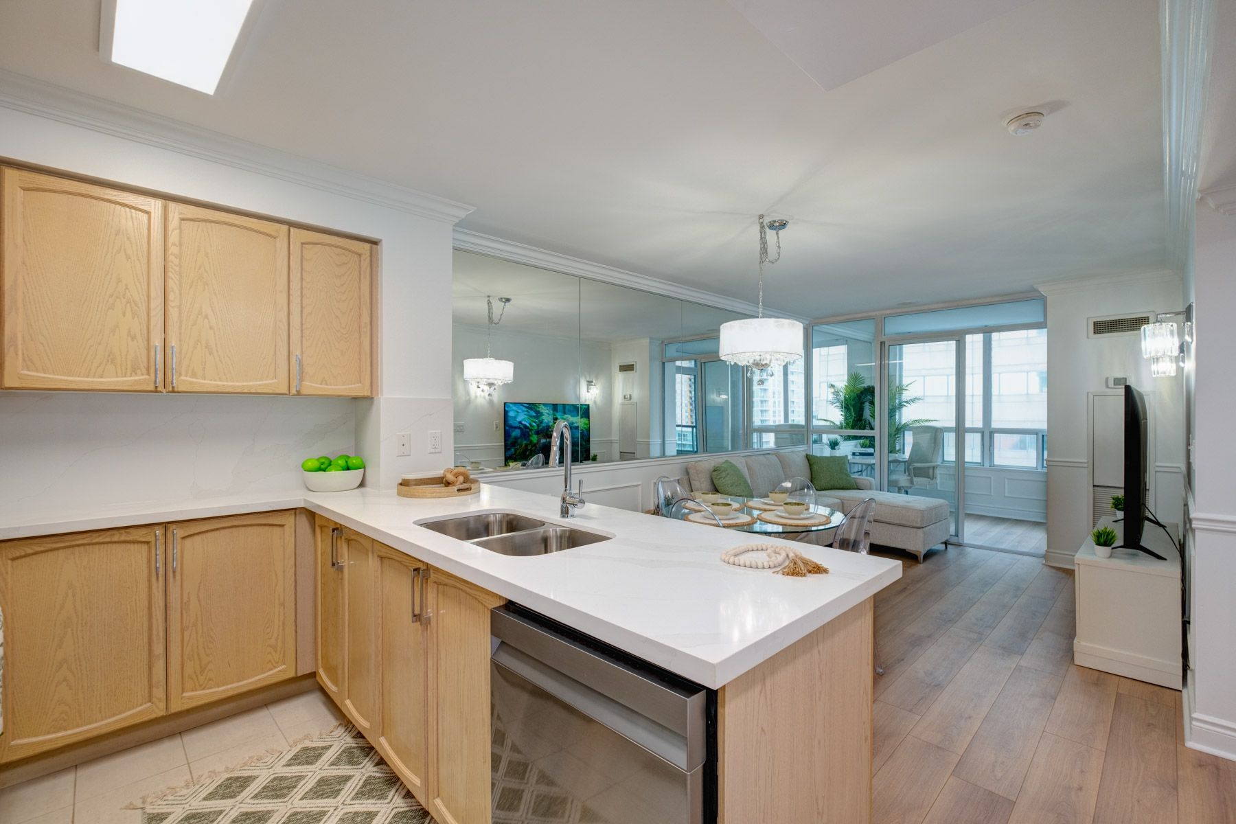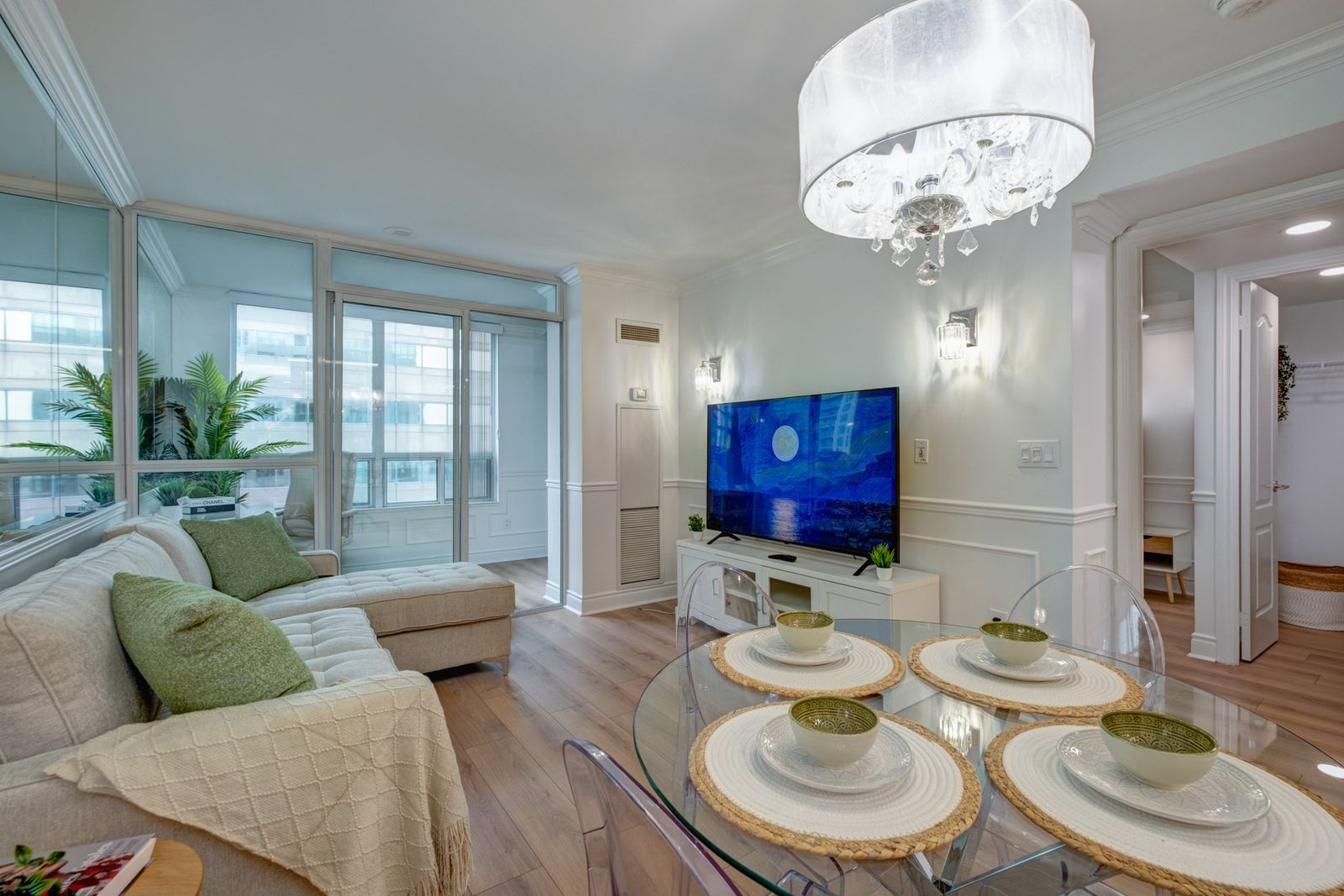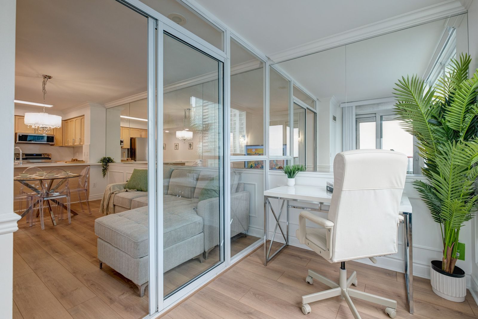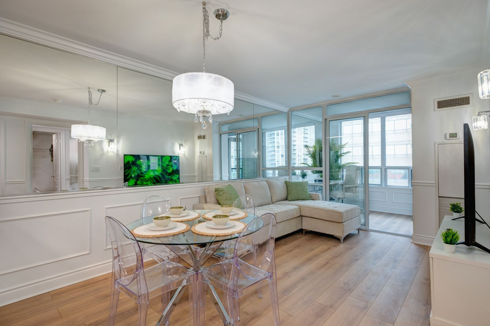 Location! Location! Location! Beautifully renovated 1 bedroom plus den condo, located in the heart of Scarborough. Direct access 30 seconds from TTC station and 40 seconds to Scarborough Town Center. Minutes from 401. Southeast facing balcony with artificial turf overlooking albert Campbell square and Scarborough town center. Recent upgrades include new flooring, smooth ceilings, crown moulding, wainscotting, quartz counters and backsplash, crystal chandeliers, mirrored wall, wall scones, USB outlets, and all 4000k LED lighting. Brand new Samsung stainless steel kitchen appliances. Ensuite laundry, Bright and spacious den is perfect for a home office. 1 underground parking spot and storage locker included! 24hrs concierge, indoor swimming pool, hot tub, table tennis room, card room, mini theatre, sauna, party room, virtual golf room, library, car washing station & visitors parking. Don't miss this opportunity.