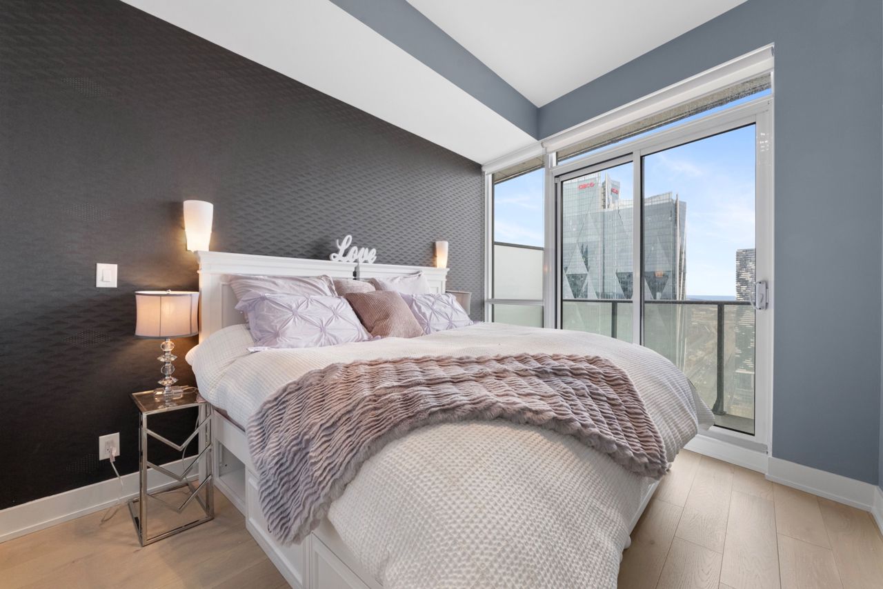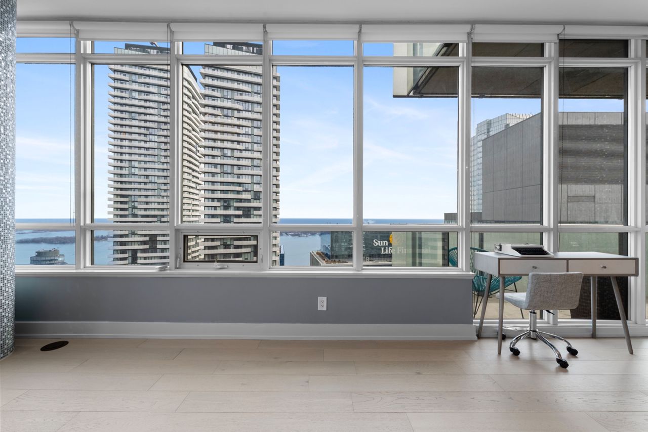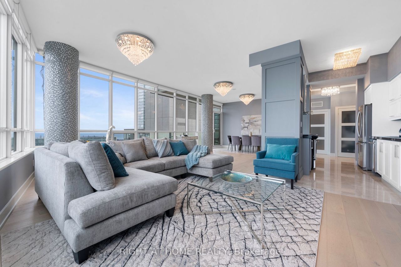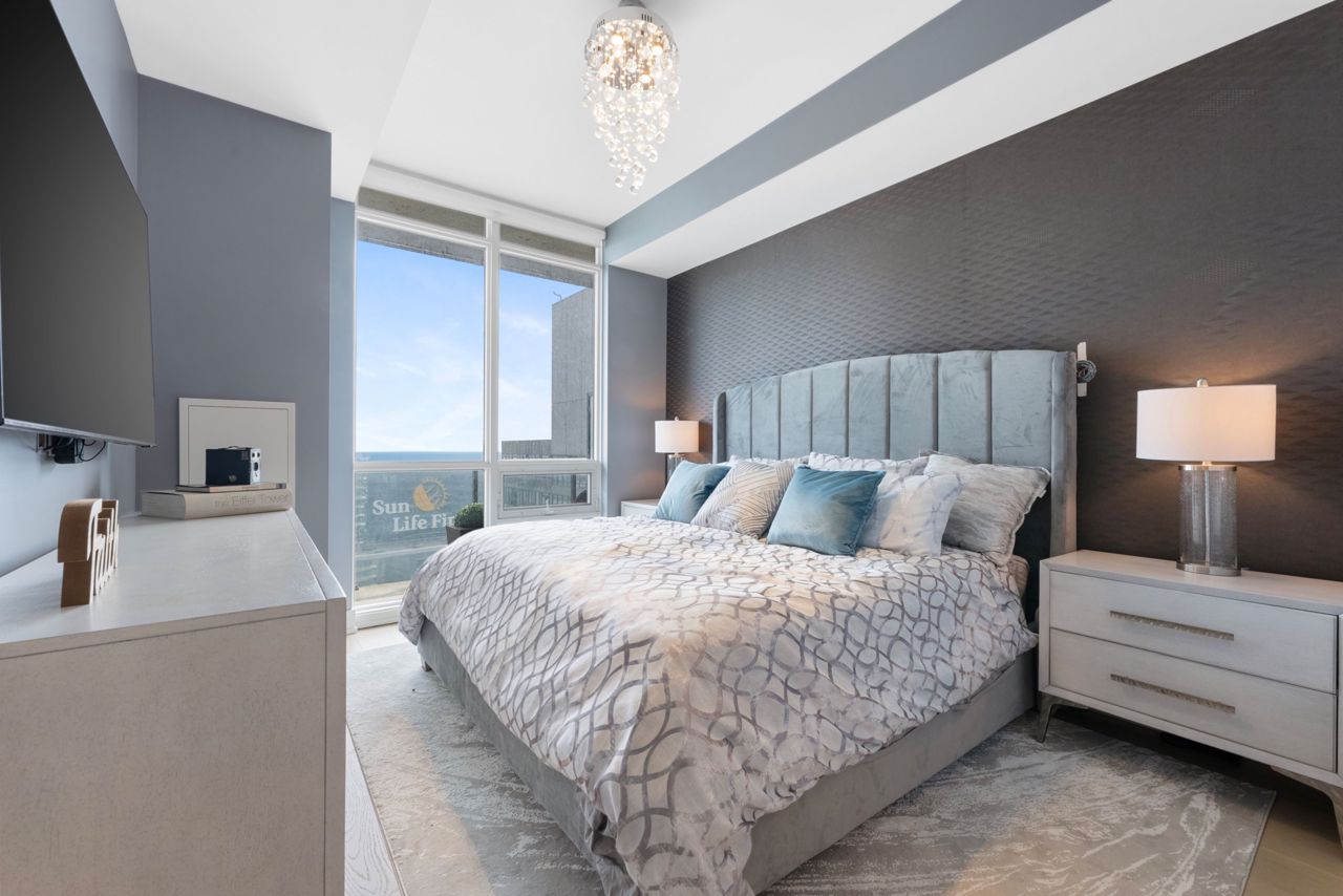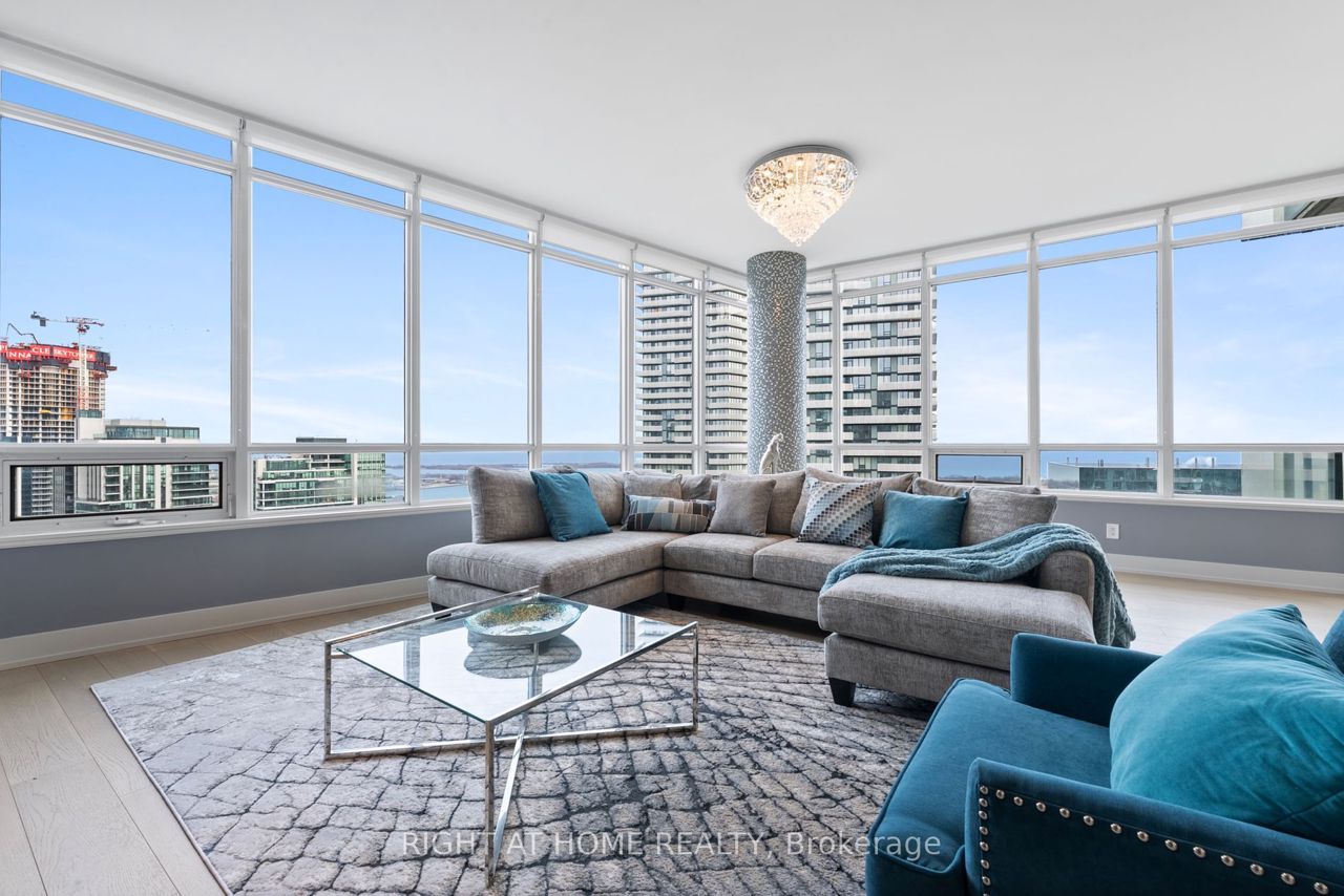 Exquisite & Private Penthouse Living with Panoramic Lake Views. Welcome to one of the city's most coveted luxury residences, Maple Leaf Sq. This breathtaking 2+1-bed, 2-bath Penthouse corner unit redefines sophistication & elegance. Spanning 1,424sq.ft. of meticulously curated living space, this architectural masterpiece is a true standout. Step into a world of refined design and prestige, where 10-ft ceilings & wraparound windows flood the space w/ natural light & showcase Eastern & Southern views, incl. panaromic views of Lake Ont. From sunrise -sunset, the vistas are nothing short of spectacular. The chefs kitchen is a modern showpiece, outfitted w/ custom cabinetry, stainless steel appliances, a breakfast bar, & gorgeous exotic black galaxy granite countertops that shimmer beneath soft accent lighting. Rich 7 1/4 Canadian White Oak hardwd floors contrast elegantly w/ natural white marble flooring, creating a seamless blend of warmth & luxury. The open-concept living & dining space is framed by mosaic-tiled columns. Entertaining here is an absolute pleasure. Two balconies provide ample outdoor space & the perfect retreat to take in the lake breeze & cityscape. The primary suite is a sanctuary of indulgence, adorned w/ wallpaper embedded w/ genuine Swarovski crystals, adding a subtle sparkle to every moment, & features a spa-inspired ensuite w/ a massive shower, dual raindrop shower heads, white onyx countertops, & a walk-in closet customized for functional elegance. Both bedrooms offer privacy, abundant space & serene views. Additional incl. custom motorized win. shades, designer lighting & impeccable craftsmanship throughout.This prestigious LEED-cert. building offers direct access to Scotiabk Arena,Union Station,the PATH,LONGOs, LCBO,TD Bk, restaurants,retail & LeGermain Hotel. Amenities: rooftop pool, sundeck, indr pool, hot tub, fitness ctr, Sky Lobby Lounge, theatre rm, biz ctr,24-hr concierge. Steps to Rogers Ctr, Parks, waterfront trails & entertainment.