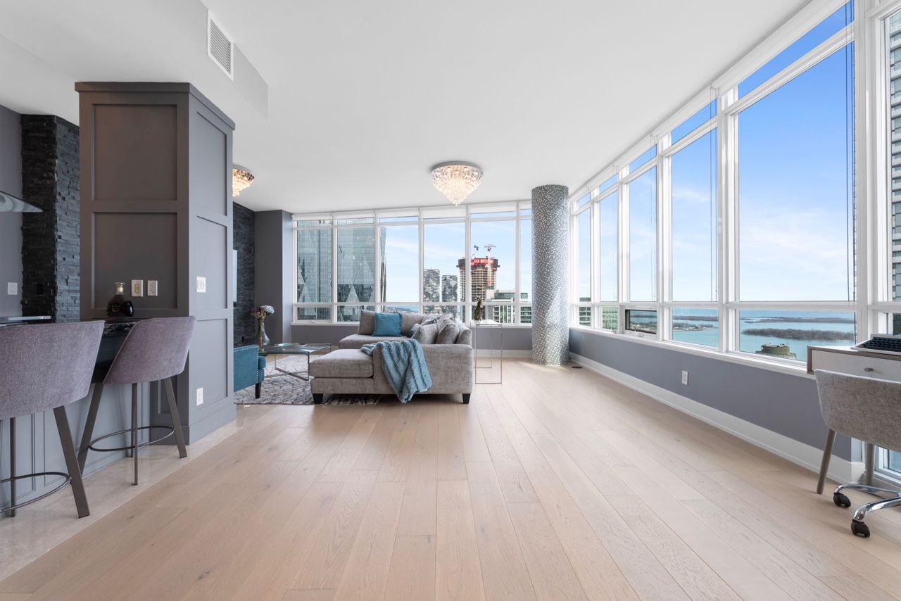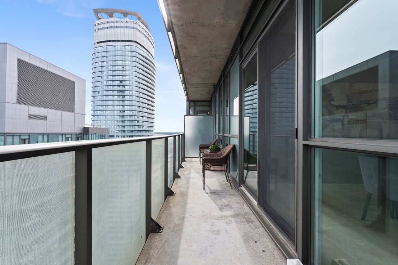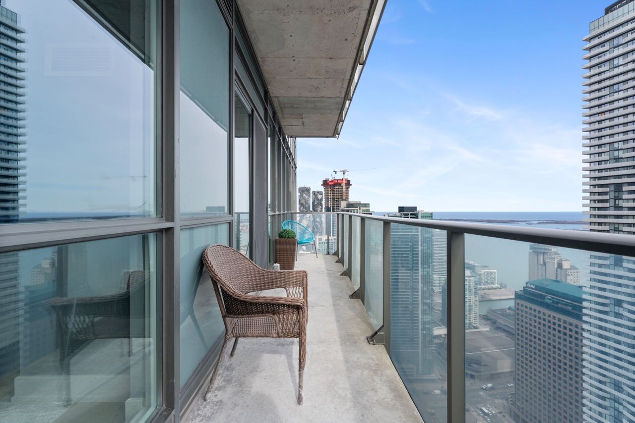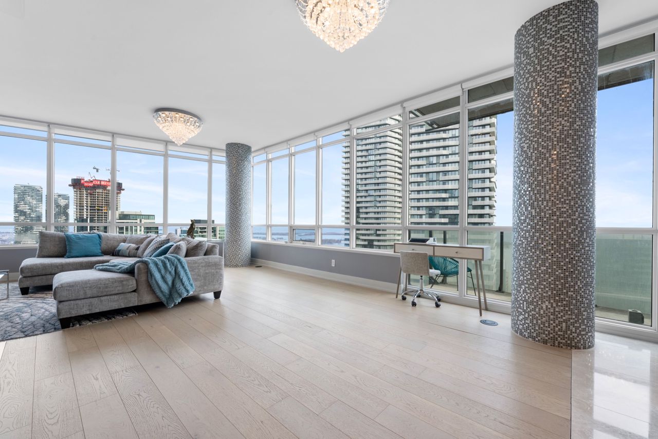 Exquisite & Private Penthouse Living with Panoramic Lake Views. Welcome to one of the city's most coveted luxury residences, Maple Leaf Sq. This breathtaking 2+1-bed, 2-bath Penthouse corner unit redefines sophistication & elegance. Spanning 1,424sq.ft. of meticulously curated living space, this architectural masterpiece is a true standout. Step into a world of refined design and prestige, where 10-ft ceilings & wraparound windows flood the space w/ natural light & showcase Eastern & Southern views, incl. panaromic views of Lake Ont. From sunrise -sunset, the vistas are nothing short of spectacular. The chefs kitchen is a modern showpiece, outfitted w/ custom cabinetry, stainless steel appliances, a breakfast bar, & gorgeous exotic black galaxy granite countertops that shimmer beneath soft accent lighting. Rich 7 1/4 Canadian White Oak hardwd floors contrast elegantly w/ natural white marble flooring, creating a seamless blend of warmth & luxury. The open-concept living & dining space is framed by mosaic-tiled columns. Entertaining here is an absolute pleasure. Two balconies provide ample outdoor space & the perfect retreat to take in the lake breeze & cityscape. The primary suite is a sanctuary of indulgence, adorned w/ wallpaper embedded w/ genuine Swarovski crystals, adding a subtle sparkle to every moment, & features a spa-inspired ensuite w/ a massive shower, dual raindrop shower heads, white onyx countertops, & a walk-in closet customized for functional elegance. Both bedrooms offer privacy, abundant space & serene views. Additional incl. custom motorized win. shades, designer lighting & impeccable craftsmanship throughout.This prestigious LEED-cert. building offers direct access to Scotiabk Arena,Union Station,the PATH,LONGOs, LCBO,TD Bk, restaurants,retail & LeGermain Hotel. Amenities: rooftop pool, sundeck, indr pool, hot tub, fitness ctr, Sky Lobby Lounge, theatre rm, biz ctr,24-hr concierge. Steps to Rogers Ctr, Parks, waterfront trails & entertainment.