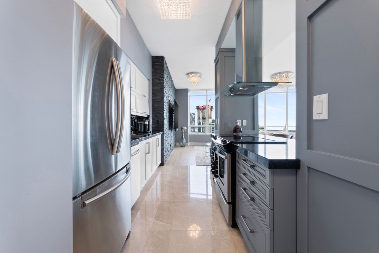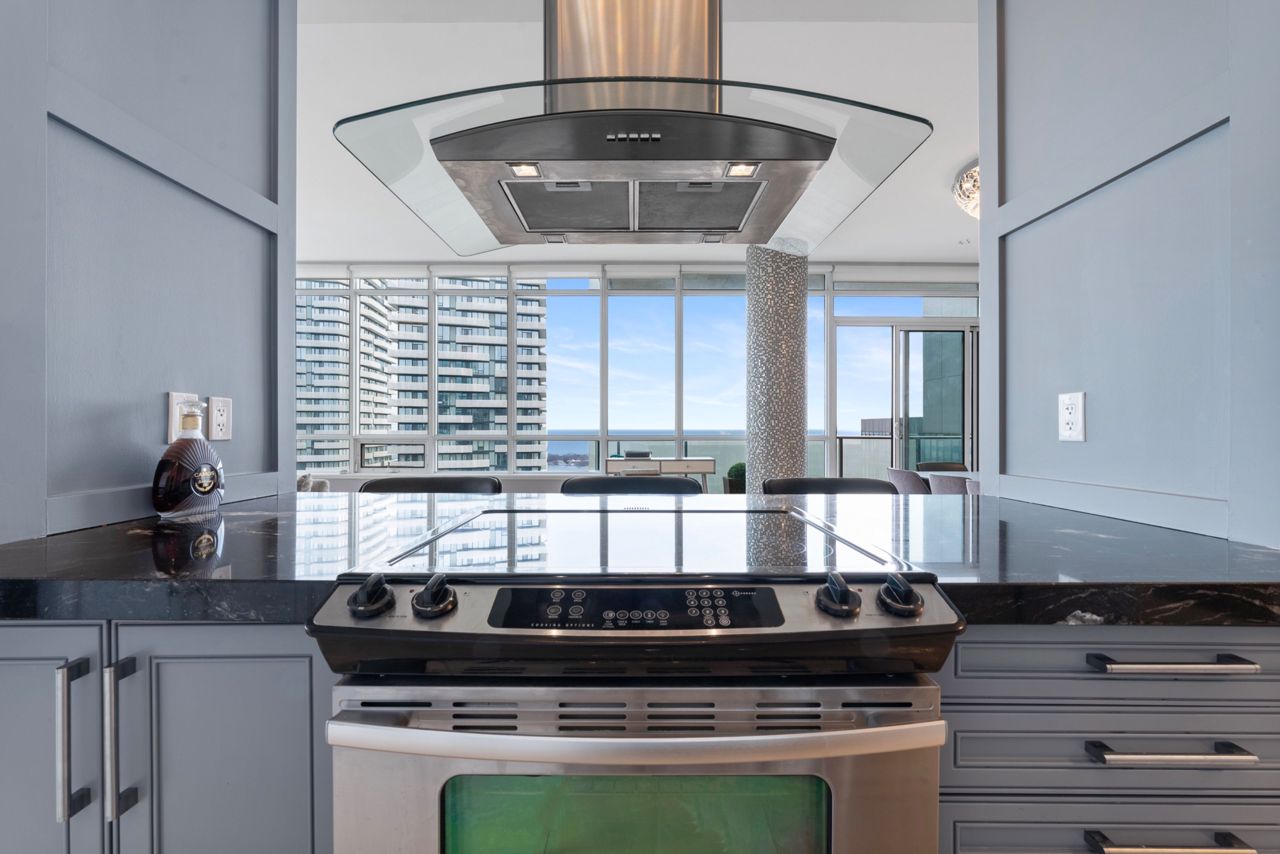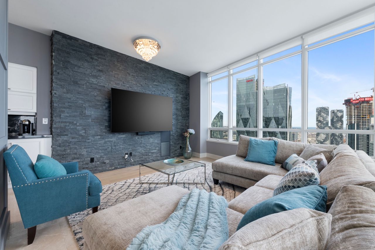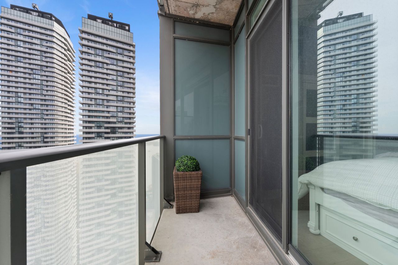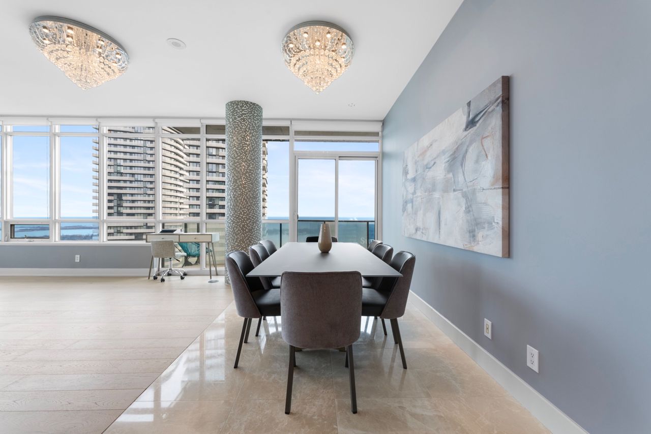 Exquisite & Private Penthouse Living with Panoramic Lake Views. Welcome to one of the city's most coveted luxury residences, Maple Leaf Sq. This breathtaking 2+1-bed, 2-bath Penthouse corner unit redefines sophistication & elegance. Spanning 1,424sq.ft. of meticulously curated living space, this architectural masterpiece is a true standout. Step into a world of refined design and prestige, where 10-ft ceilings & wraparound windows flood the space w/ natural light & showcase Eastern & Southern views, incl. panaromic views of Lake Ont. From sunrise -sunset, the vistas are nothing short of spectacular. The chefs kitchen is a modern showpiece, outfitted w/ custom cabinetry, stainless steel appliances, a breakfast bar, & gorgeous exotic black galaxy granite countertops that shimmer beneath soft accent lighting. Rich 7 1/4 Canadian White Oak hardwd floors contrast elegantly w/ natural white marble flooring, creating a seamless blend of warmth & luxury. The open-concept living & dining space is framed by mosaic-tiled columns. Entertaining here is an absolute pleasure. Two balconies provide ample outdoor space & the perfect retreat to take in the lake breeze & cityscape. The primary suite is a sanctuary of indulgence, adorned w/ wallpaper embedded w/ genuine Swarovski crystals, adding a subtle sparkle to every moment, & features a spa-inspired ensuite w/ a massive shower, dual raindrop shower heads, white onyx countertops, & a walk-in closet customized for functional elegance. Both bedrooms offer privacy, abundant space & serene views. Additional incl. custom motorized win. shades, designer lighting & impeccable craftsmanship throughout.This prestigious LEED-cert. building offers direct access to Scotiabk Arena,Union Station,the PATH,LONGOs, LCBO,TD Bk, restaurants,retail & LeGermain Hotel. Amenities: rooftop pool, sundeck, indr pool, hot tub, fitness ctr, Sky Lobby Lounge, theatre rm, biz ctr,24-hr concierge. Steps to Rogers Ctr, Parks, waterfront trails & entertainment.