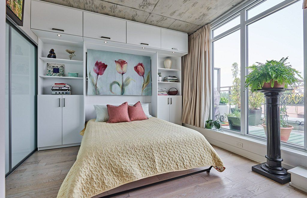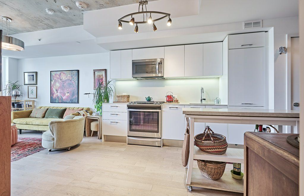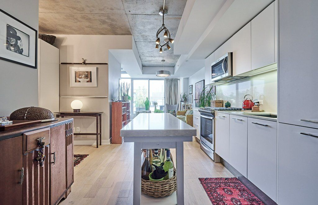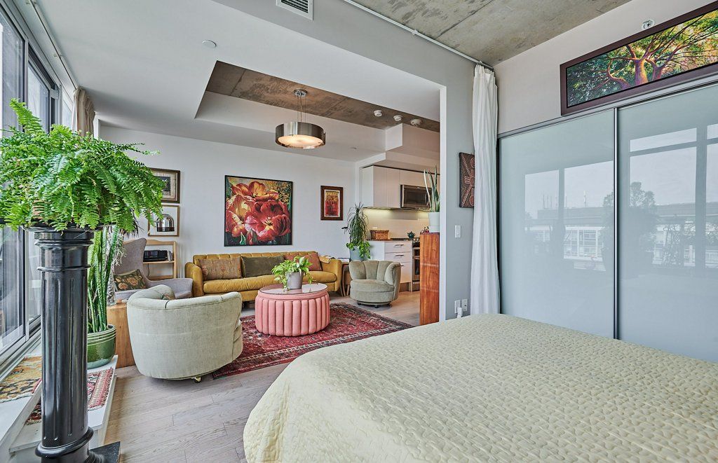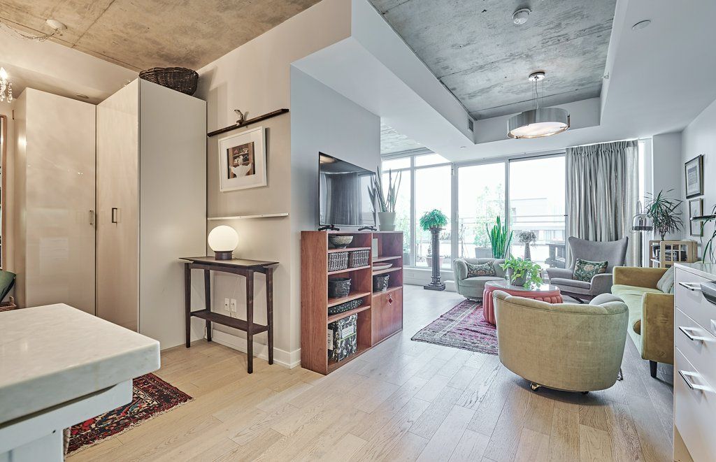 Welcome to the sought after Southwood. This suite is the perfect blend of loft inspired space & condo living built by Street Car Developments. A great place to call home or use as a Pied de Terre with so many options & flexibility in this well designed & thought out space. The bedroom wall has been removed & features a convenient Murphy Bed, maximizing the living & dining area that easily converts into your sleeping space at night. The den is currently fitted with useful storage & could also be used as a great home office. Modern finishes including engineered hardwood floors, integrated kitchen appliances, concrete ceilings, gas stove & more. You will love the light from your oversized balcony that is perfect for entertaining & is equipped with a gas BBQ line & no neighbours above. This suite includes parking & a locker, providing you with extra convenience and storage options. Murphy bed can be removed and fit Queen sized bed within the built-ins.Amenities are all within walking distance, the Big Carrot & TTC at your doorstep, the YMCA and Kingston Road Village up the street & the Lake and Queen Street at the bottom of the street.