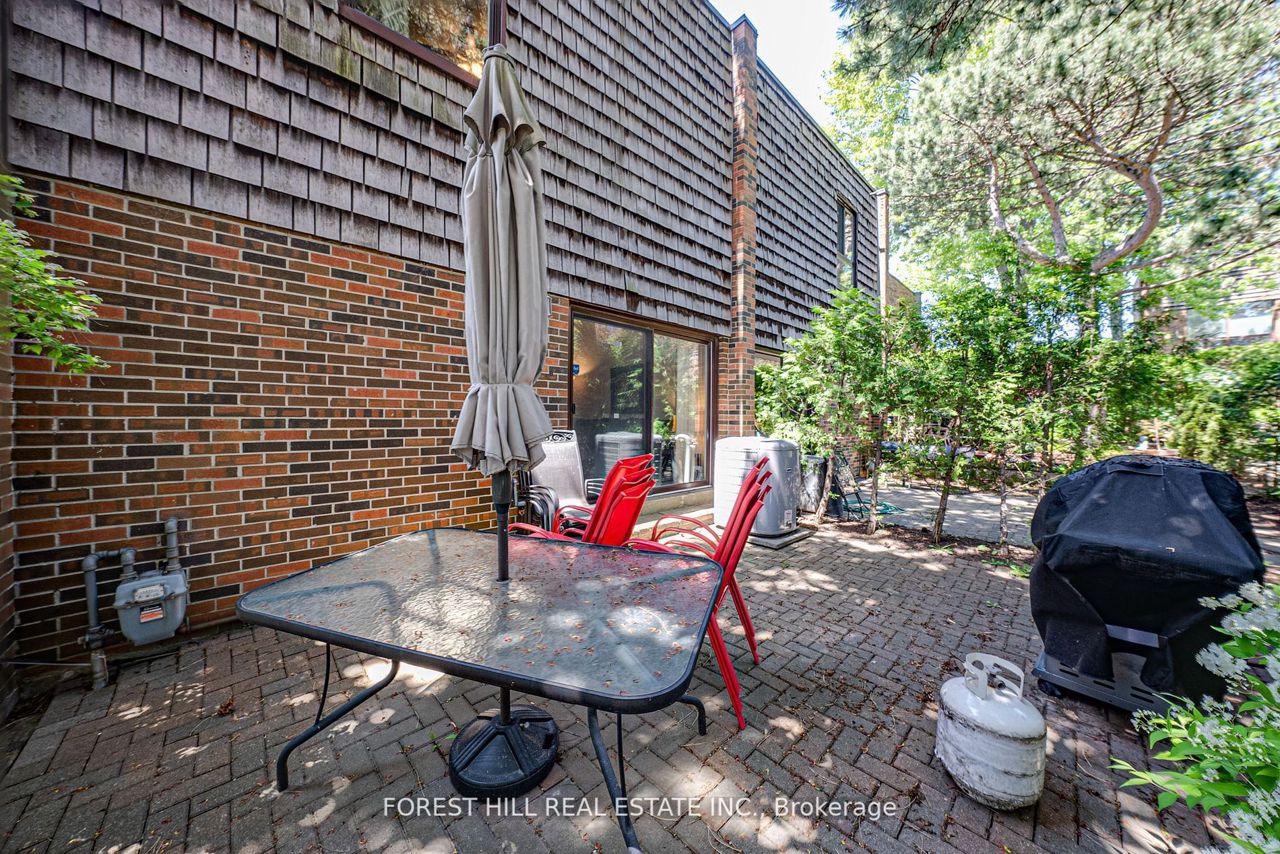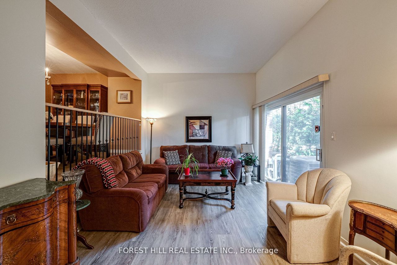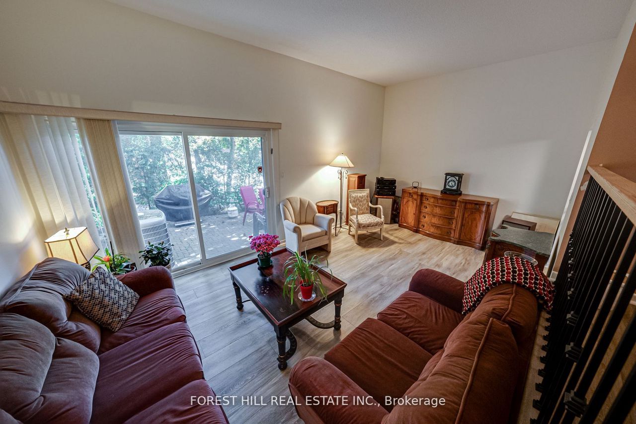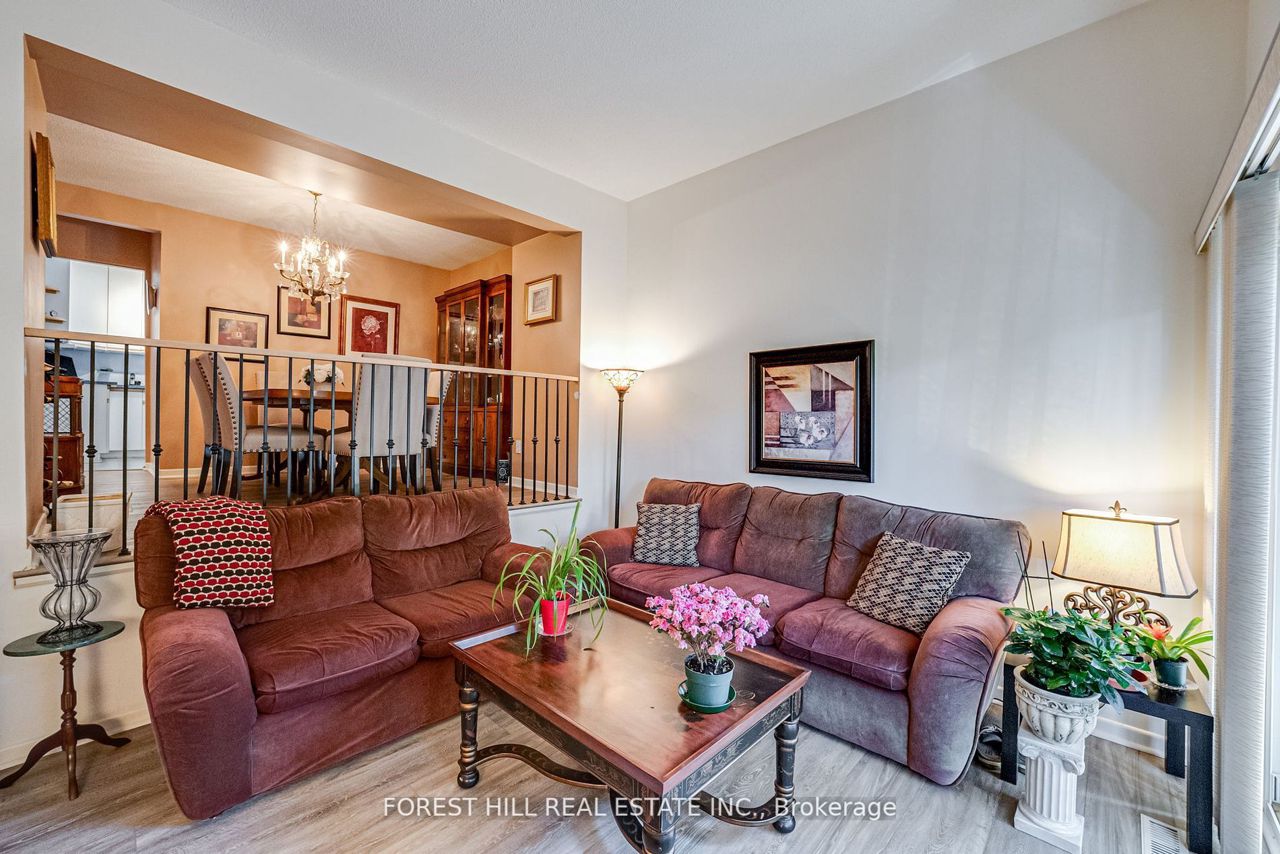 Bright and beautiful townhome in quiet and family friendly village community. Rarely offered corner lot! Spacious layout with 3 bed/2 bath, eat in kitchen with S/S oven and fridge, living room with 11 foot cathedral ceiling, large dining room overlooking living room, new vinyl flooring on main floor, new windows and patio doors, custom painted walls. Cozy den with fireplace. Plenty of storage. Walkout to mature private backyard with patio furniture & BBQ included. Sought after location with easy access to TTC, Go Train, hwys, schools, parks and mall. Community pool with lifeguard and skating rink (seasonal) and convenient visitor parking. Don't miss out on this amazing and well cared for home! Perfect for a growing family!