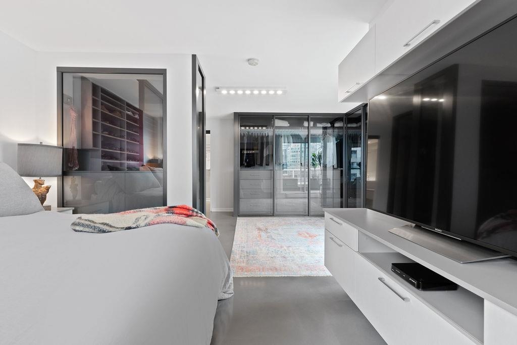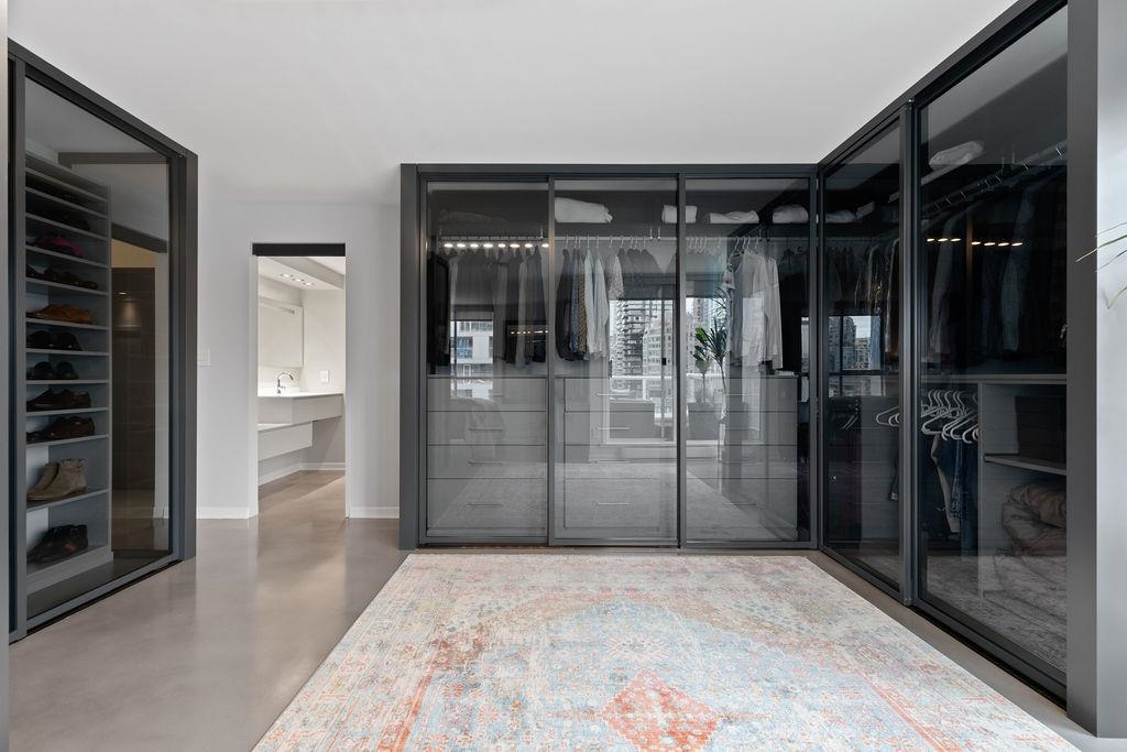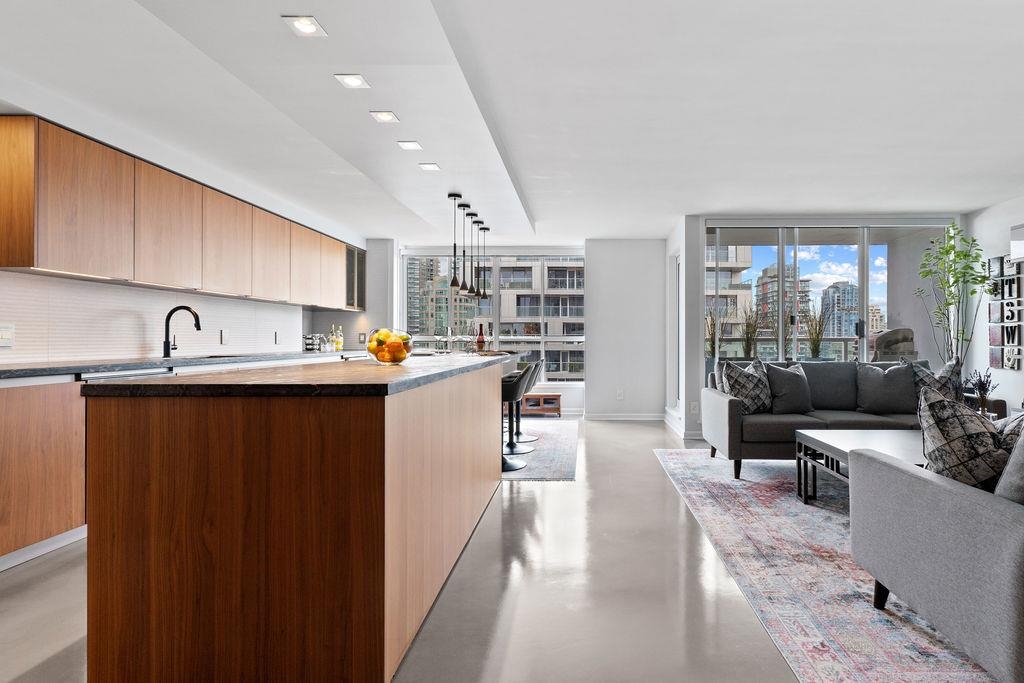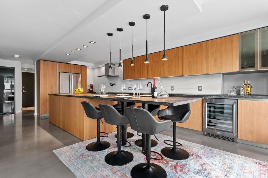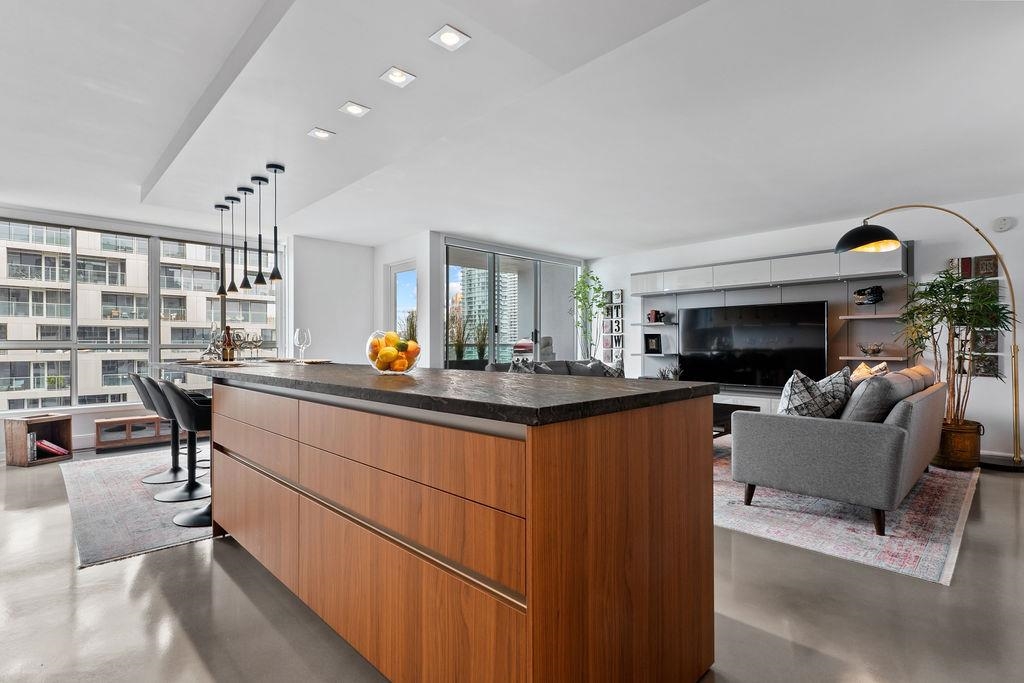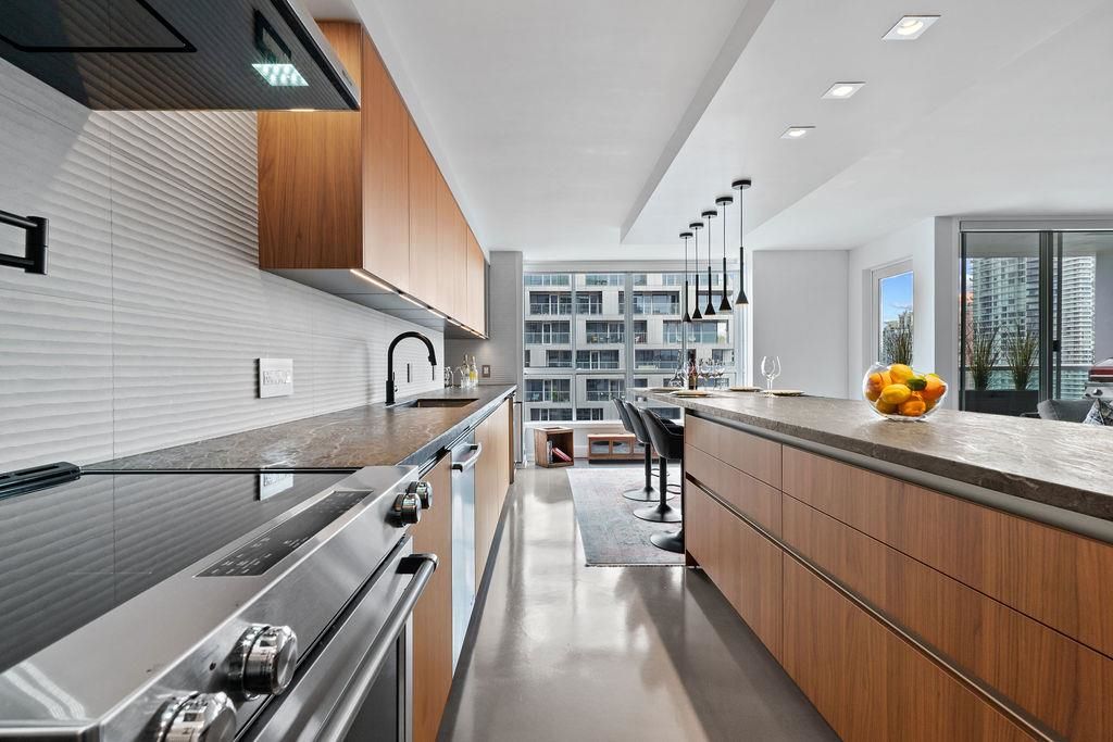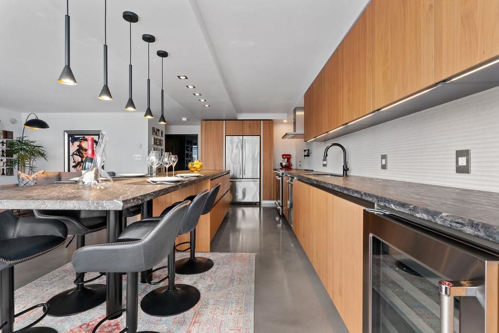 A truly rare offering: a 1,319 sqft 1-bedroom executive condo that underwent a $350,000 TOTAL re-design. This unique home was stripped back to the building envelope and completely re-imagined. Every component is new including the studs, insulation, electrical, plumbing, and drywall. The house-sized kitchen features Elmar Italian cabinetry, Jennair appliances, and a unique quartzite countertop. European bathrooms feature Ideagroup Italian vanities, Aquatek linear sinks, Newform bathroom shower fixtures, and Antonio Lupi mirrors. The master suite is huge with English-Bay facing patio and luxury retailer-quality custom closet systems. Aside from its size, this rare home offers 4 parking stalls, 2 storage lockers, and 2 patios. Building just completed at $1.255M exterior maintenance project.
