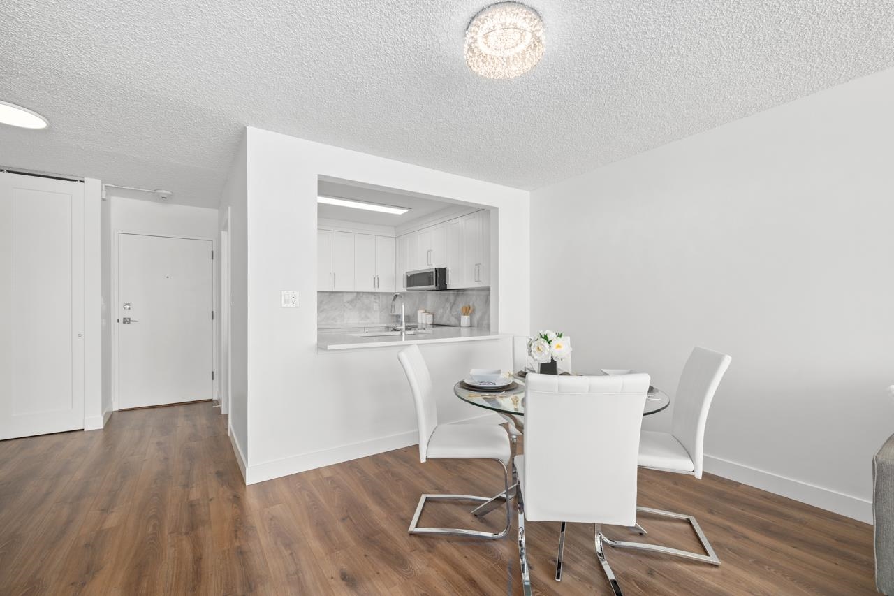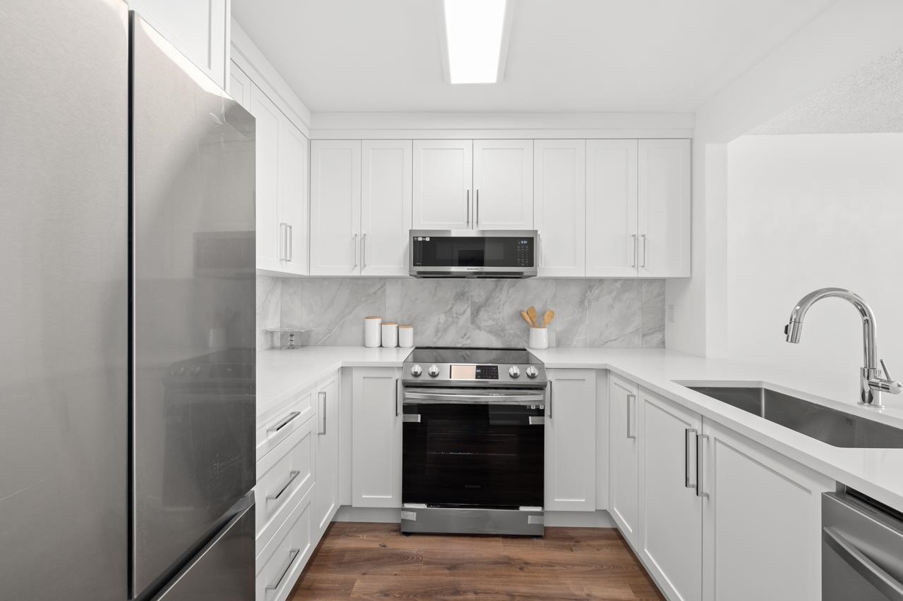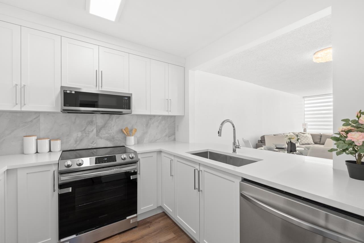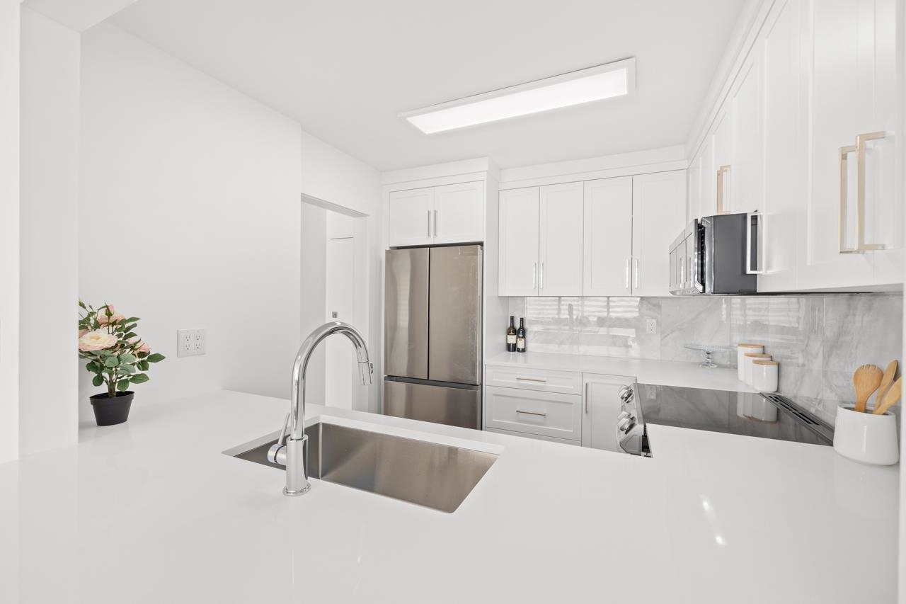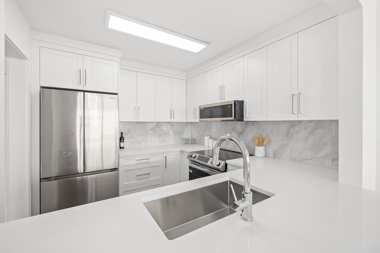 Exquisite, fully renovated, massive 1 bedroom plus den unit located in the heart of Quilchena. Boasting elegant finishes and a spacious layout, this stunning property offers the perfect balance of comfort and luxury. Enjoy new drywall, paint, leveling & laminate flooring throughout the unit. Kitchen has been completely redone with brand new stainless steel appliances, custom shaker cabinetry with tons of storage, quartz countertops with an extended overhang, a beautiful tile backsplash, and extra wide opening for tons of light. Stunning bathroom surrounded by elegant tile from top to bottom, new tub, new fixtures and more custom cabinetry with a bonus double vanity. Spacious bedroom w/ new closet organizers and zebra blinds throughout the unit. comes with 1 parking & storage locker.