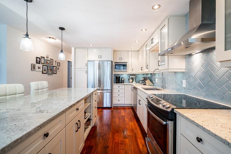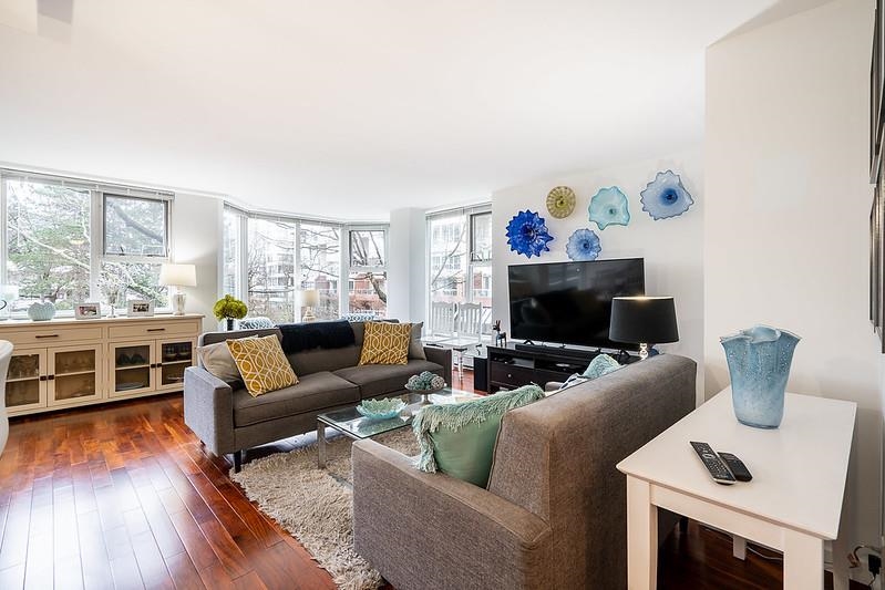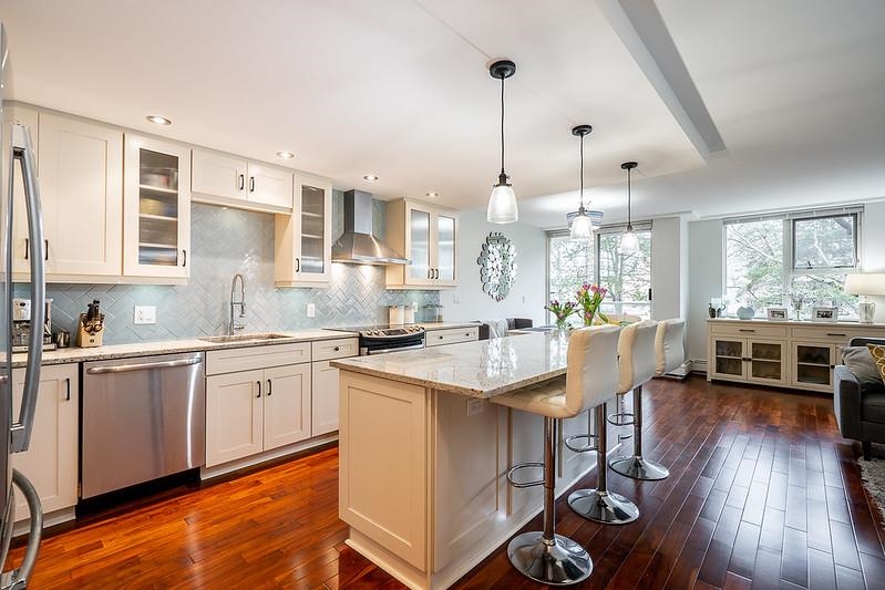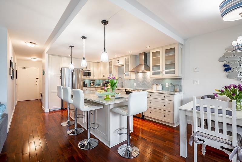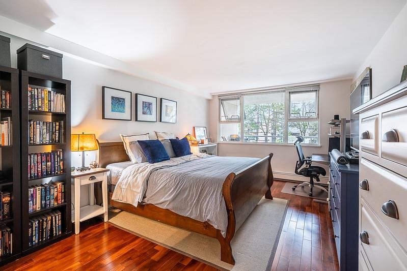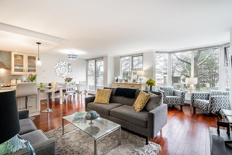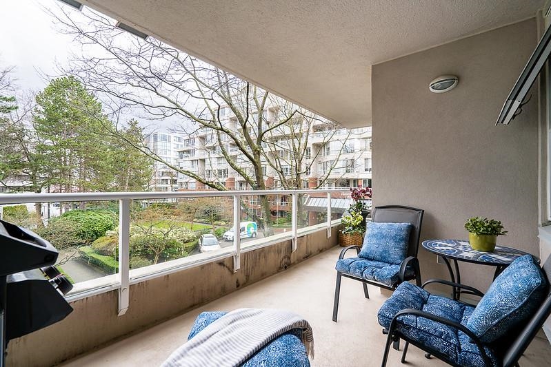 Located at the quiet end of Moberly, steps to the seawall, is the gorgeously renovated 2 bedroom and 2 bathroom corner unit at Discovery Quay. Here you will find over 1300 SF of tasteful updates including; open plan living area boasting an entertainer's kitchen with custom hardwood cabinets and flooring, granite counters, GE appliance package and 9' island. This thoughtful floorplan incorporates separated bedrooms, ample outdoor space; over-looking a private garden setting, in-suite storage, laundry. Strata fees include heat and hot water. The unit also comes with additional storage and parking in a worry-free rainscreen building just a short walk to shopping, restaurants and transit. Canada Line access to the airport.