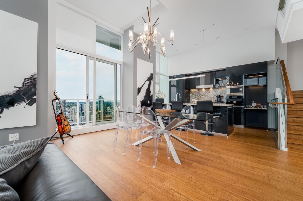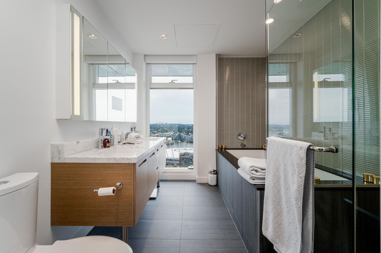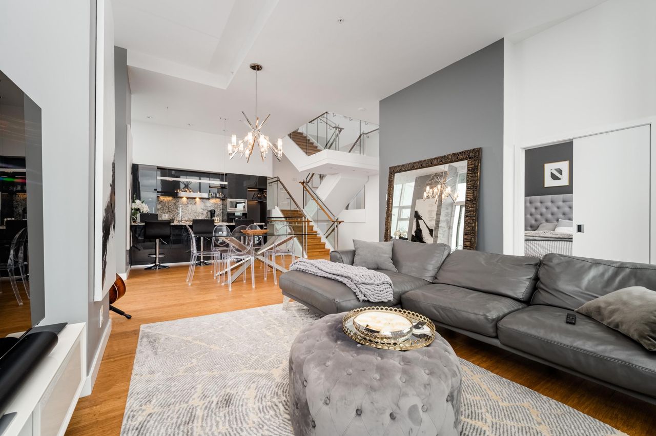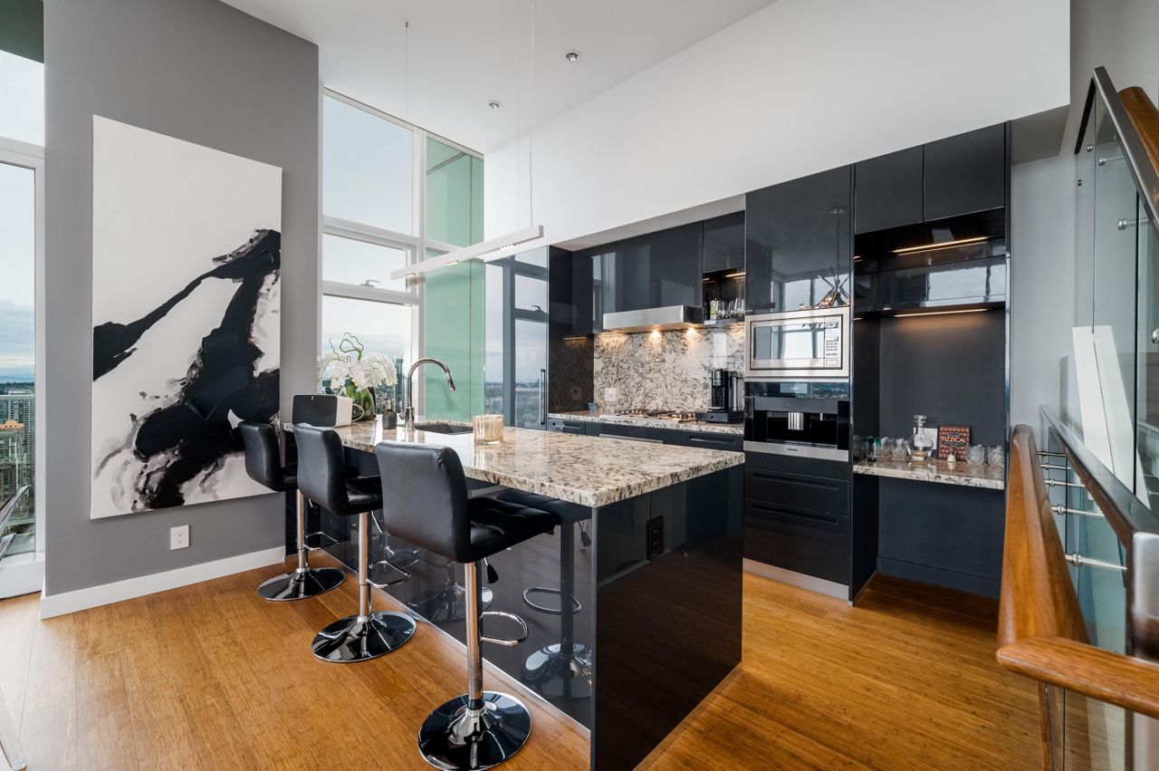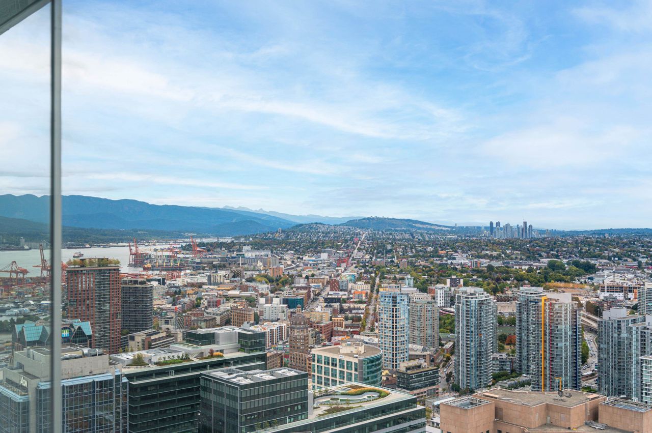 PENTHOUSE NINE at Telus Gardens - breathtaking views from this 4 bed, den + flex space over 3 levels & 270 degree view. Floor to ceiling windows, custom kitchen by Kitchen Living w/ charcoal designer cabinetry, soft close cabinets, Miele appliances incl espresso machine, wine fridge & polished Icestone slab countertop w/ breakfast bar seating. Entrance on the lower level where you will find the foyer, guest bathroom & storage. Main level incl 1 Bed, flex room, Spacious living & dining areas. Top floor has 3 Bed incl Master bedroom w/ sizable walk-in closet & gorgeous ensuite. 2 Side by Side Parking Stalls. AC. The 5 star amenities incl: outdoor pool, jacuzzi, sauna, steam room, 24/7 concierge, fitness center, yoga studio, kids play area & dog park. Sneak Peek Tues Mar 26th 1:45-2pm