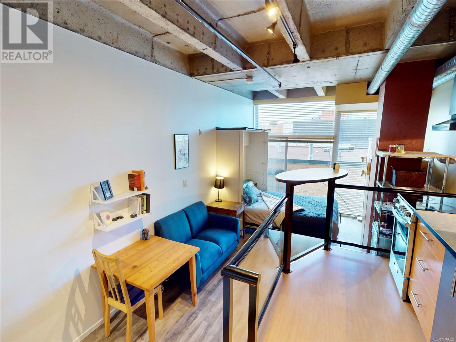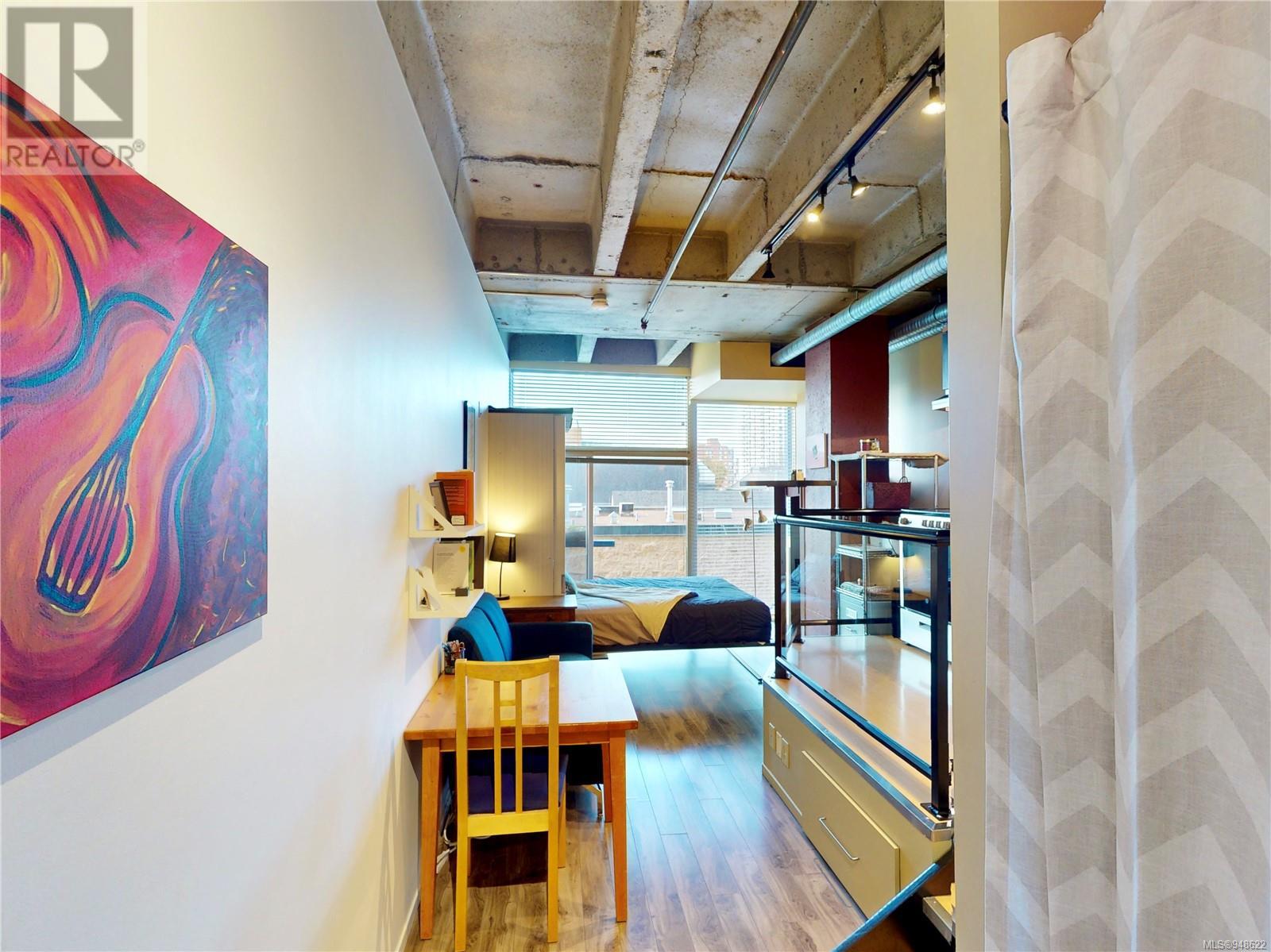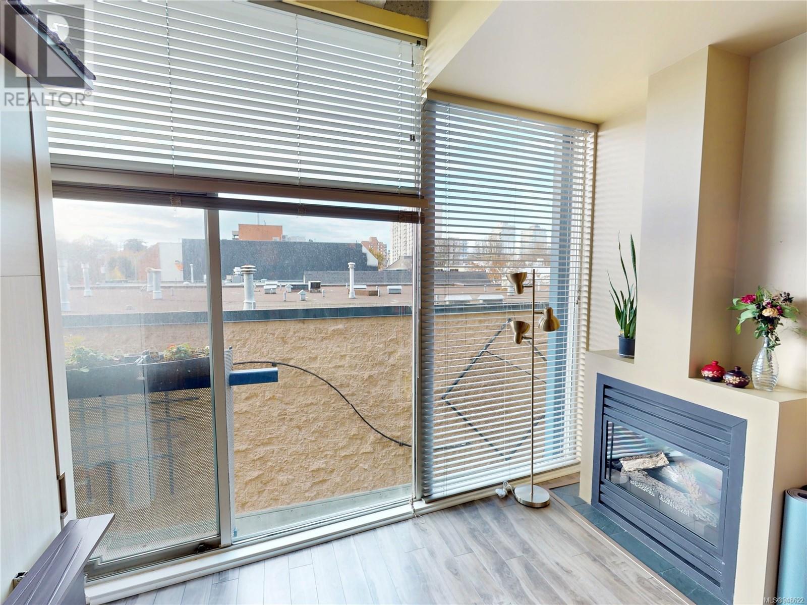 'City Chic'! The Mosaic is a landmark steel/concrete building, in an unbeatable location. Explore affordable downtown living at its best in this 3rd floor, sunny west-facing bachelor studio on Antique Row. This unit offers modern living with a cozy gas fireplace, elevated kitchen with a breakfast bar, open floor plan, full 4-piece bath & in-suite laundry. Laminate flooring & 10 ft ceilings create an open, chic space ideal for professionals, students, investors, or those seeking a minimalist lifestyle. This live/work zoned property is pet-friendly allowing for 2 dogs or cats with no size restriction & rentable, minimum 6 months. The heart of city amenities are at your doorstep. Cook St. Village, Beacon Hill Park & the Dallas Rd waterfront are a stroll or bike ride away. The Mosaic provides a simple, modern lifestyle with low strata fees. Conveniently located on bus routes & a short walk to downtown. Don't miss out – view this home today and embrace the Mosaic lifestyle! (id:22211)