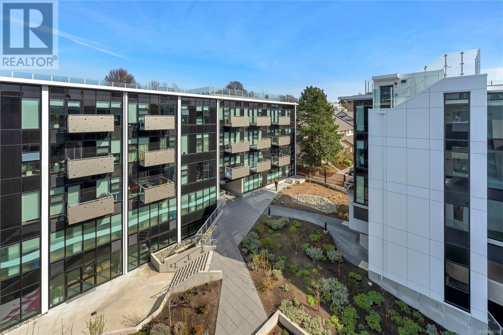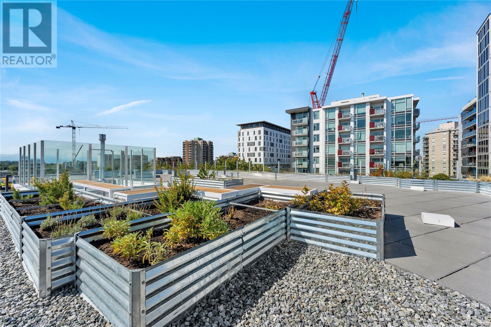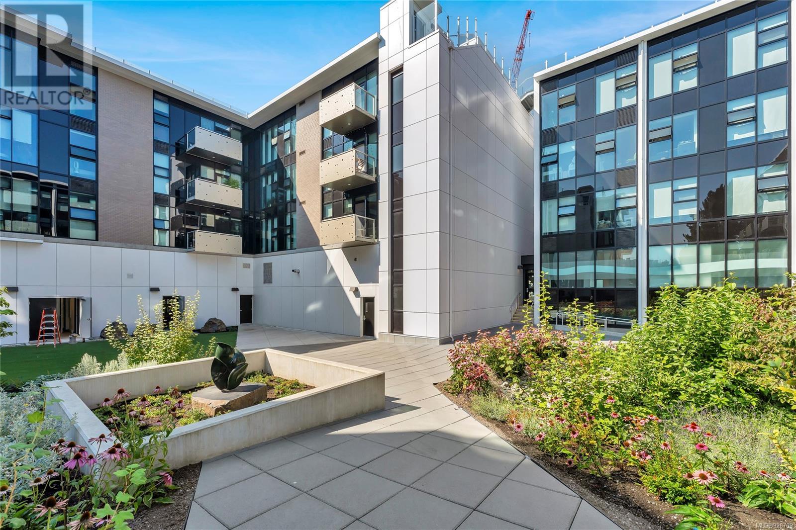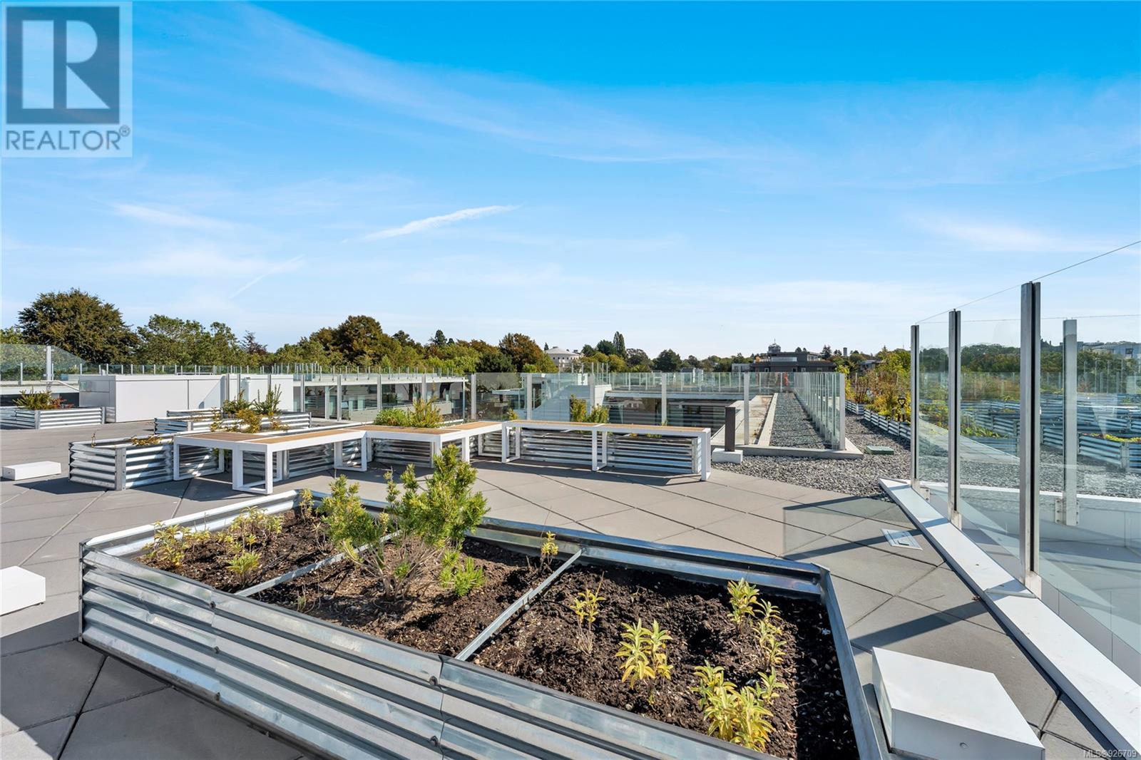 Modern junior 2 bedroom condo steps to the heart of Downtown Victoria! Enjoy the ideal west-coast/urban lifestyle in this boutique multi-dwelling building, complete with a modern kitchen equipped with Bosch stainless steel appliances, gas range, integrated dishwasher and fridge, quartz countertops, and dual-tone cabinetry. As well, this suite features engineered hardwood floors throughout and a beautiful walk-in shower with a rainfall shower head in the bathroom. The sun soaked balcony overlooks the quiet common courtyard and large windows allow for ample natural lighting to flood in. This pet-friendly suite includes parking, in-unit laundry, a separate storage locker and access to a private, secure courtyard and rooftop garden plot with a nearly 360-degree perspective of views of mountains and the Victoria cityscape. (id:22211)