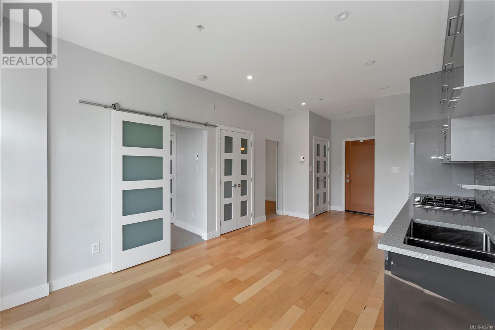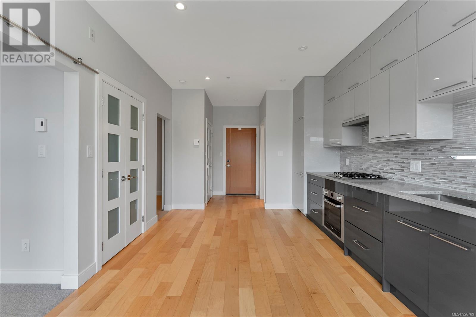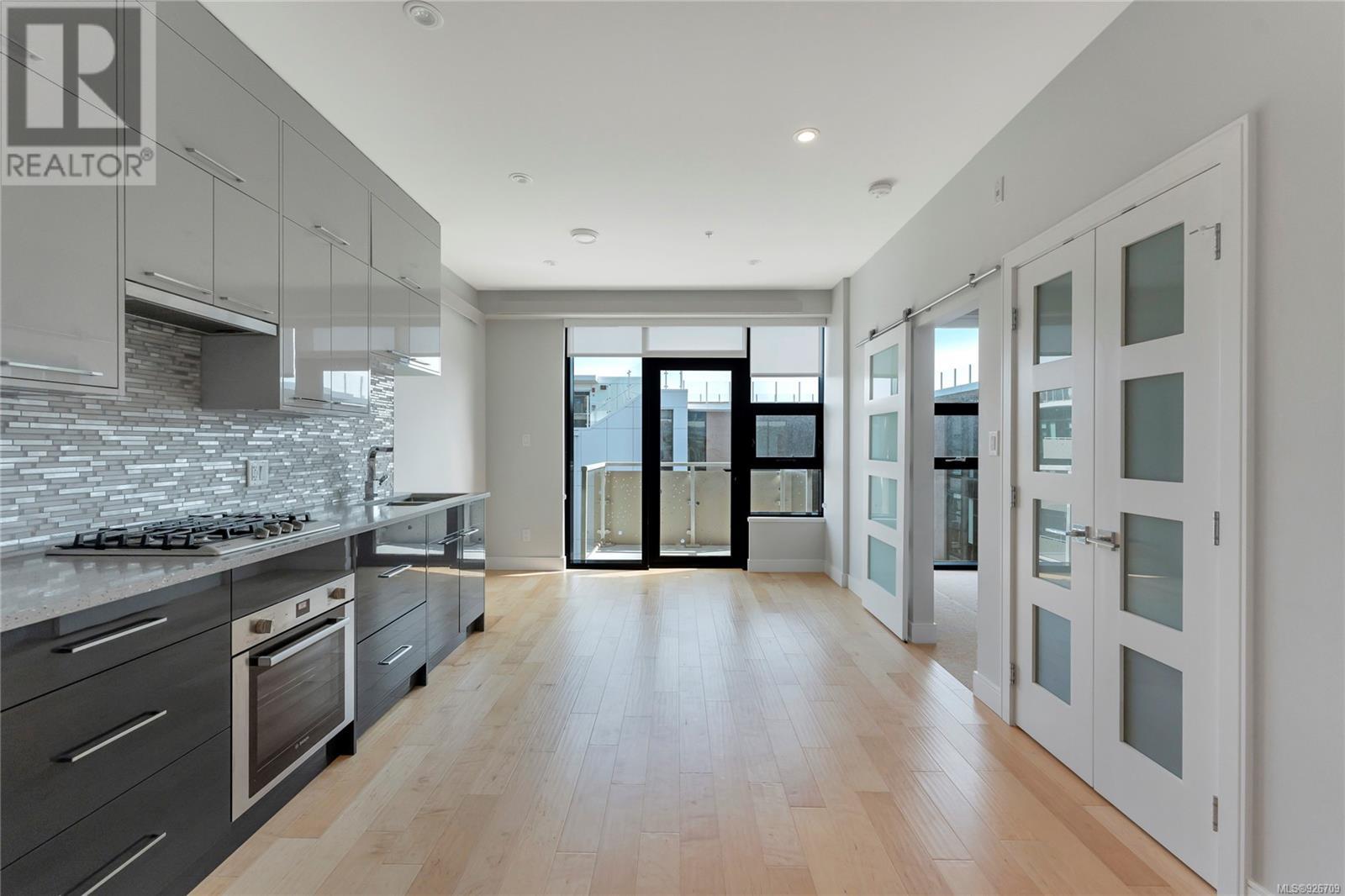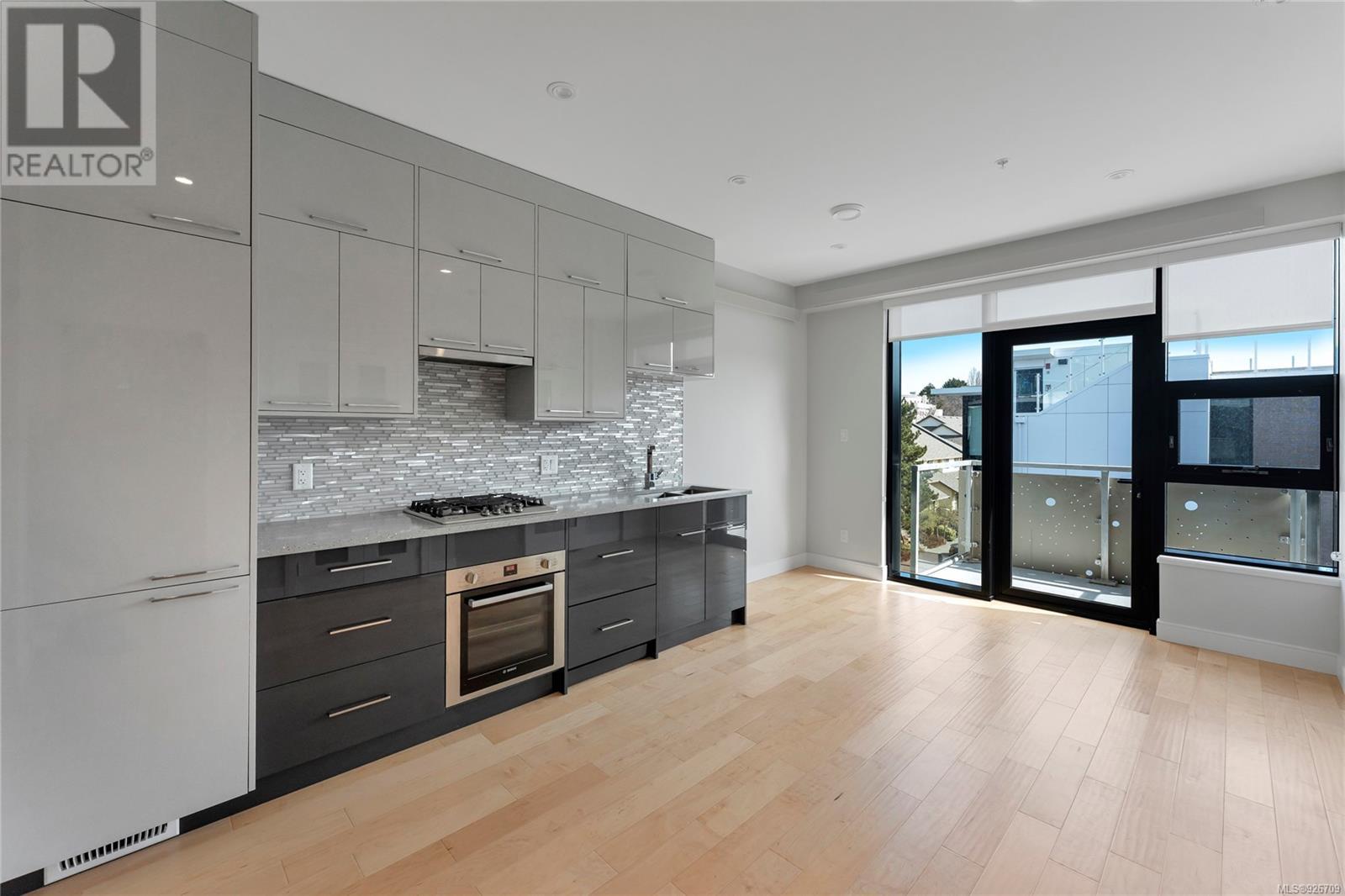 Modern junior 2 bedroom condo steps to the heart of Downtown Victoria! Enjoy the ideal west-coast/urban lifestyle in this boutique multi-dwelling building, complete with a modern kitchen equipped with Bosch stainless steel appliances, gas range, integrated dishwasher and fridge, quartz countertops, and dual-tone cabinetry. As well, this suite features engineered hardwood floors throughout and a beautiful walk-in shower with a rainfall shower head in the bathroom. The sun soaked balcony overlooks the quiet common courtyard and large windows allow for ample natural lighting to flood in. This pet-friendly suite includes parking, in-unit laundry, a separate storage locker and access to a private, secure courtyard and rooftop garden plot with a nearly 360-degree perspective of views of mountains and the Victoria cityscape. (id:22211)