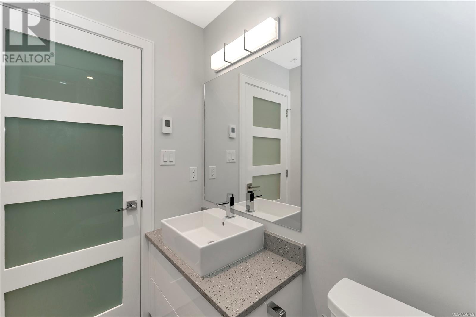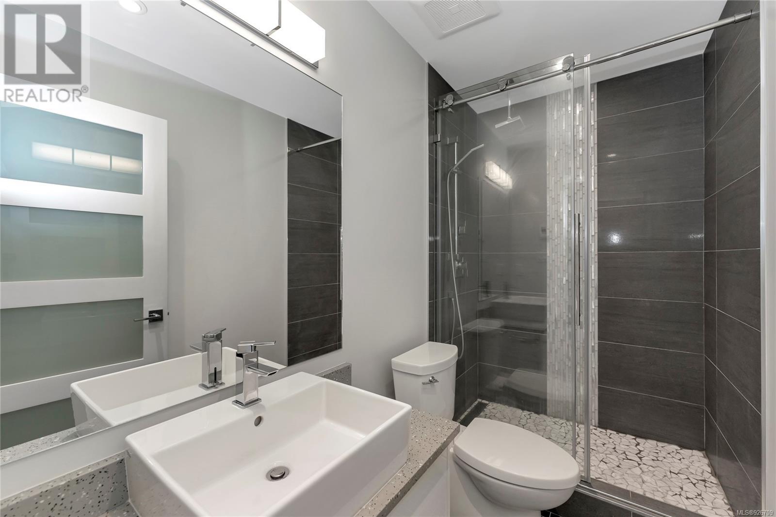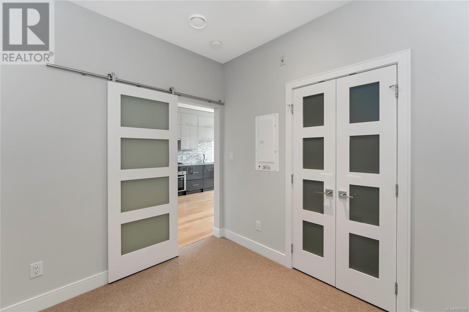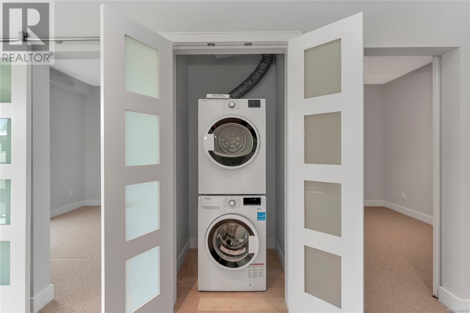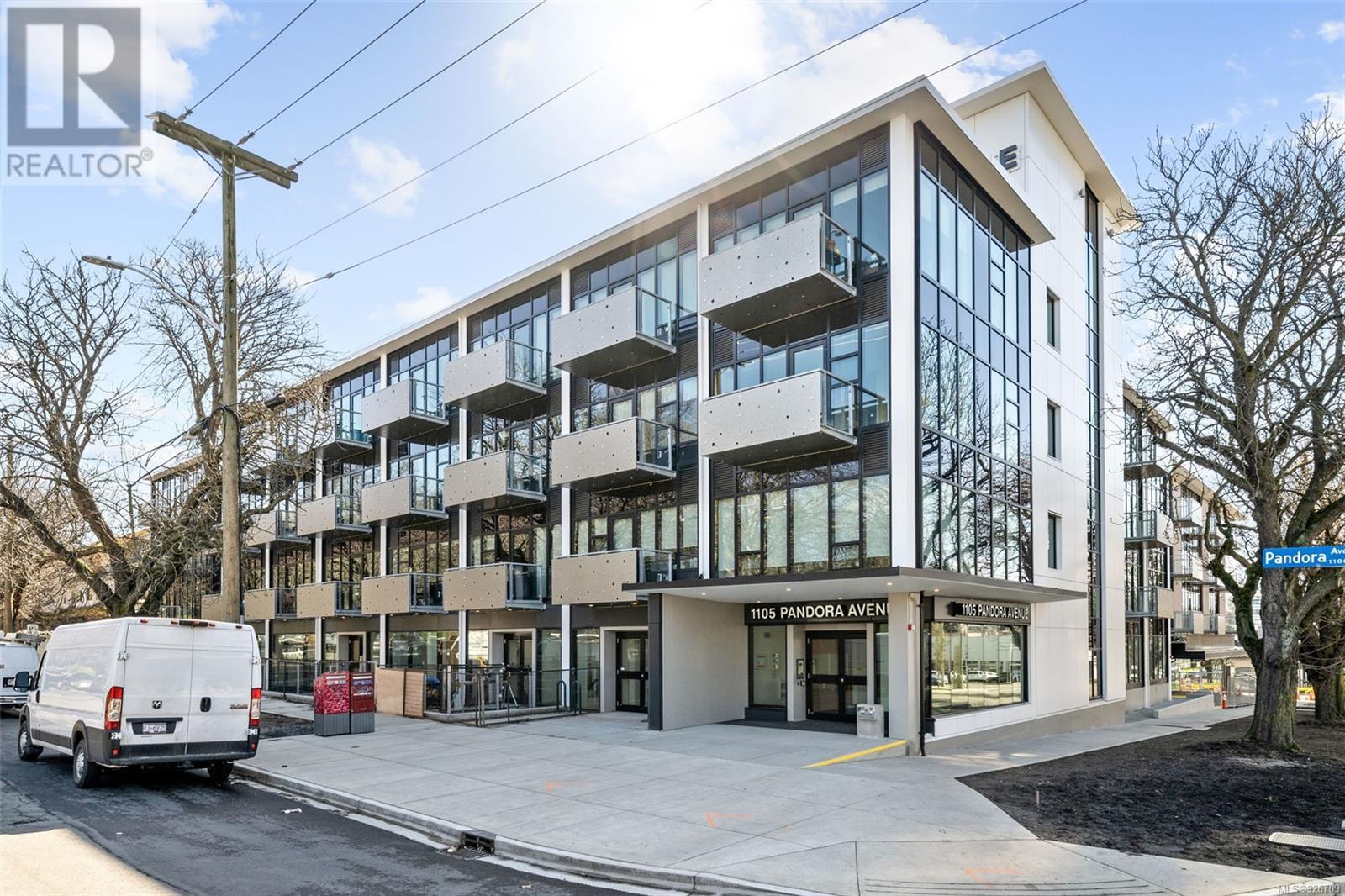 Modern junior 2 bedroom condo steps to the heart of Downtown Victoria! Enjoy the ideal west-coast/urban lifestyle in this boutique multi-dwelling building, complete with a modern kitchen equipped with Bosch stainless steel appliances, gas range, integrated dishwasher and fridge, quartz countertops, and dual-tone cabinetry. As well, this suite features engineered hardwood floors throughout and a beautiful walk-in shower with a rainfall shower head in the bathroom. The sun soaked balcony overlooks the quiet common courtyard and large windows allow for ample natural lighting to flood in. This pet-friendly suite includes parking, in-unit laundry, a separate storage locker and access to a private, secure courtyard and rooftop garden plot with a nearly 360-degree perspective of views of mountains and the Victoria cityscape. (id:22211)