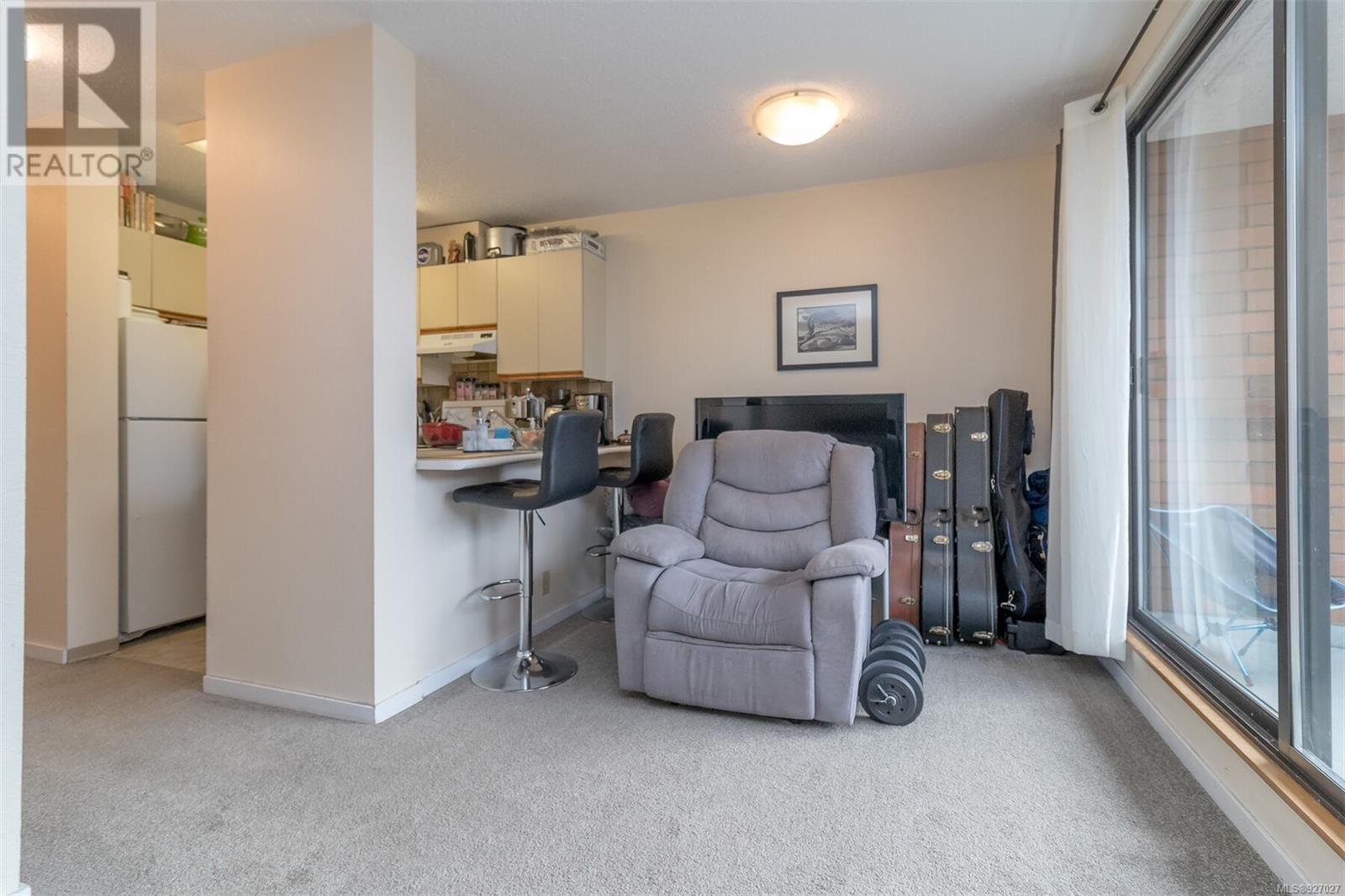 Welcome to the Sandpiper. A quiet steel and concrete building! This 1 bedroom corner unit is easy walking distance to the heart of Victoria. Newer carpeting throughout this bright and sunny condo. Breakfast bar and a spacious dining area with sliding doors leading to a SUPERIOR SOUTH facing covered balcony BONUS city and mountain views. This unit is airy and bright and comes with an open living / dining area that provides flexibility to creating your desired space. The building has common laundry, a fitness/spa room, and a reservable meeting room with view deck on the 11th floor. Close proximity to all amenities, Royal Athletic Park, Crystal Pool, downtown core, and the Save on Foods Arena. Approx 750 sq ft including the covered deck which is the perfect place to sit in the evening sun, such great value for a Victoria condo and attractive to investors / first time buyers / or down sizers! 97 Bike score - 93 transit score - 90 walk score. Wait list for parking but pay options close by. 97 Bike score - 93 transit score - 90 walk score. (id:22211)