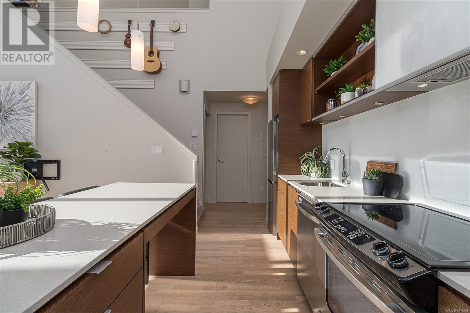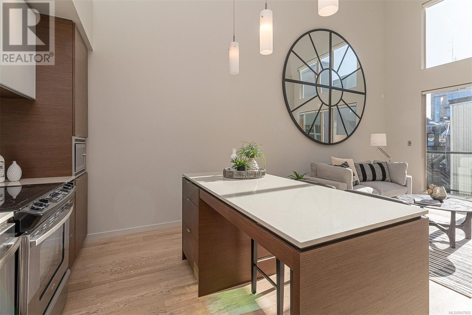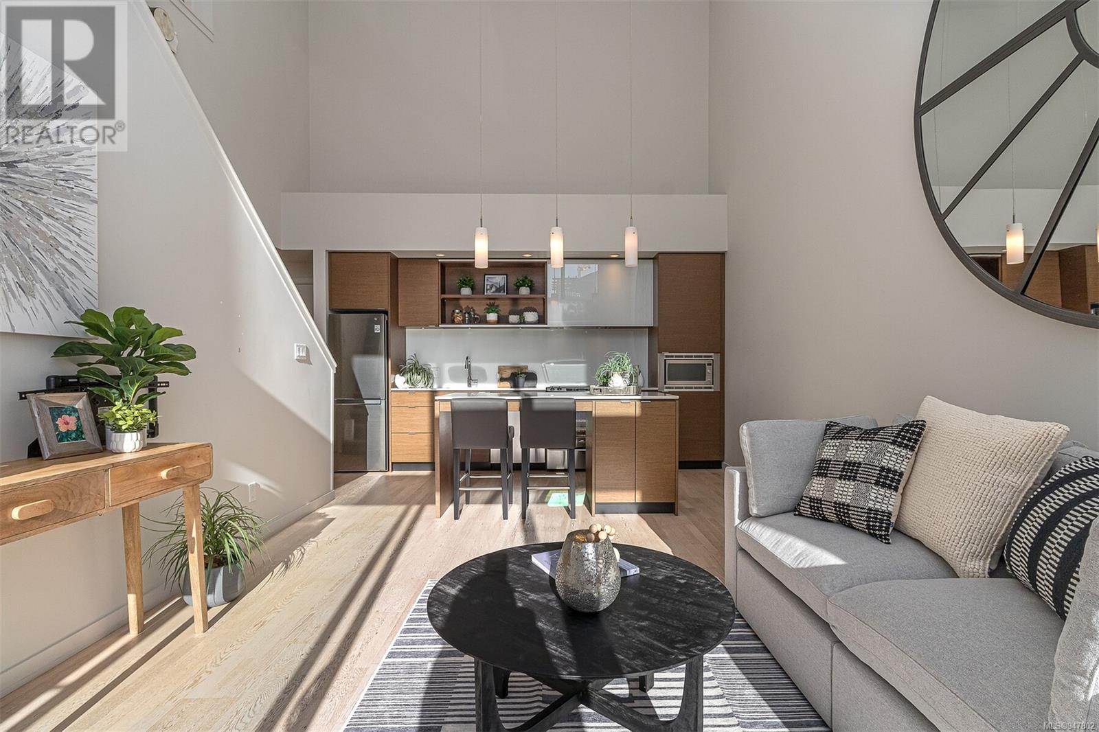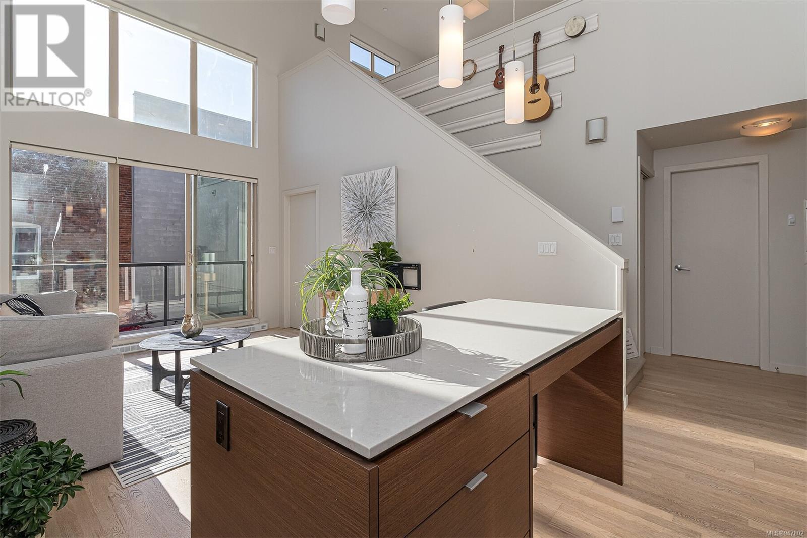Fabulous south facing 2 level loft in small boutique building in the Design District. With floor to ceiling windows this bright and open 2 bedroom, 2 bath home offers 943 sq ft on 2 levels, 19 ft vaulted ceiling, sleek and modern kitchen with quartz counter tops, large island with eating bar and stainless appliances. 2nd bedroom or office on main floor along with 4-piece guest bath and in suite laundry. Primary loft bedroom up and ensuite with walk in shower. Spacious balcony faces south overlooking the peaceful Zen garden. In suite storage under the stairs. Common bike storage area and secure underground parking. Rentals permitted. On the edge of Chinatown, this is a walk to wherever you want neighbourhood. Close to restaurants, shopping, the harbour or a short walk downtown. (id:22211)