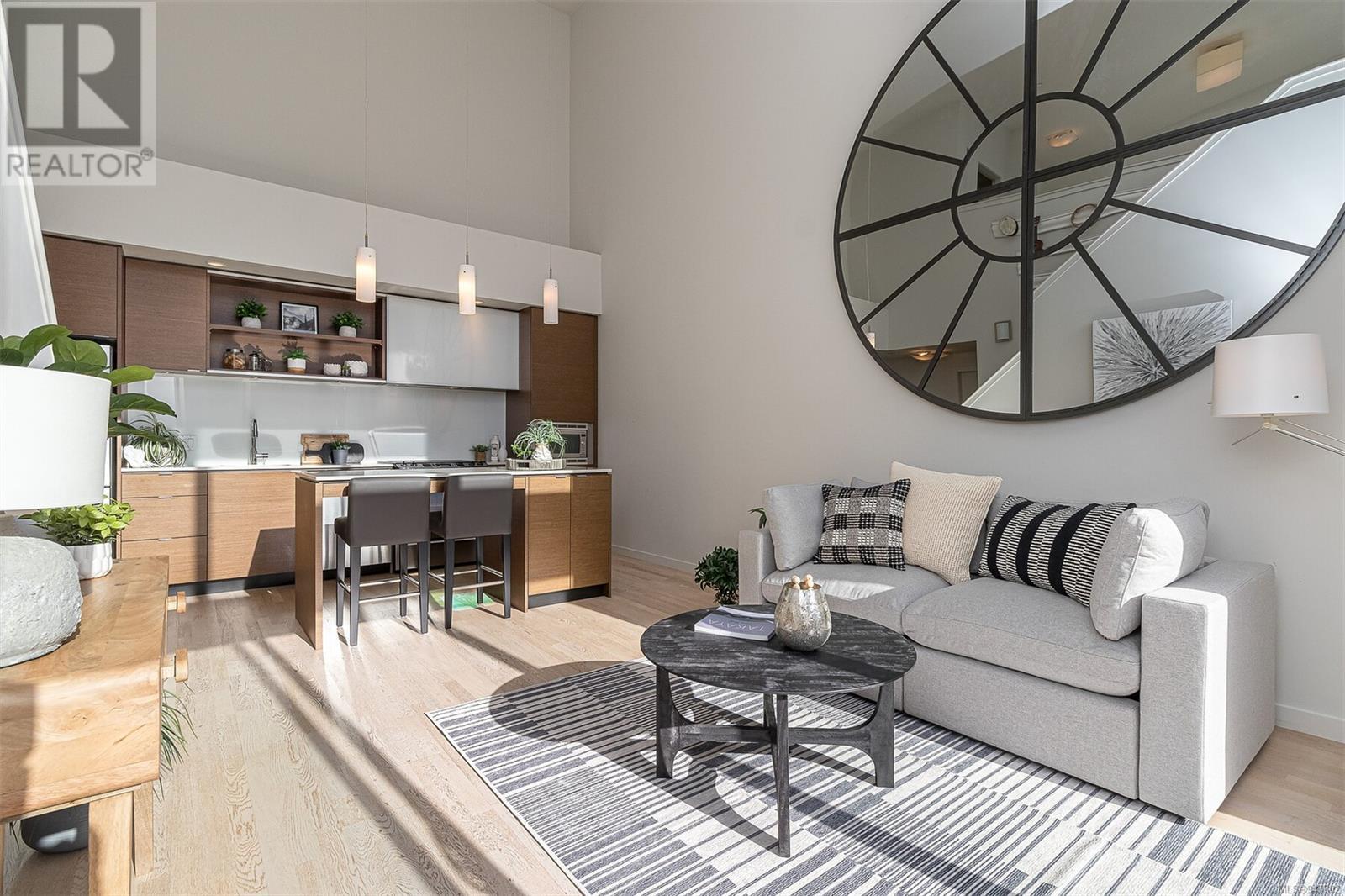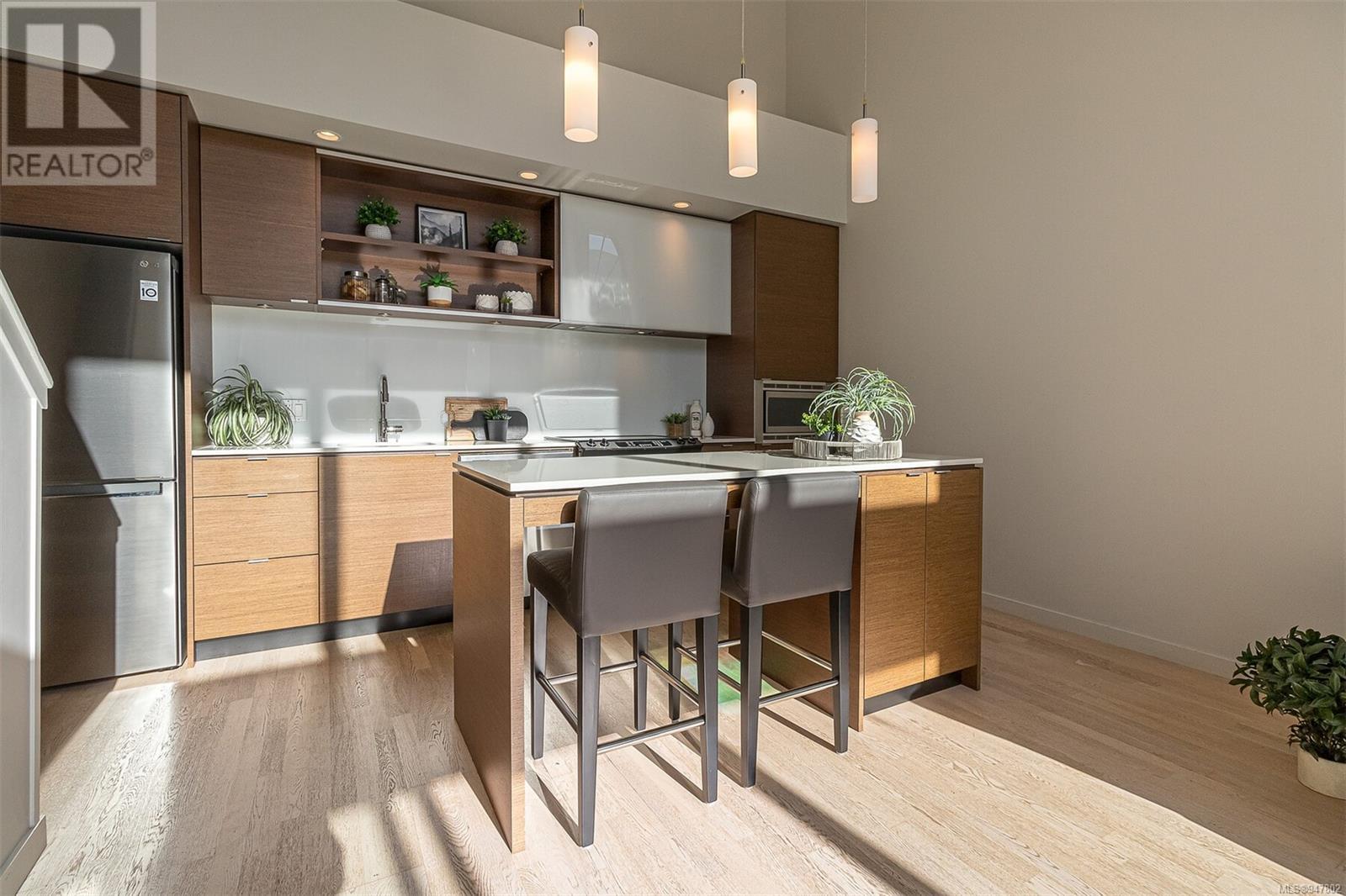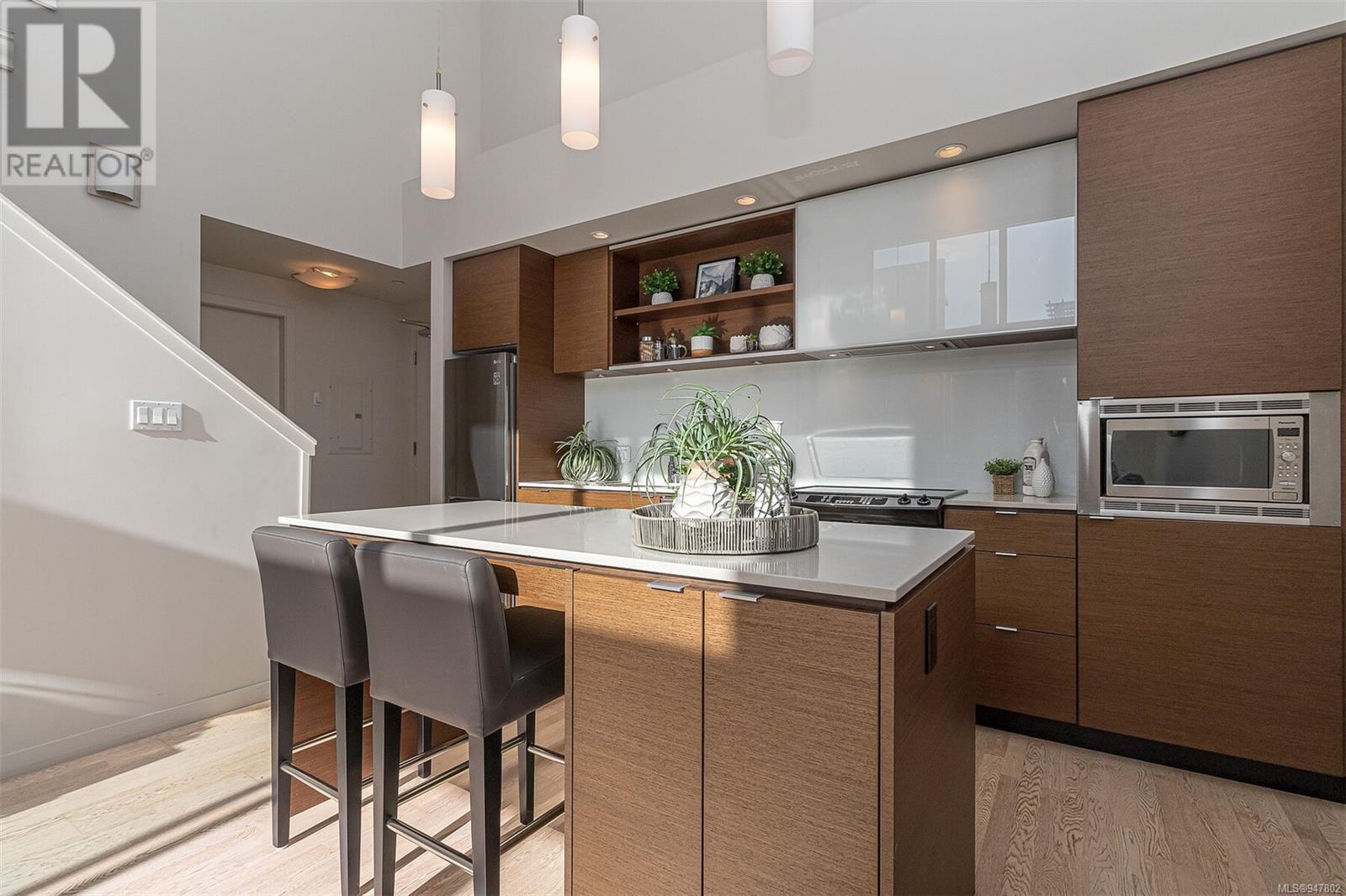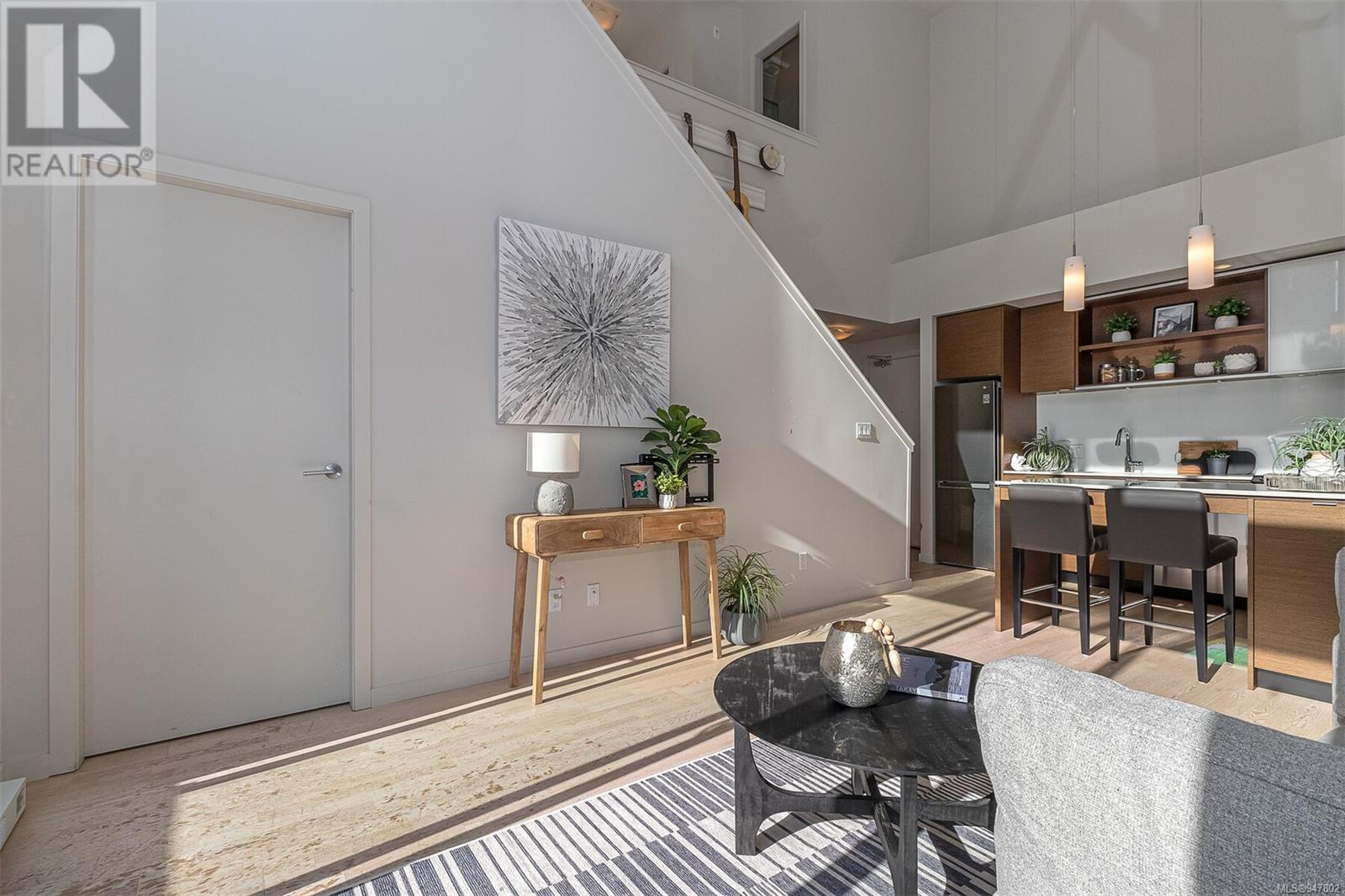 Fabulous south facing 2 level loft in small boutique building in the Design District. With floor to ceiling windows this bright and open 2 bedroom, 2 bath home offers 943 sq ft on 2 levels, 19 ft vaulted ceiling, sleek and modern kitchen with quartz counter tops, large island with eating bar and stainless appliances. 2nd bedroom or office on main floor along with 4-piece guest bath and in suite laundry. Primary loft bedroom up and ensuite with walk in shower. Spacious balcony faces south overlooking the peaceful Zen garden. In suite storage under the stairs. Common bike storage area and secure underground parking. Rentals permitted. On the edge of Chinatown, this is a walk to wherever you want neighbourhood. Close to restaurants, shopping, the harbour or a short walk downtown. (id:22211)