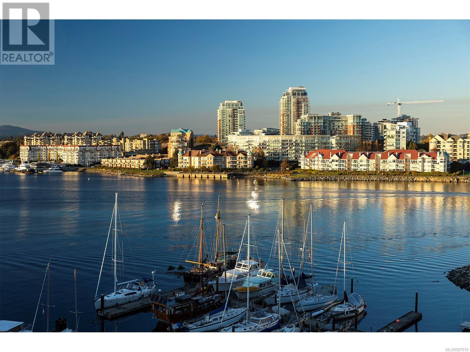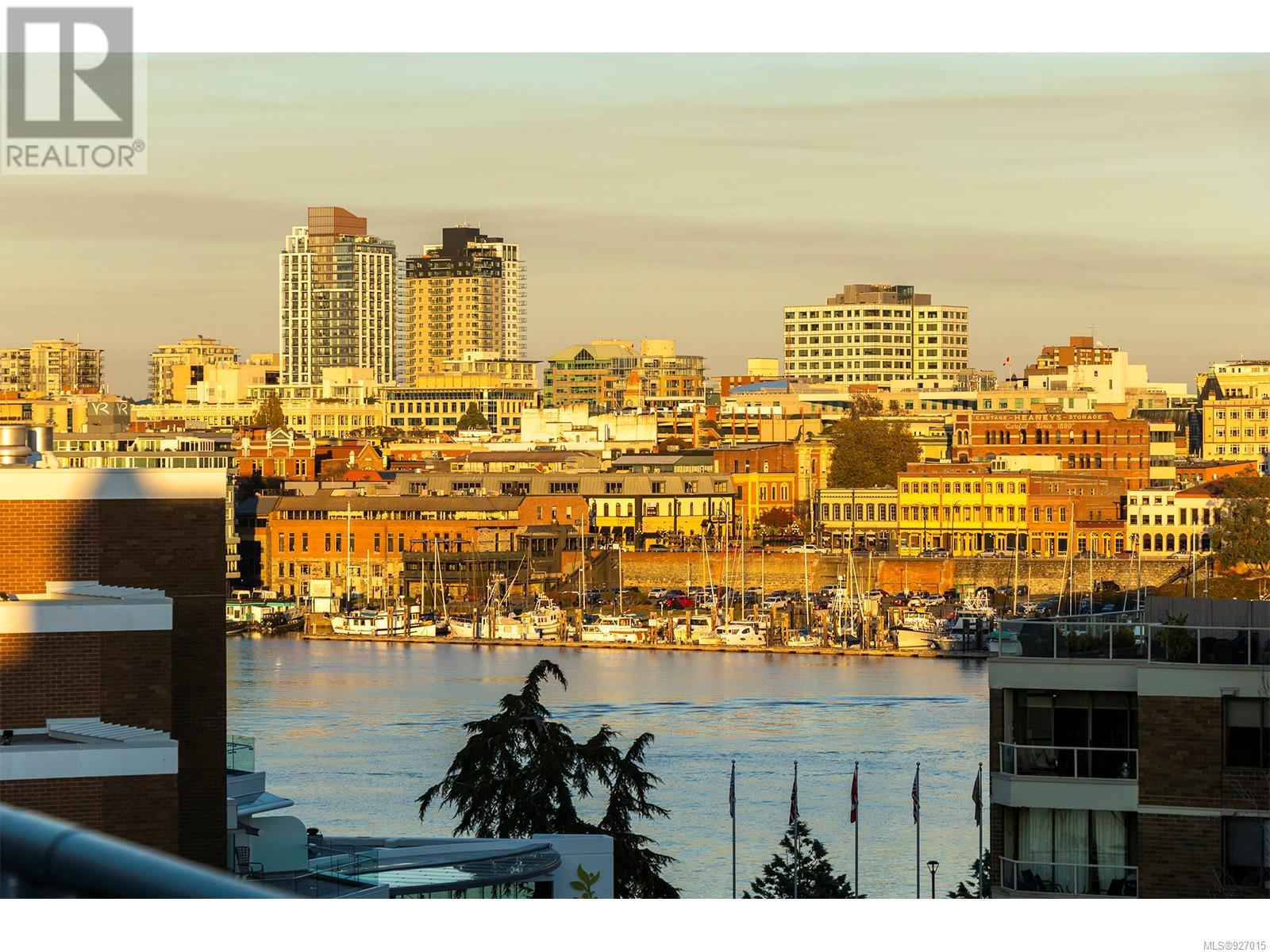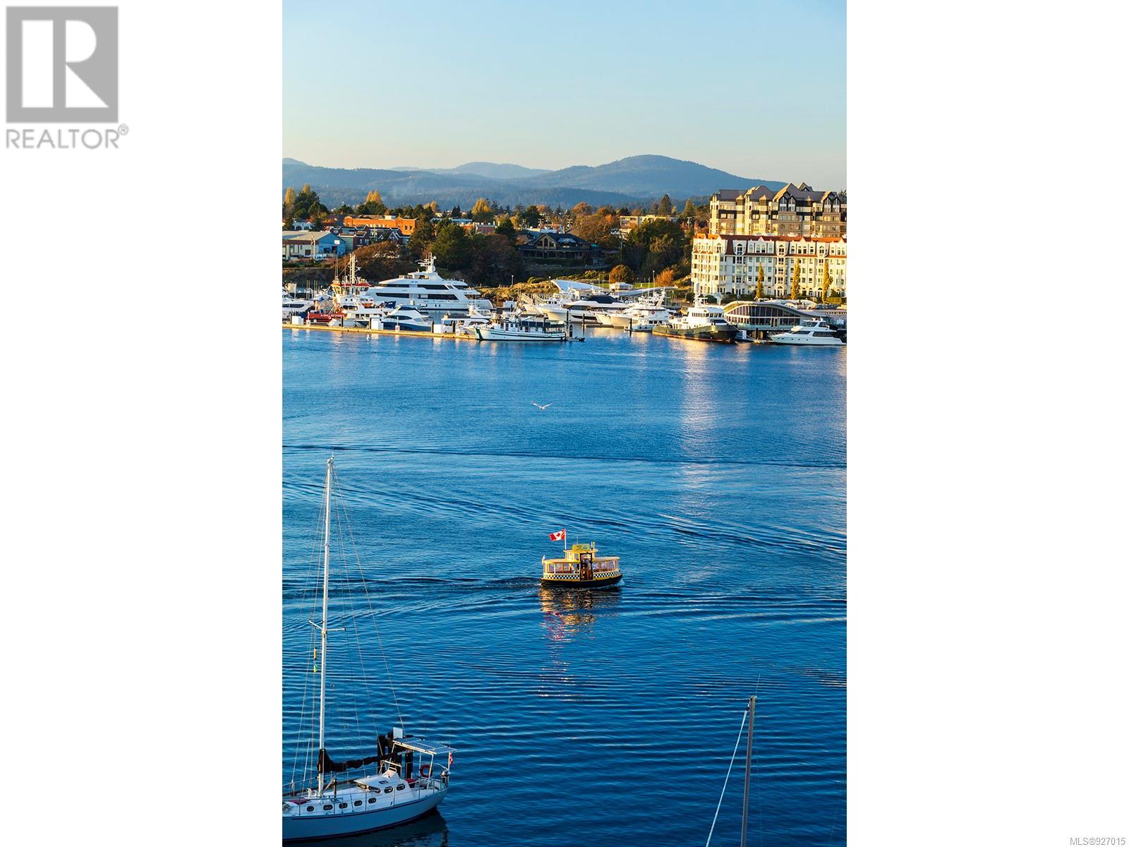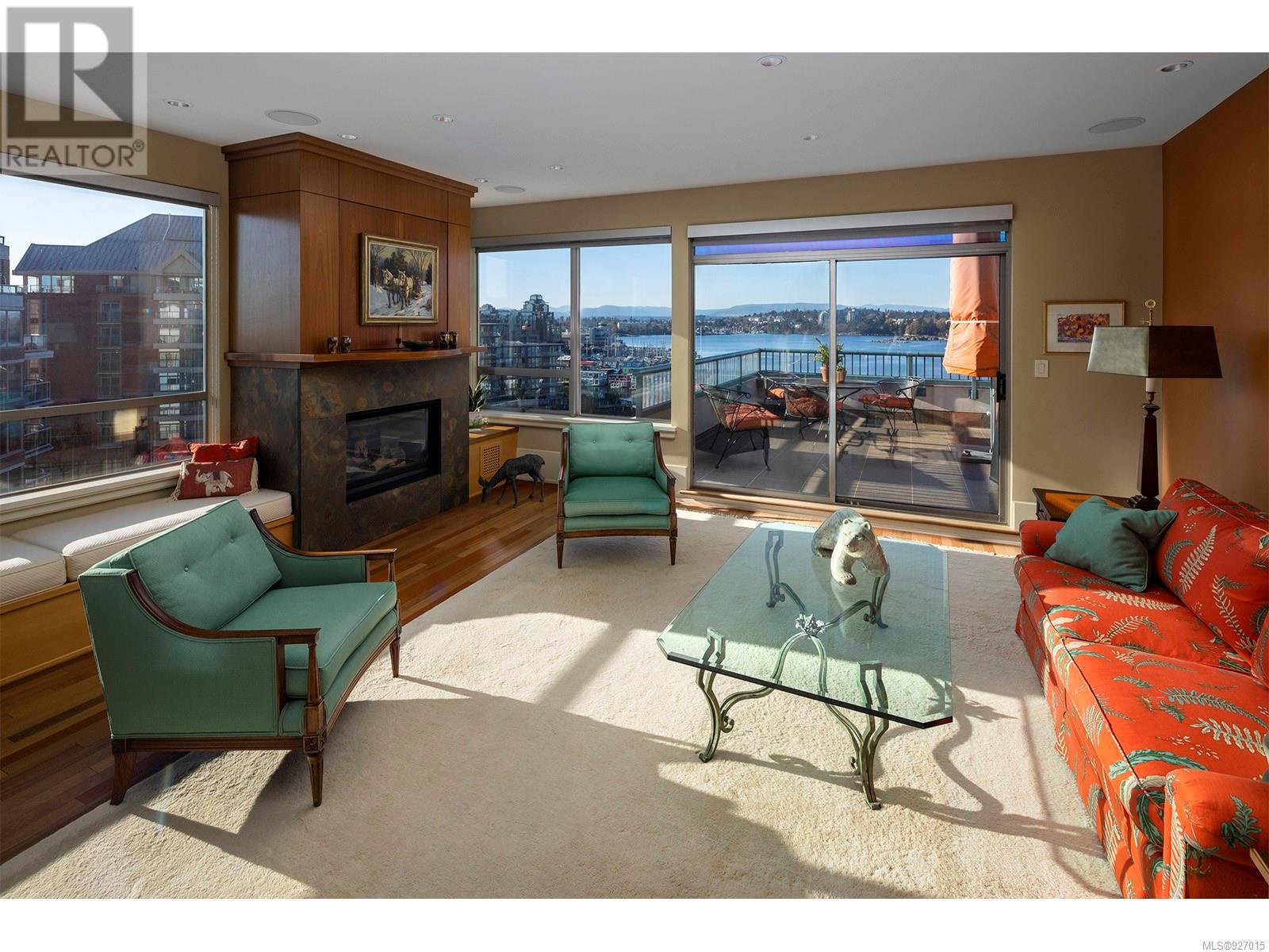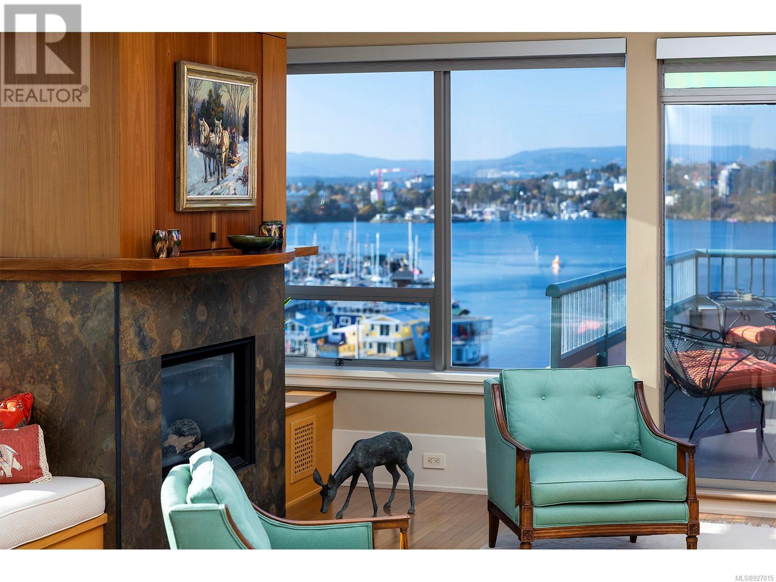 Timeless elegance on Victoria’s famed Inner Harbour. This rare waterfront penthouse condominium with incredible ocean views offers 2 bedrooms plus a den, 3 bathrooms and over 3000 square feet of indoor and outdoor living space. The open concept kitchen with custom artisanal glass slab countertops is a chef’s dream with Wolfe stovetop, oven and warming drawer, Bosch dishwasher and KitchenAid fridge. An abundance of millwork and custom cabinetry, solid wood Craftsman inspired doors, sapele mahogany flooring and heated natural stone floors in the bathrooms add to the overall aesthetic of this exquisite home. Relax in your spacious primary suite with its stunning 14’ barrel ceiling or enjoy al fresco dining on one of your 4 private patios. Steel and concrete building, 2 parking stalls and well-run strata. Ideal location is an easy stroll to shops, parks, groceries, restaurants and downtown Victoria. (id:22211)