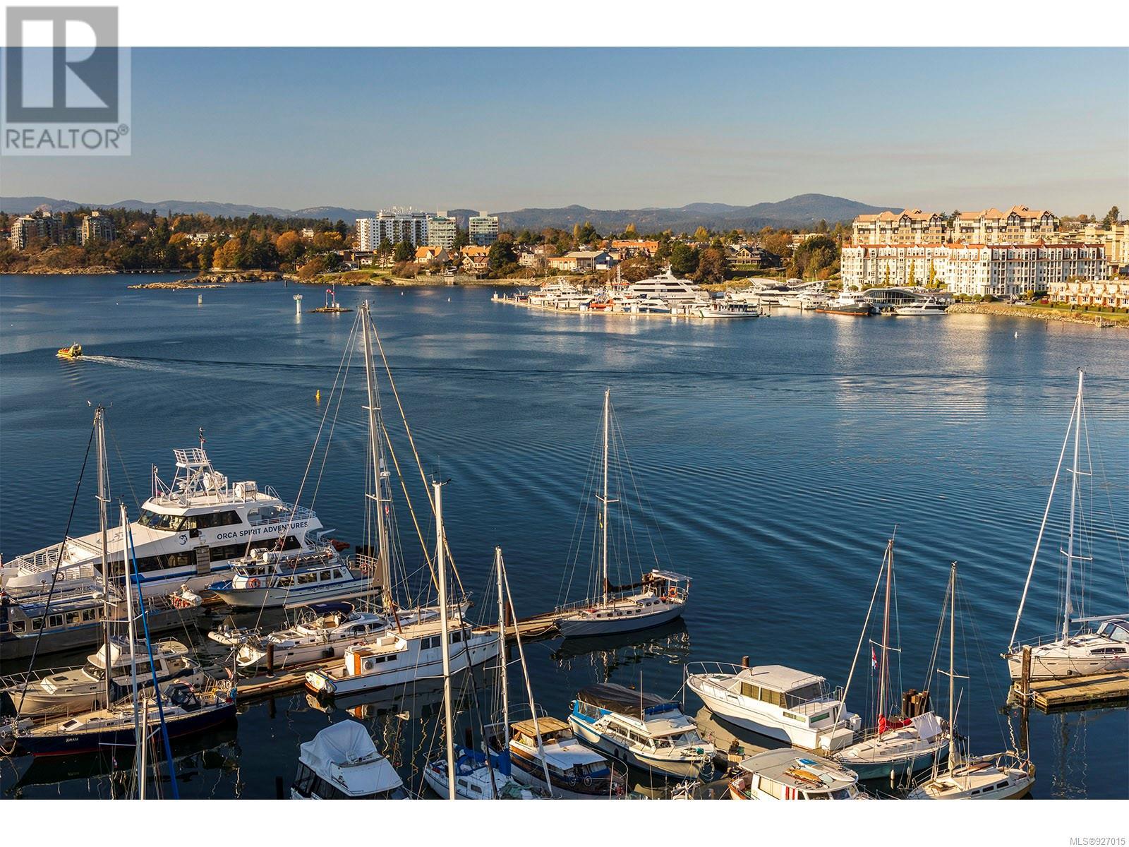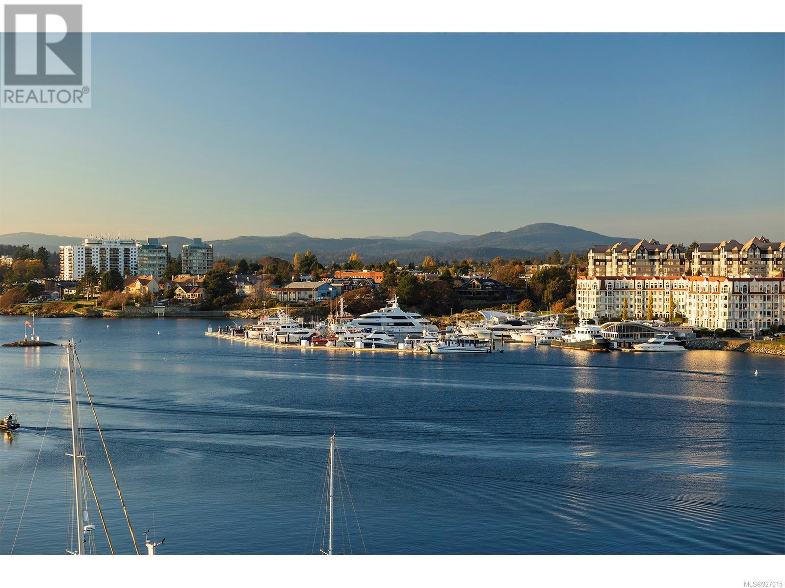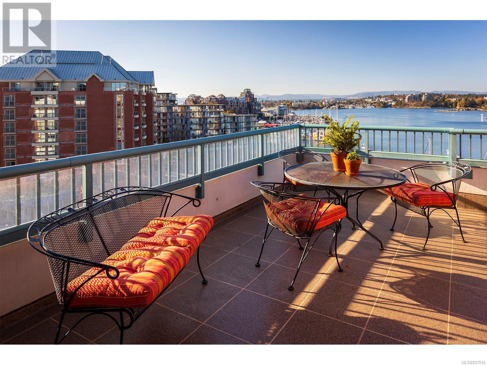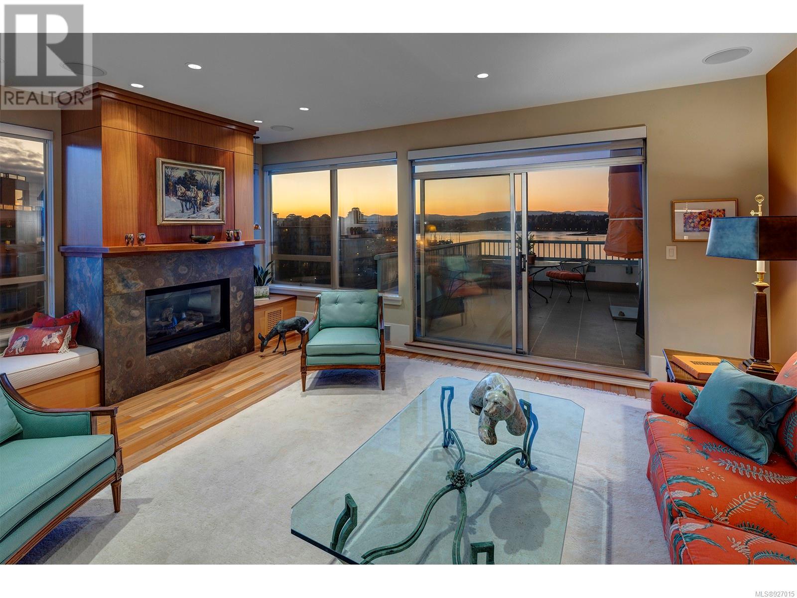 Timeless elegance on Victoria’s famed Inner Harbour. This rare waterfront penthouse condominium with incredible ocean views offers 2 bedrooms plus a den, 3 bathrooms and over 3000 square feet of indoor and outdoor living space. The open concept kitchen with custom artisanal glass slab countertops is a chef’s dream with Wolfe stovetop, oven and warming drawer, Bosch dishwasher and KitchenAid fridge. An abundance of millwork and custom cabinetry, solid wood Craftsman inspired doors, sapele mahogany flooring and heated natural stone floors in the bathrooms add to the overall aesthetic of this exquisite home. Relax in your spacious primary suite with its stunning 14’ barrel ceiling or enjoy al fresco dining on one of your 4 private patios. Steel and concrete building, 2 parking stalls and well-run strata. Ideal location is an easy stroll to shops, parks, groceries, restaurants and downtown Victoria. (id:22211)