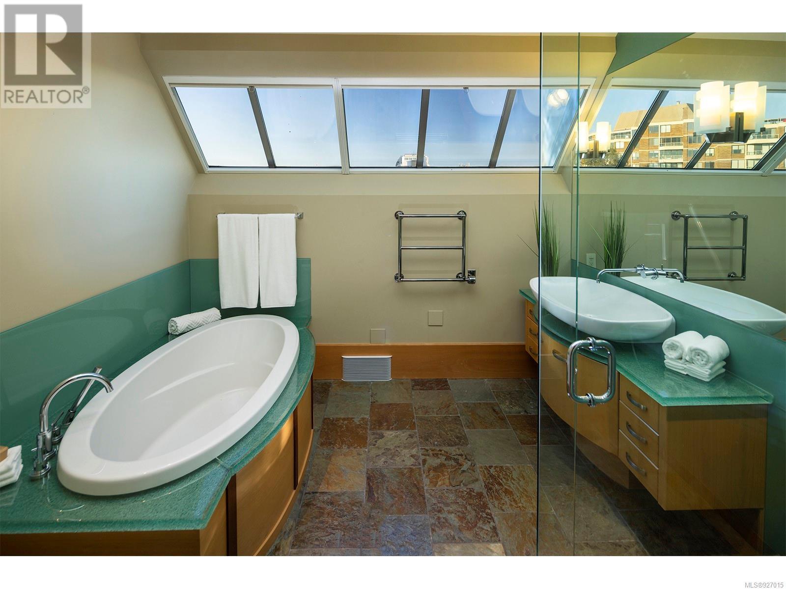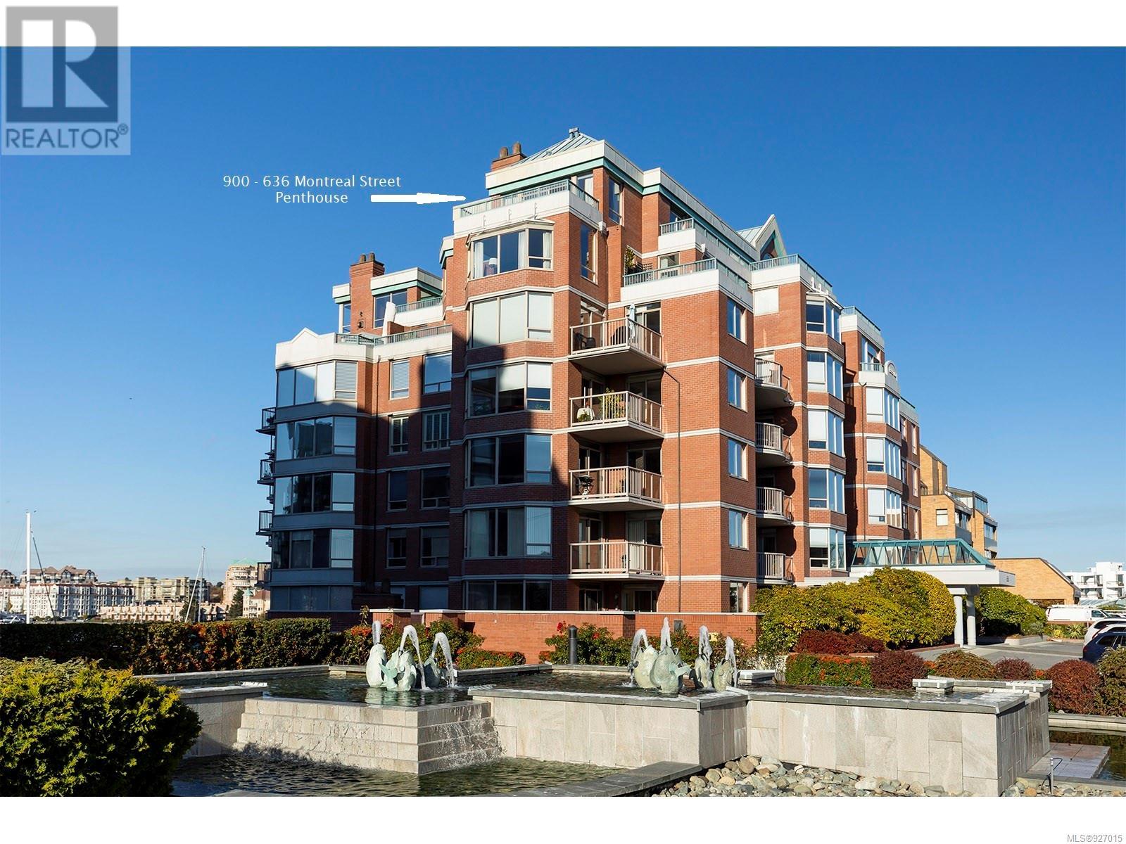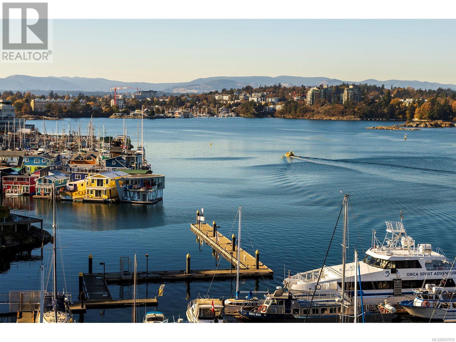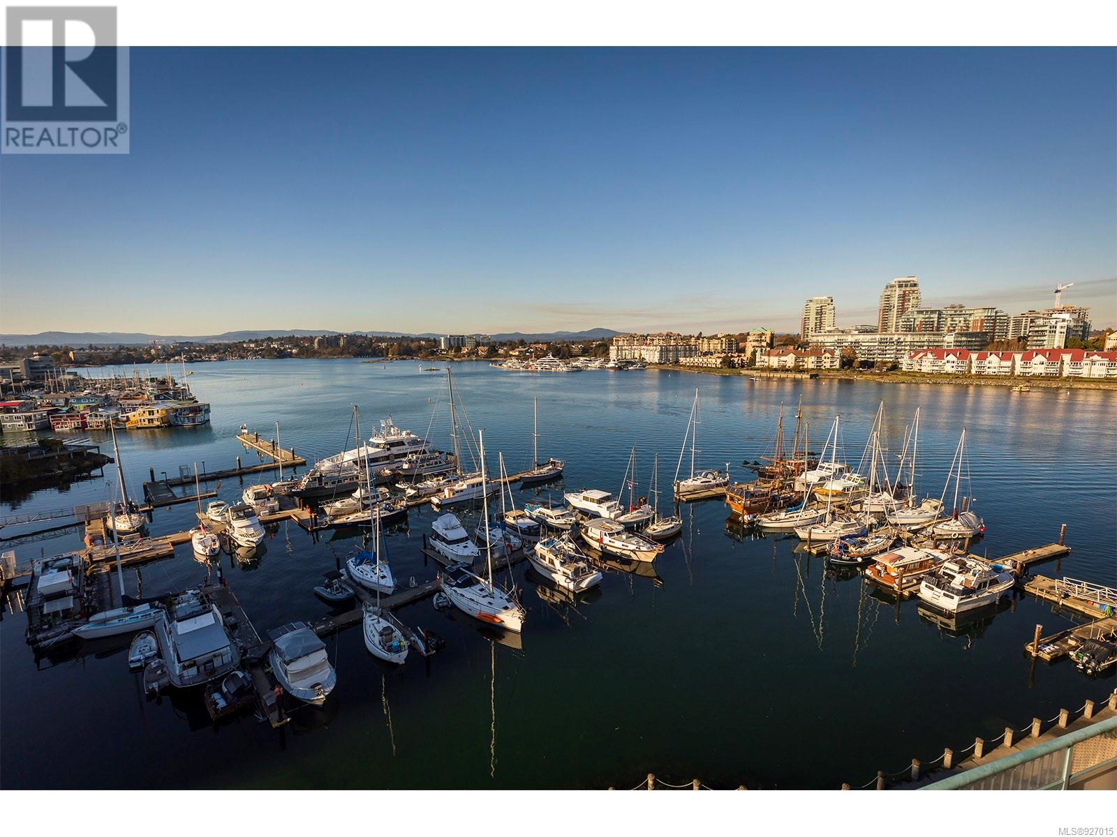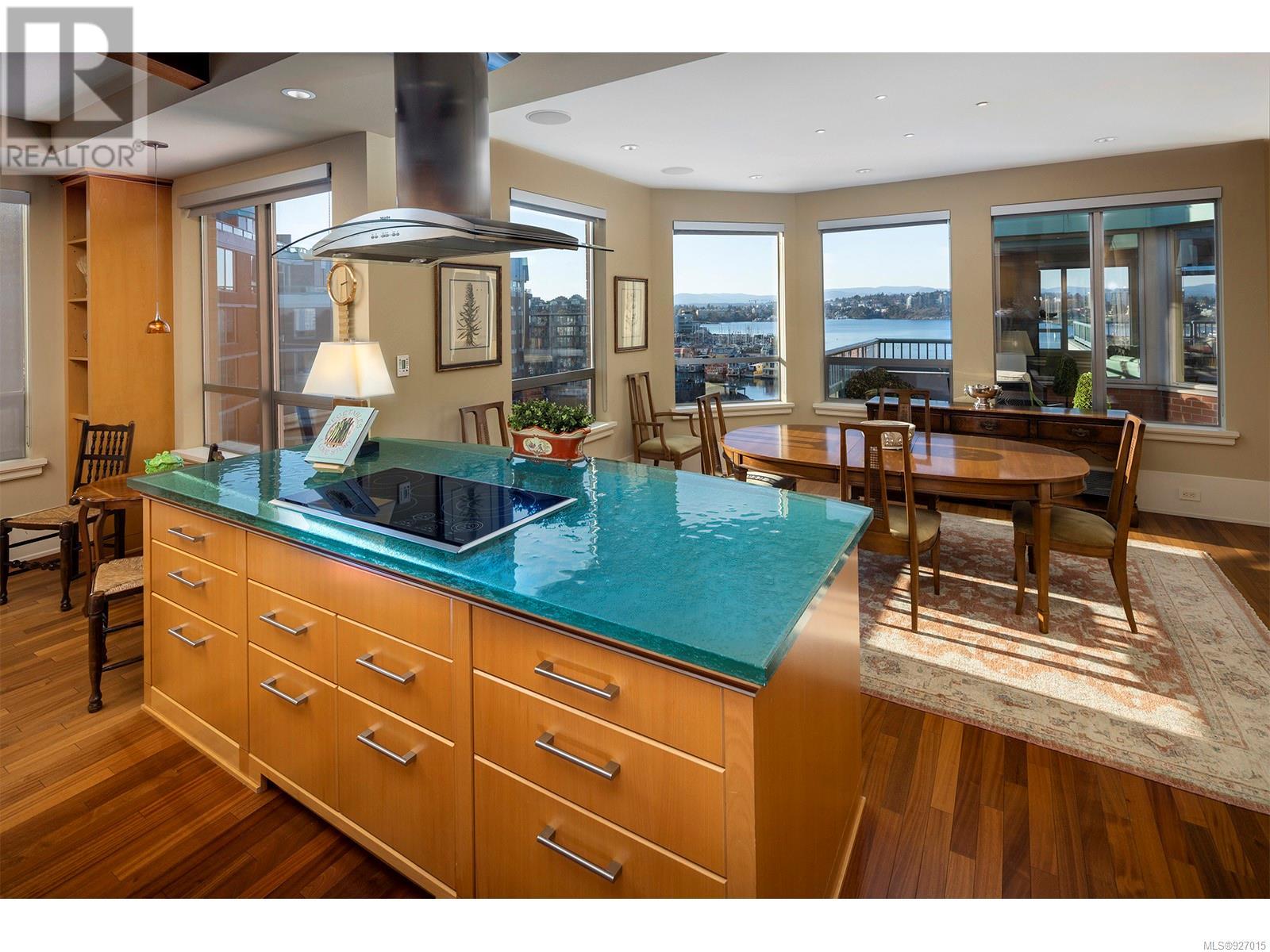 Timeless elegance on Victoria’s famed Inner Harbour. This rare waterfront penthouse condominium with incredible ocean views offers 2 bedrooms plus a den, 3 bathrooms and over 3000 square feet of indoor and outdoor living space. The open concept kitchen with custom artisanal glass slab countertops is a chef’s dream with Wolfe stovetop, oven and warming drawer, Bosch dishwasher and KitchenAid fridge. An abundance of millwork and custom cabinetry, solid wood Craftsman inspired doors, sapele mahogany flooring and heated natural stone floors in the bathrooms add to the overall aesthetic of this exquisite home. Relax in your spacious primary suite with its stunning 14’ barrel ceiling or enjoy al fresco dining on one of your 4 private patios. Steel and concrete building, 2 parking stalls and well-run strata. Ideal location is an easy stroll to shops, parks, groceries, restaurants and downtown Victoria. (id:22211)