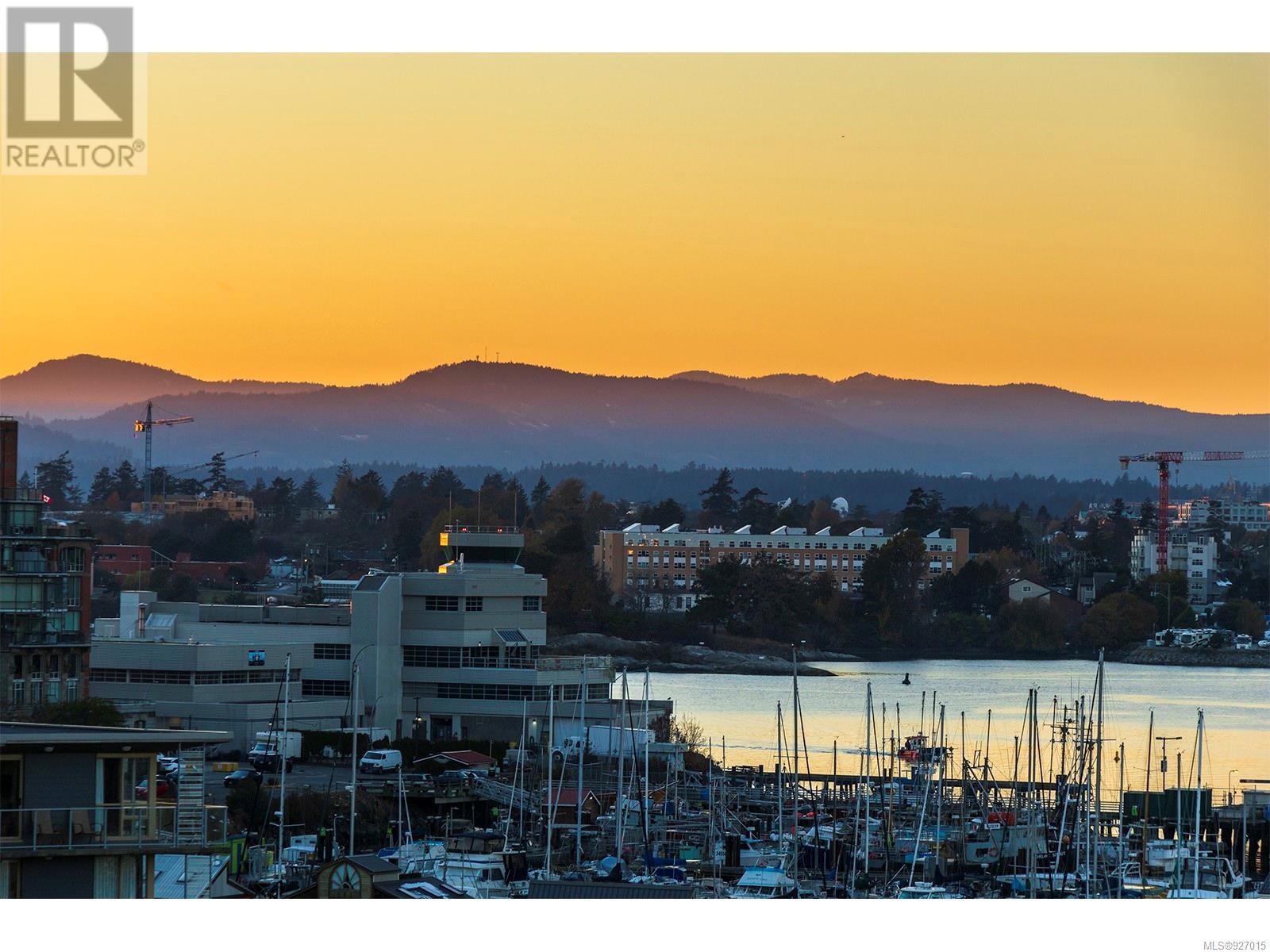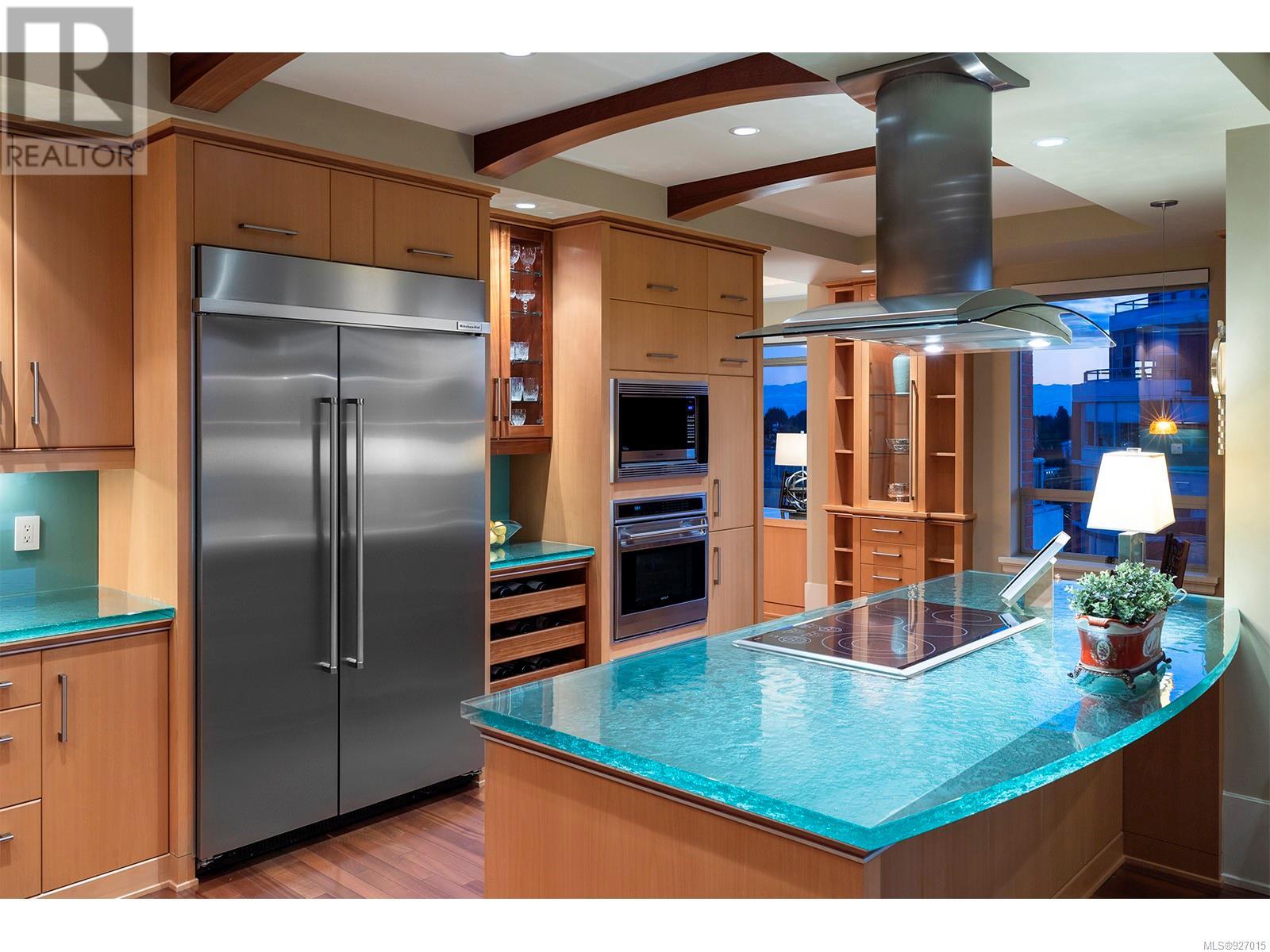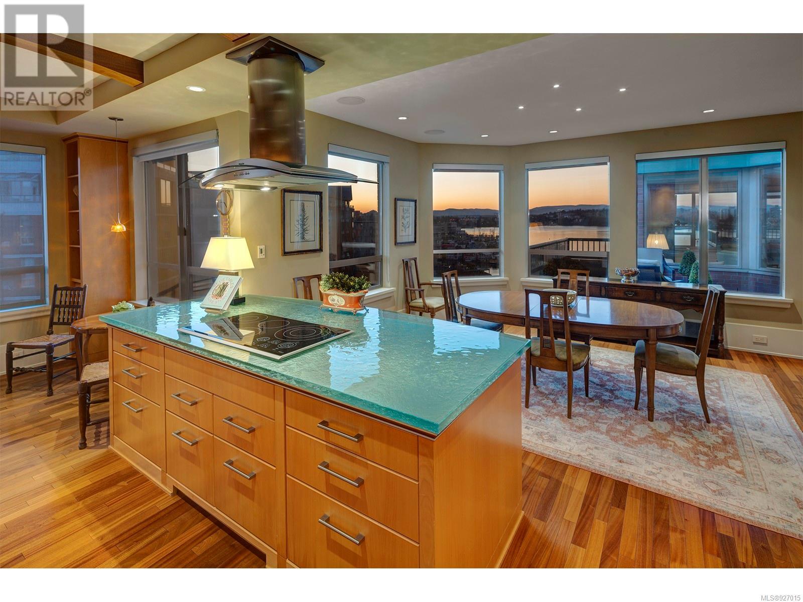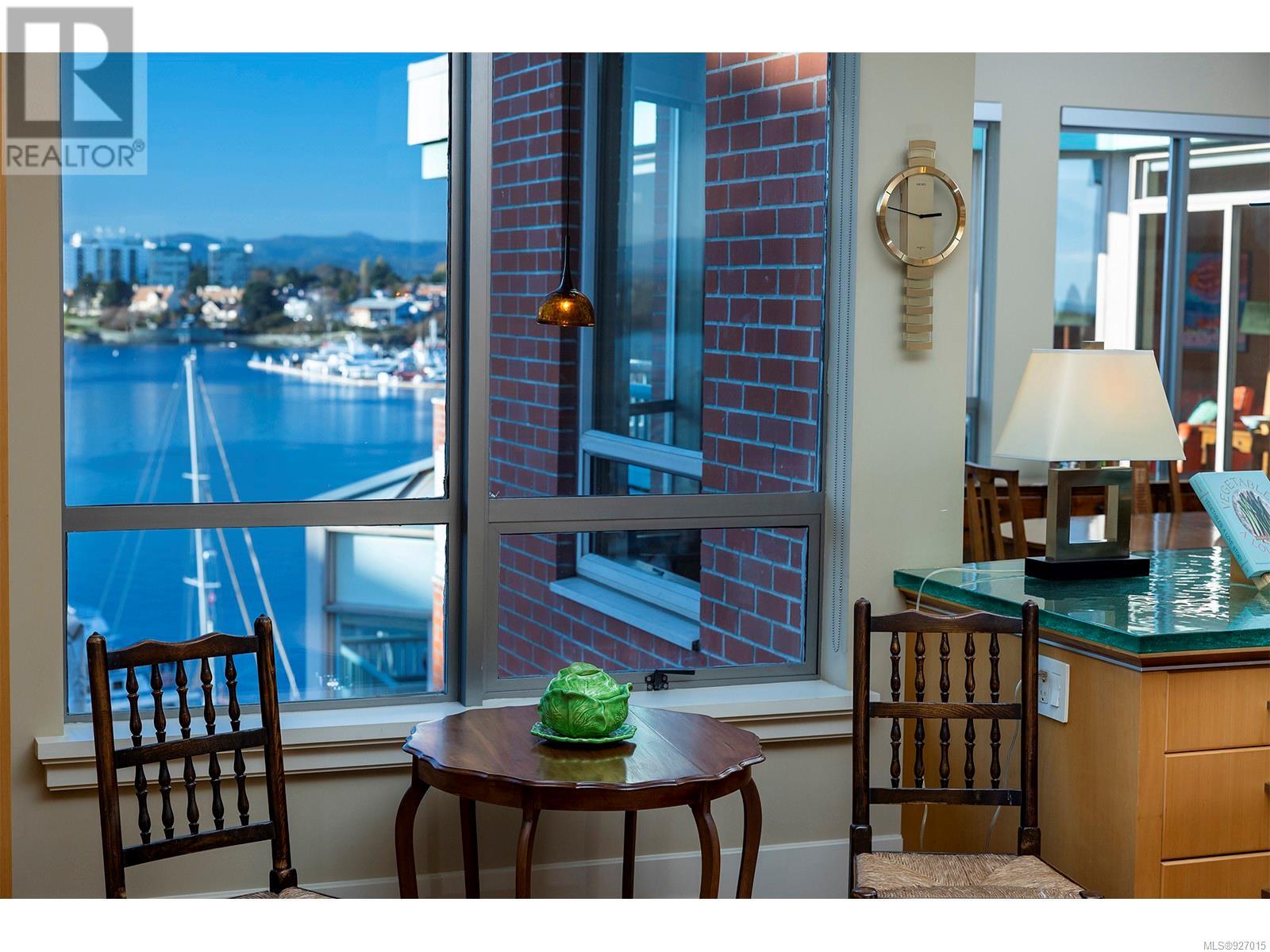 Timeless elegance on Victoria’s famed Inner Harbour. This rare waterfront penthouse condominium with incredible ocean views offers 2 bedrooms plus a den, 3 bathrooms and over 3000 square feet of indoor and outdoor living space. The open concept kitchen with custom artisanal glass slab countertops is a chef’s dream with Wolfe stovetop, oven and warming drawer, Bosch dishwasher and KitchenAid fridge. An abundance of millwork and custom cabinetry, solid wood Craftsman inspired doors, sapele mahogany flooring and heated natural stone floors in the bathrooms add to the overall aesthetic of this exquisite home. Relax in your spacious primary suite with its stunning 14’ barrel ceiling or enjoy al fresco dining on one of your 4 private patios. Steel and concrete building, 2 parking stalls and well-run strata. Ideal location is an easy stroll to shops, parks, groceries, restaurants and downtown Victoria. (id:22211)